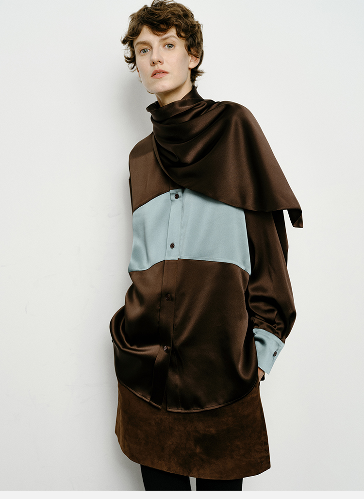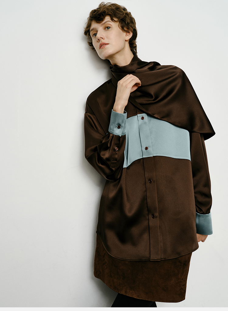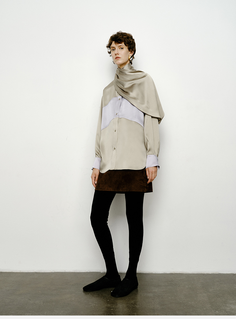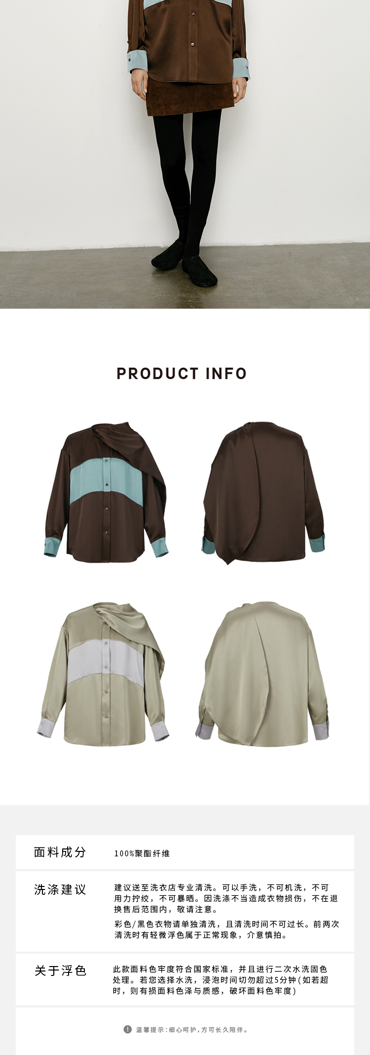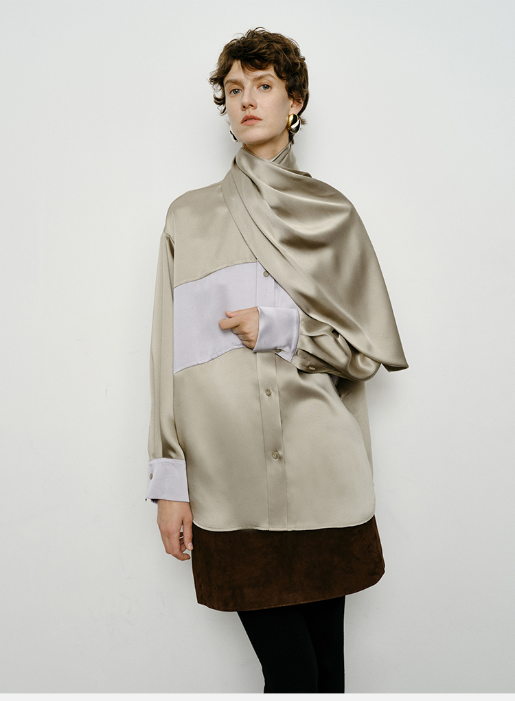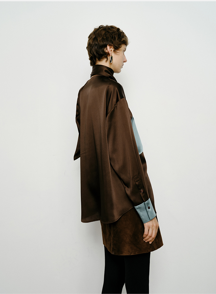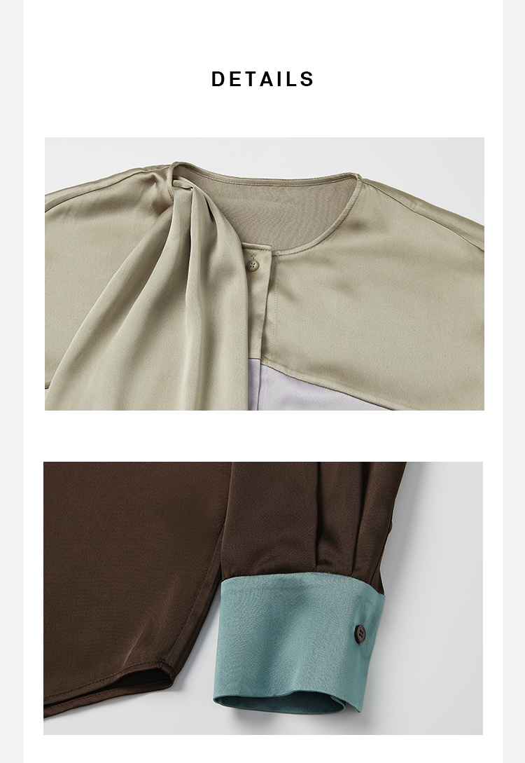 HIDEMI 艺术感缎面拼接撞色可拆卸丝巾衬衫 棕蓝色/绿紫色