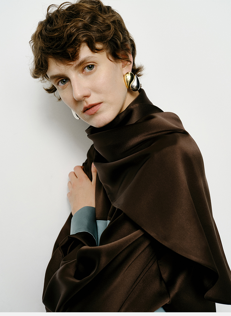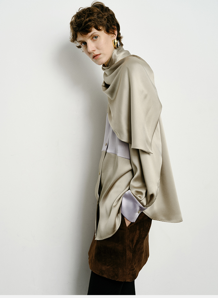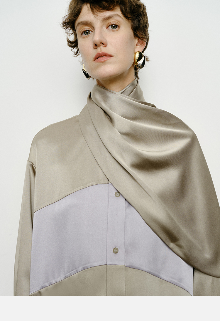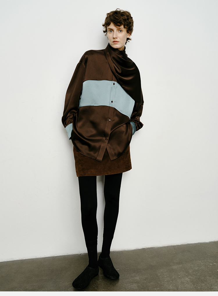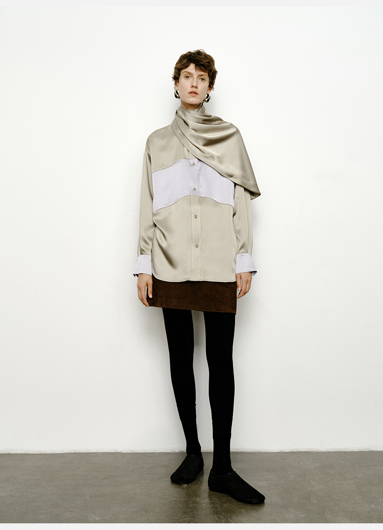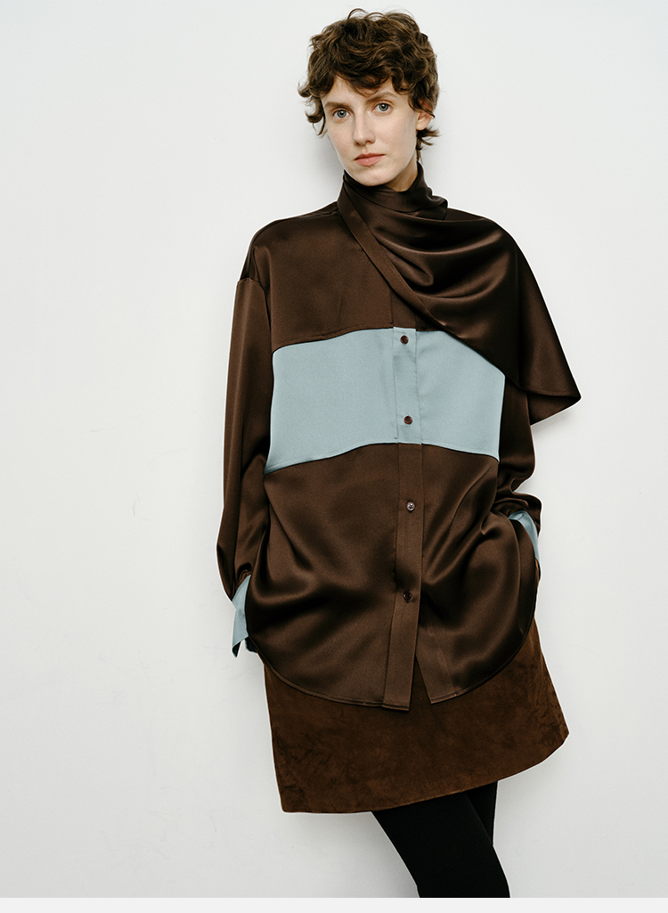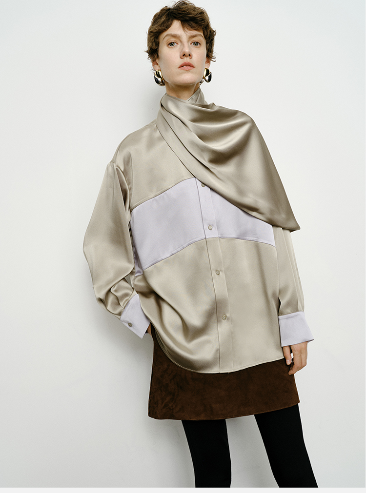 HIDEMI 艺术感缎面拼接撞色可拆卸丝巾衬衫 棕蓝色/绿紫色