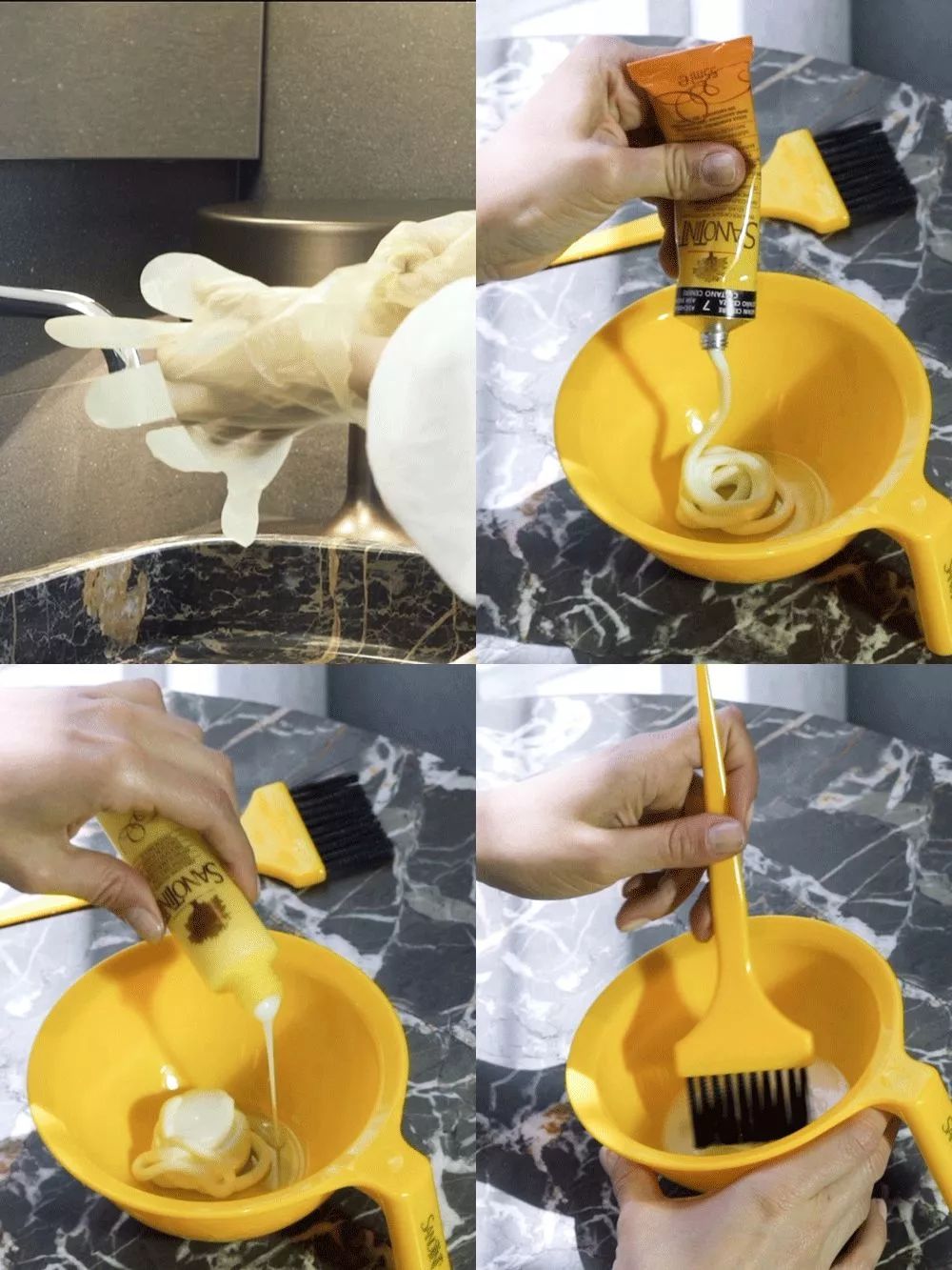 大家先准备好保鲜膜、染发碗、刷子和吹风机或电热帽。然后将颜色剂和锁色剂按1:1的比例挤入碗内搅拌均匀。