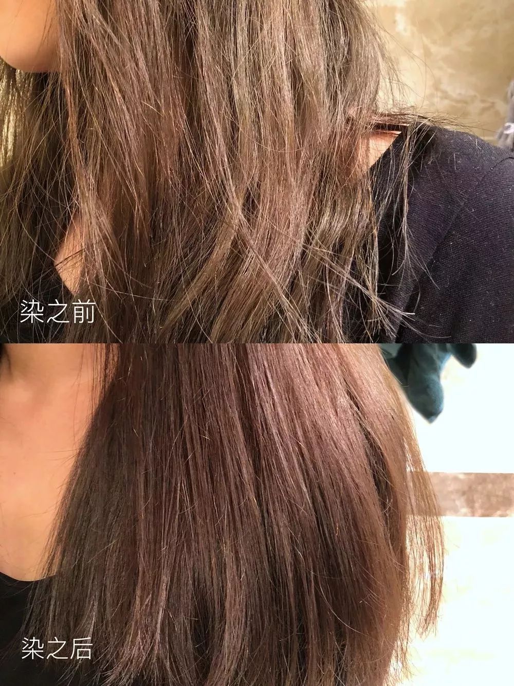 它没有刺激性气味,不仅不伤头发,染完还会感觉发质变好了。大家看看染发前和染发后的对比,染完发质真的明显改善好多,变得顺滑又有光泽。