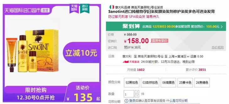 Sanotint植物染发剂的价格每盒原价是168元,某猫聚划算时每盒是135元(还要再加税)