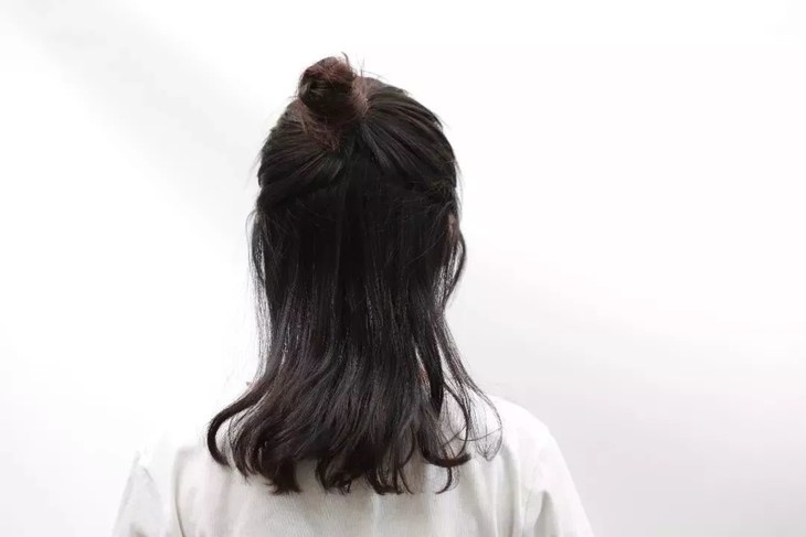 然后把头发盘在头顶用保鲜膜封起来。中间可以用吹风机适量加热,如果有电热帽效果更好。