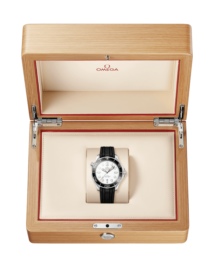 这款42毫米腕表采用精钢打造而成,配备饰以白色珐琅潜水刻度的黑色陶瓷表圈。抛光白色陶瓷表盘饰以激光雕刻波纹图案以及红色高亮显示“Seamaster”字样。