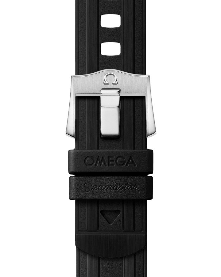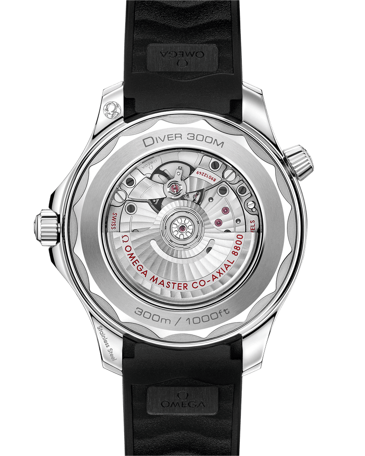 腕表搭配一体式黑色橡胶表带,内部搭载欧米茄8800至臻天文台机芯,透过采用波纹边缘设计的蓝宝石玻璃表背,机芯运转美态清晰可见。