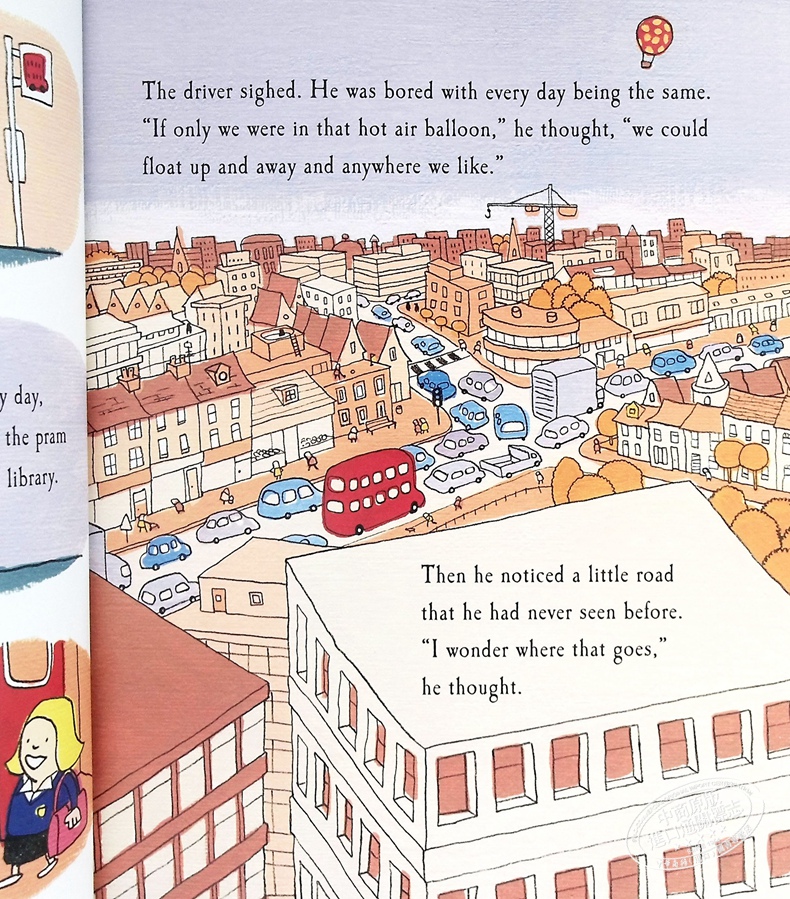 Every day, the bus driver finishes his cup of tea, puts on his jacket and sets off on his route. Every day, the man with the big red tie gets on at the roundabout, the lady with the pram gets on at the library and the noisy children get on at Clover Drive.