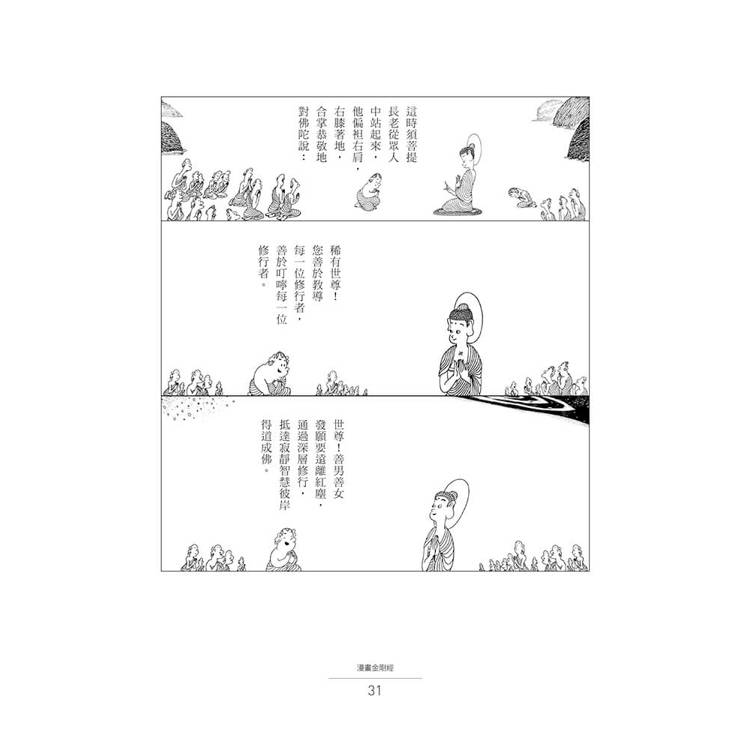 曾經不得其門而入的人,如今有了另一種入門的方式:蔡志忠以多年參閱佛書所領略的禪意,描繪出佛陀與眾弟子各種姿態,以及山石樹木的意境。將原本的深奧經文轉為易讀的白話文,搭配漫畫情境,讓佛陀與須菩提的問答顯得靈動傳神,每一句、每一張圖都各有其自在與妙意,幫助現代人一窺金剛經的法門,體悟心靈的安頓與智慧的啟迪。