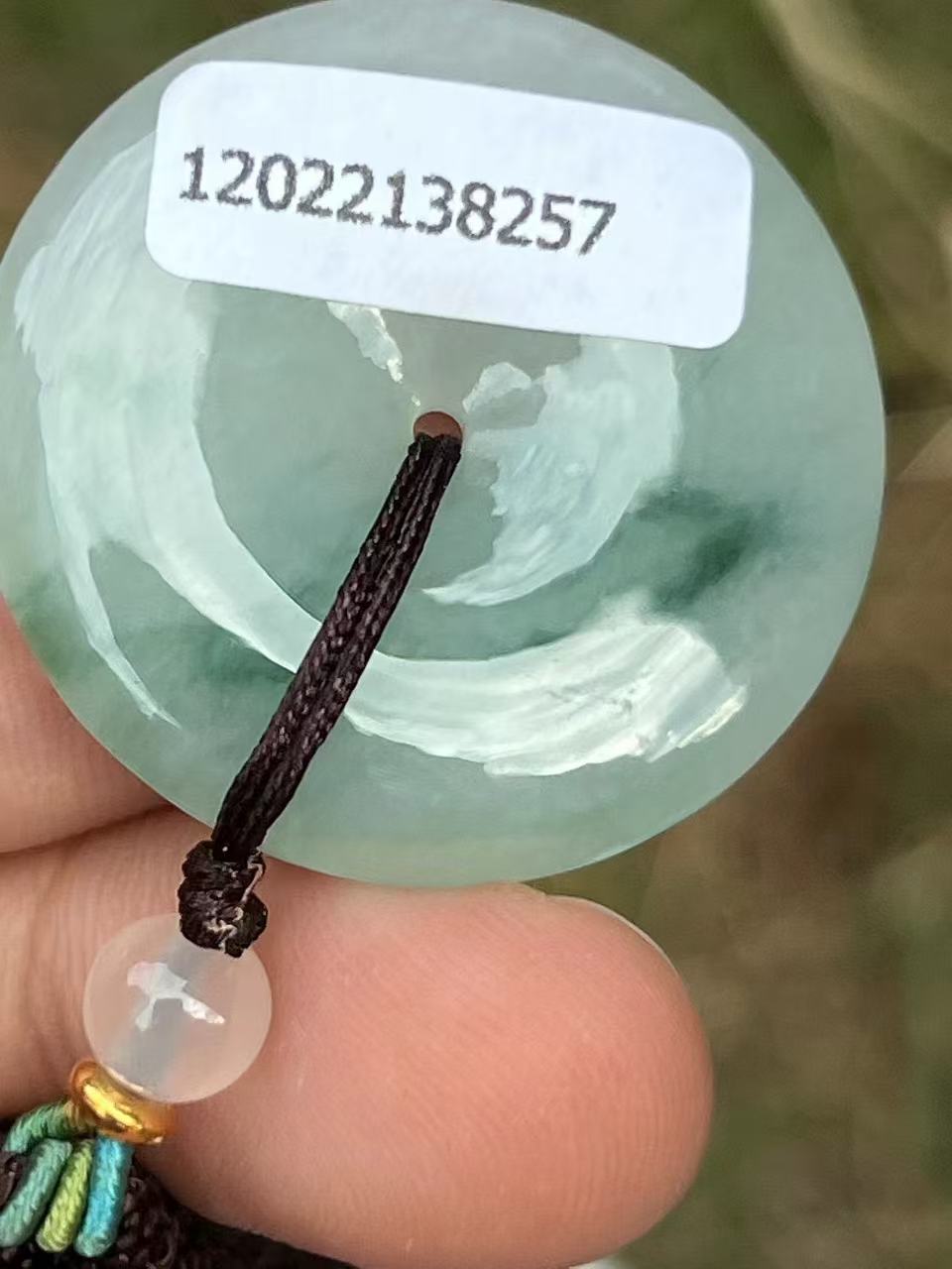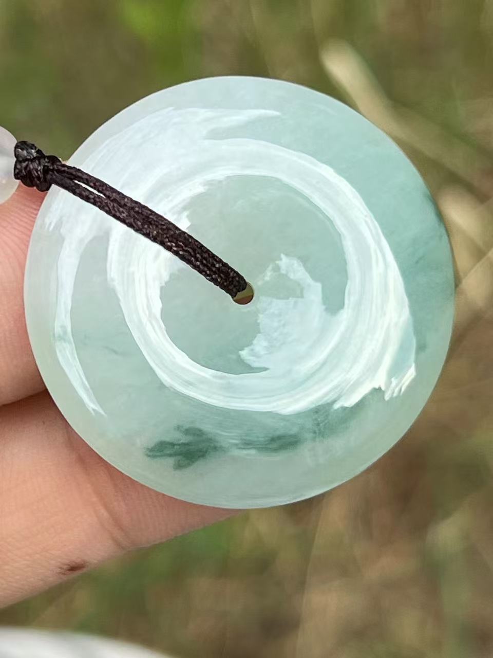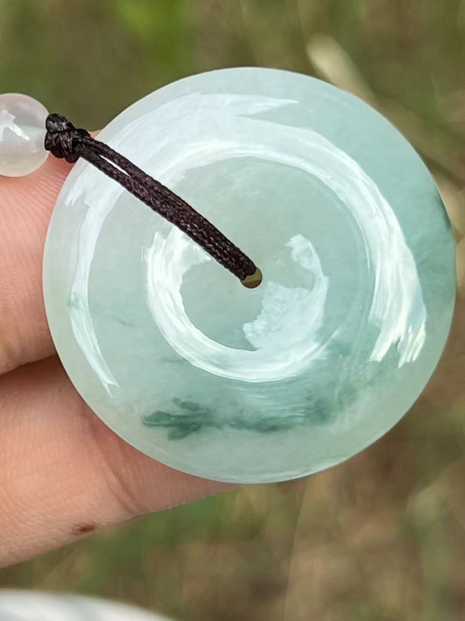 天然A货翡翠,冰润底子澄澈如水,幽幽兰花翩然绽放,似墨韵染宣,清雅自成。手工精雕平安扣,形如满月,佩之温润生香。每一缕飘花都是时光的笔触,戴一份文人风骨,藏一世平安喜乐。