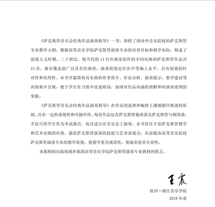《萨克斯管音乐会经典作品演奏指导2》了涵盖浪漫主义时期、二十世纪现当代作曲家创作的、不同风格的萨克斯管经典作品共8。不仅可供学生作为平时考试曲目,而且更适合在音乐会上演奏,旨在丰富萨克斯管教学和艺术实践的内容,加强萨克斯管演奏的技能与艺术表现力,从而提高高等音乐学院萨克斯管演奏专业的教学质量,使教学更具规范性,使演奏更具专业性。