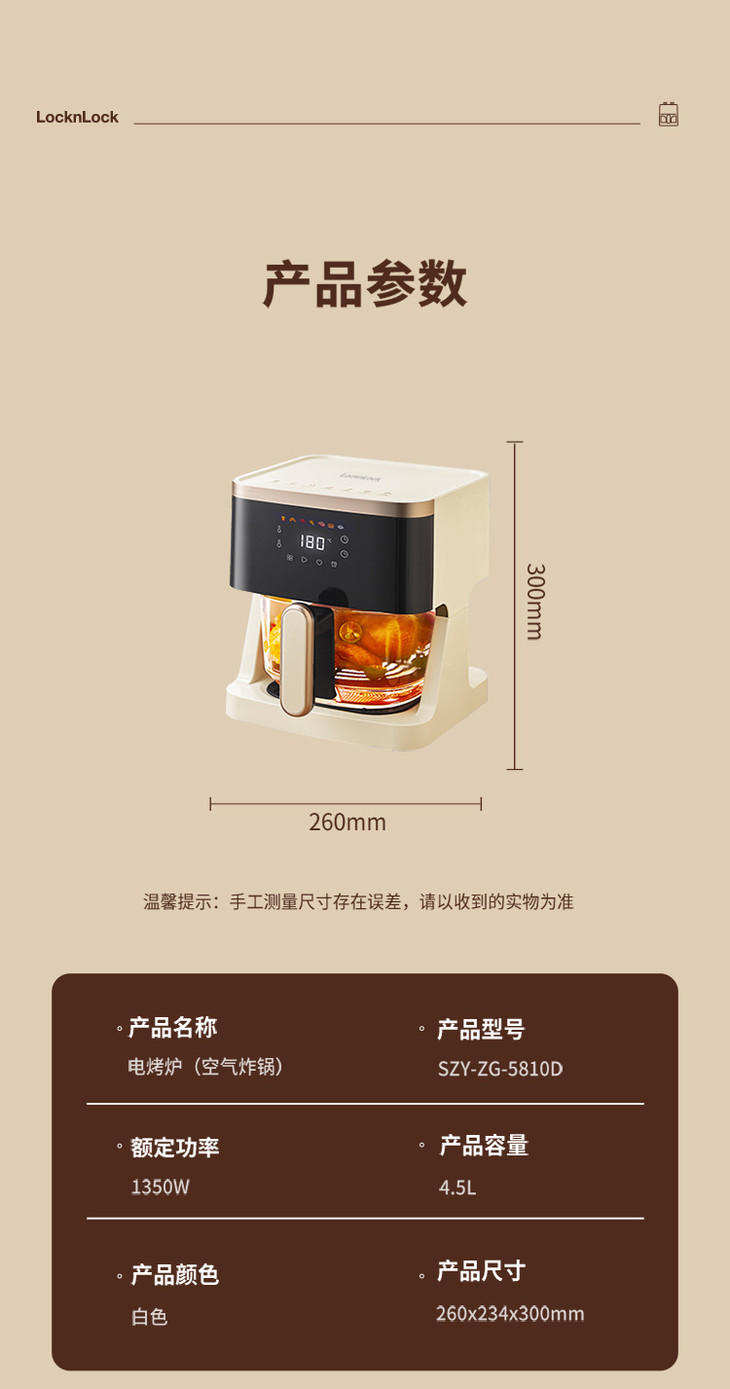 产品名称:电烤炉(空气炸锅) 型号: SZY-ZG-5810D 电子款 额定功率:1350W 产品容量:4.5L 产品尺寸:260x234x300mm