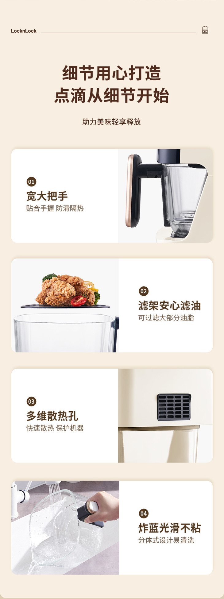 细节满满 宽大把手:贴合手握 防滑隔热 滤架安心滤油:可过滤大部分油脂 多维散热孔;快速散热 保护机器 炸蓝光滑不粘;分体式设计易清洗