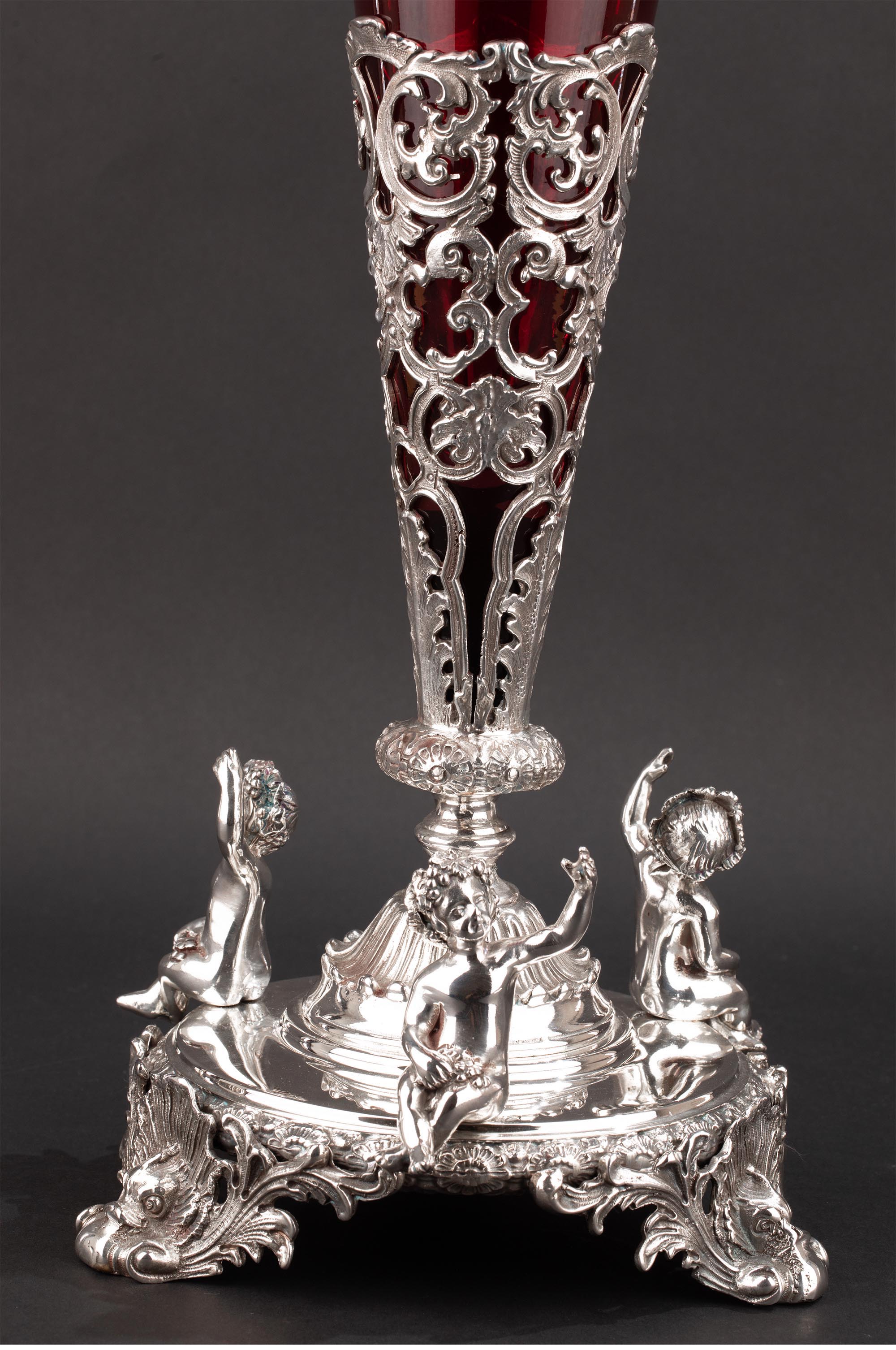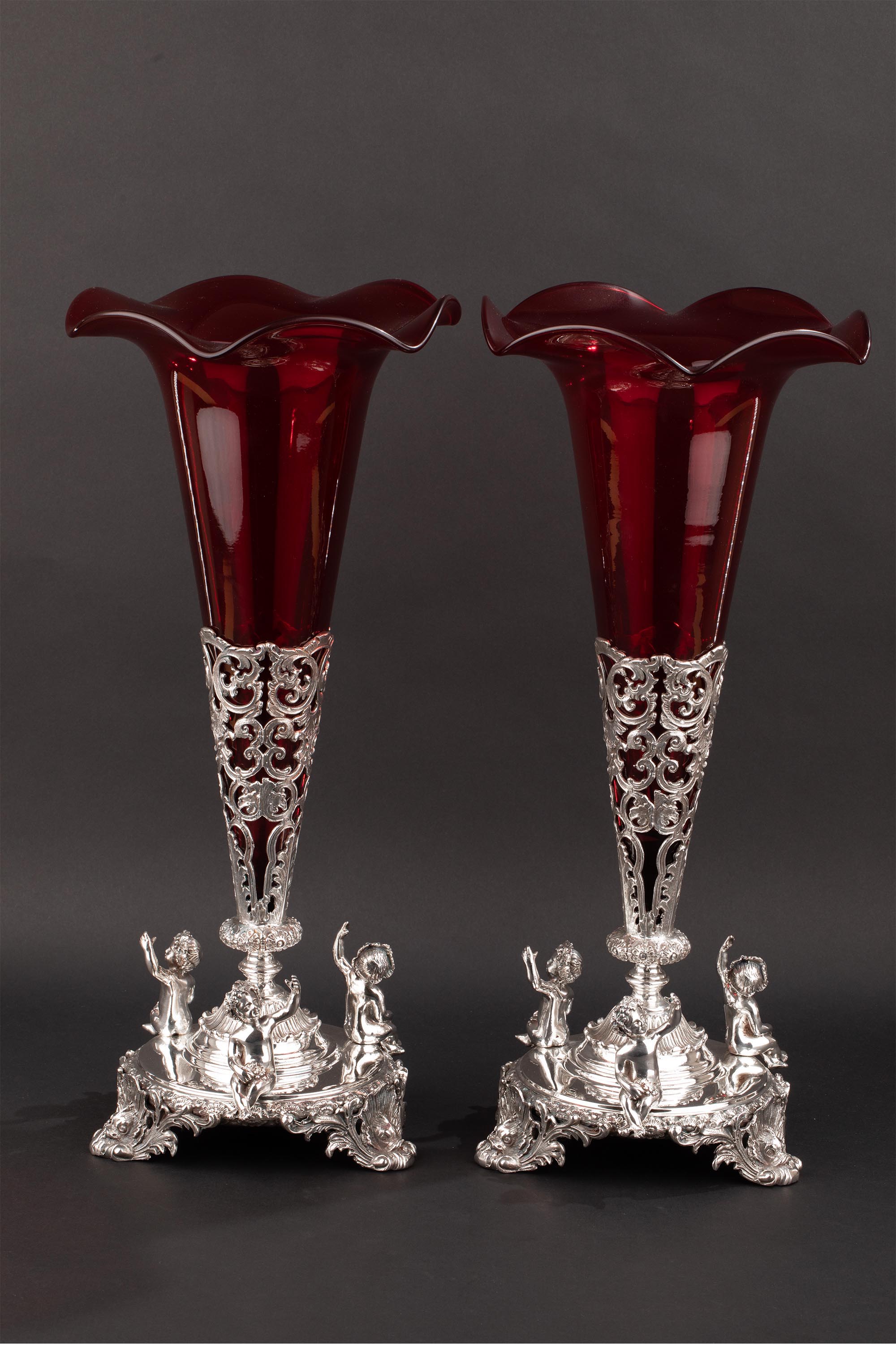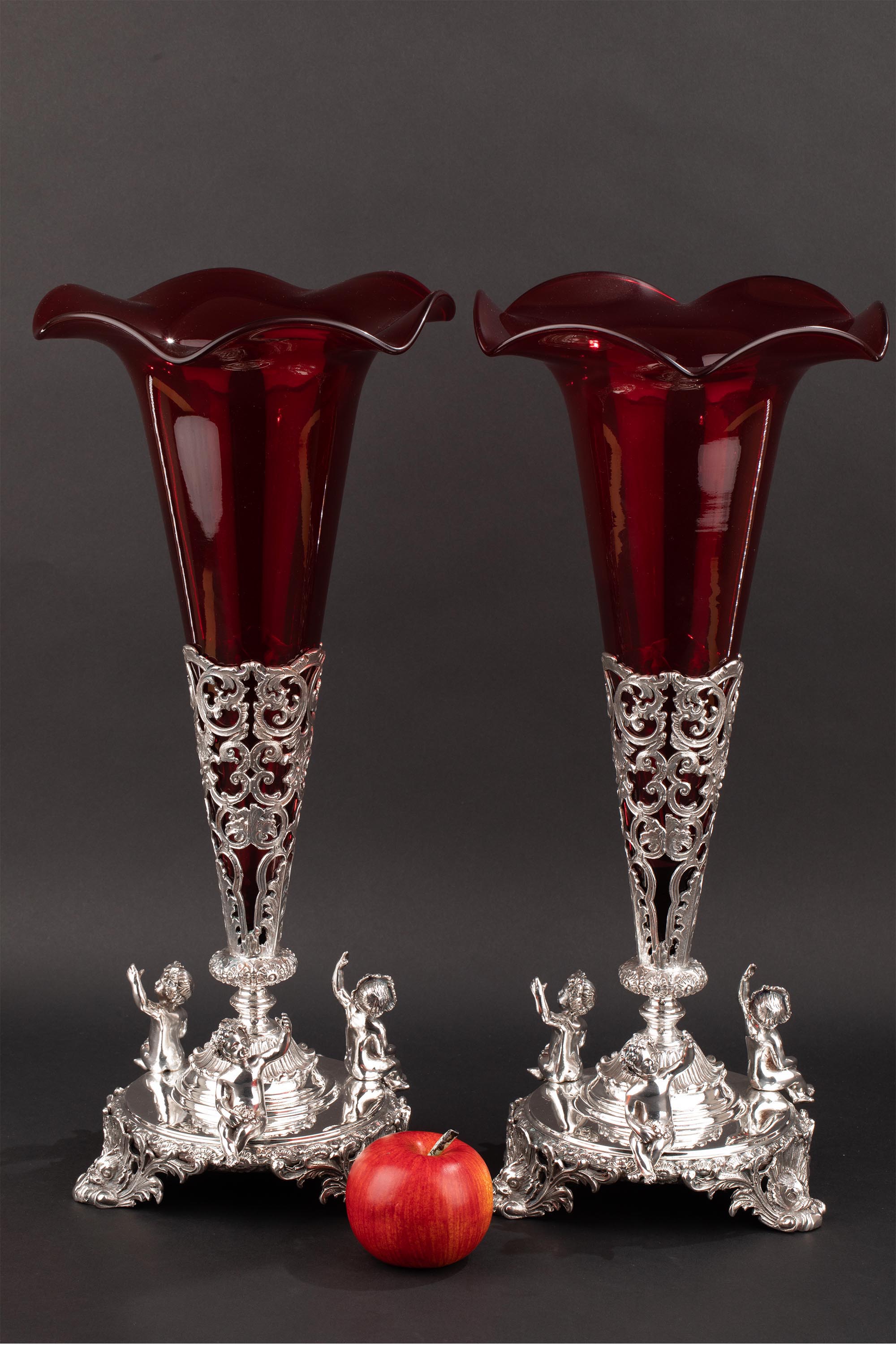 1920-1930年代英国出品小天使主题镀银精雕镶嵌暗红玻璃花瓶一对