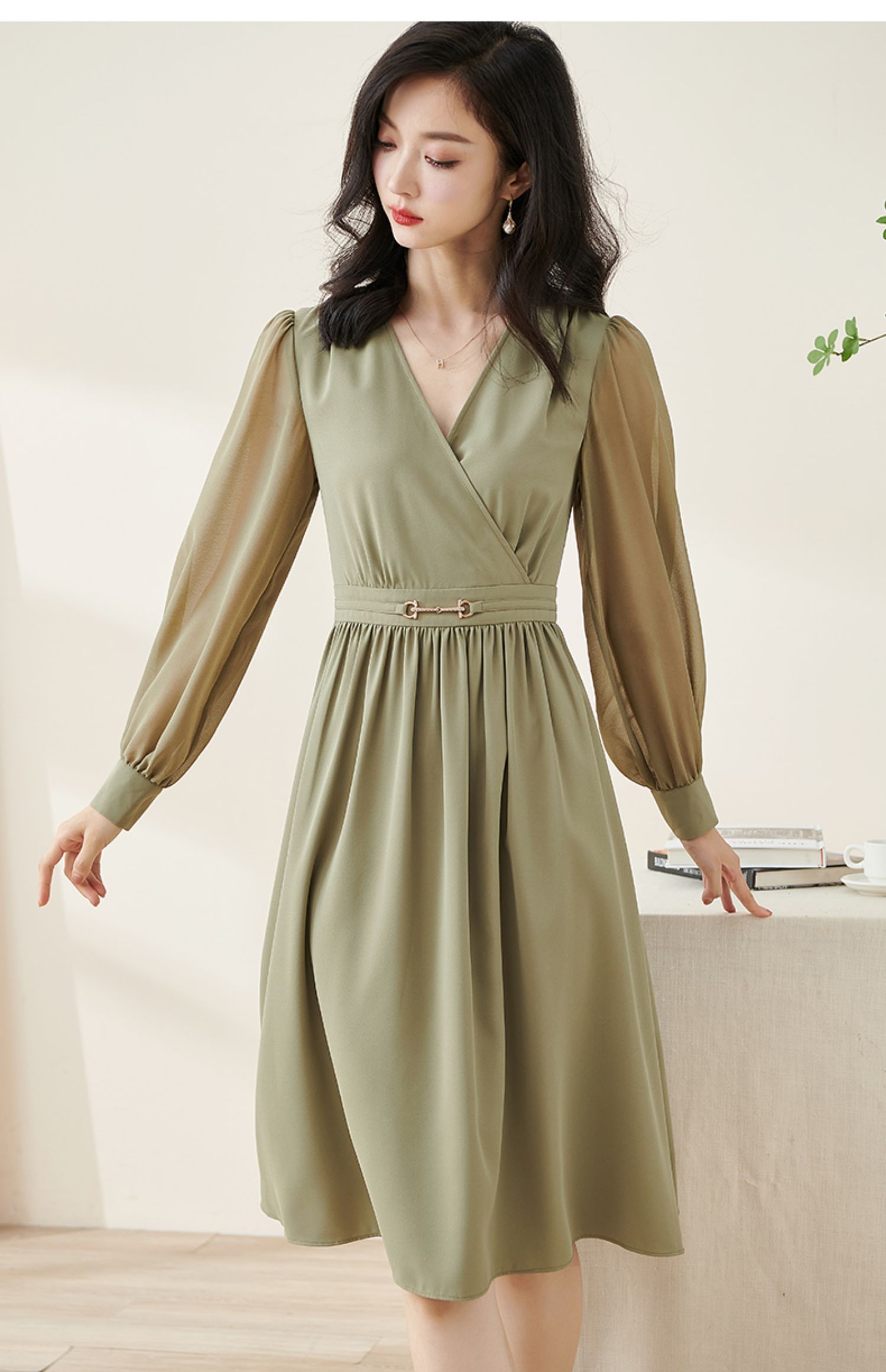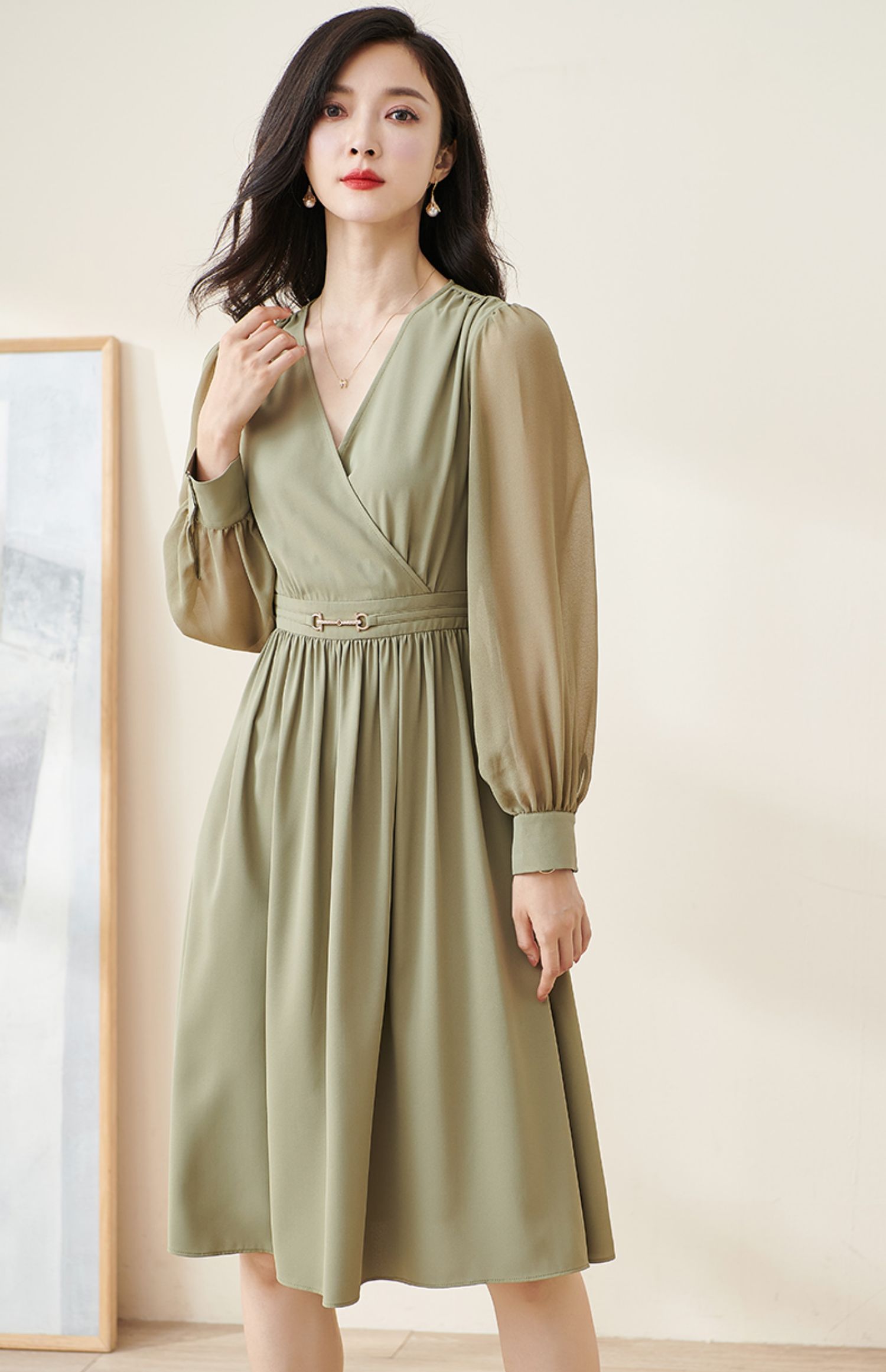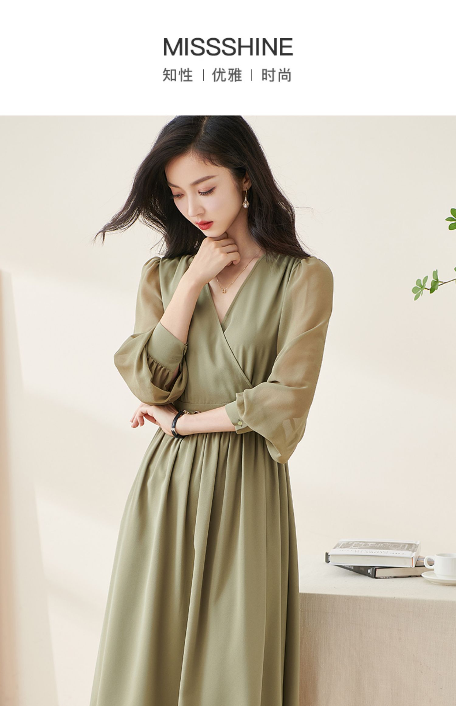 剩S/M/L/XL 米思阳2026春季新款气质淑女交叠V领连衣裙薄款长袖大摆裙子2114