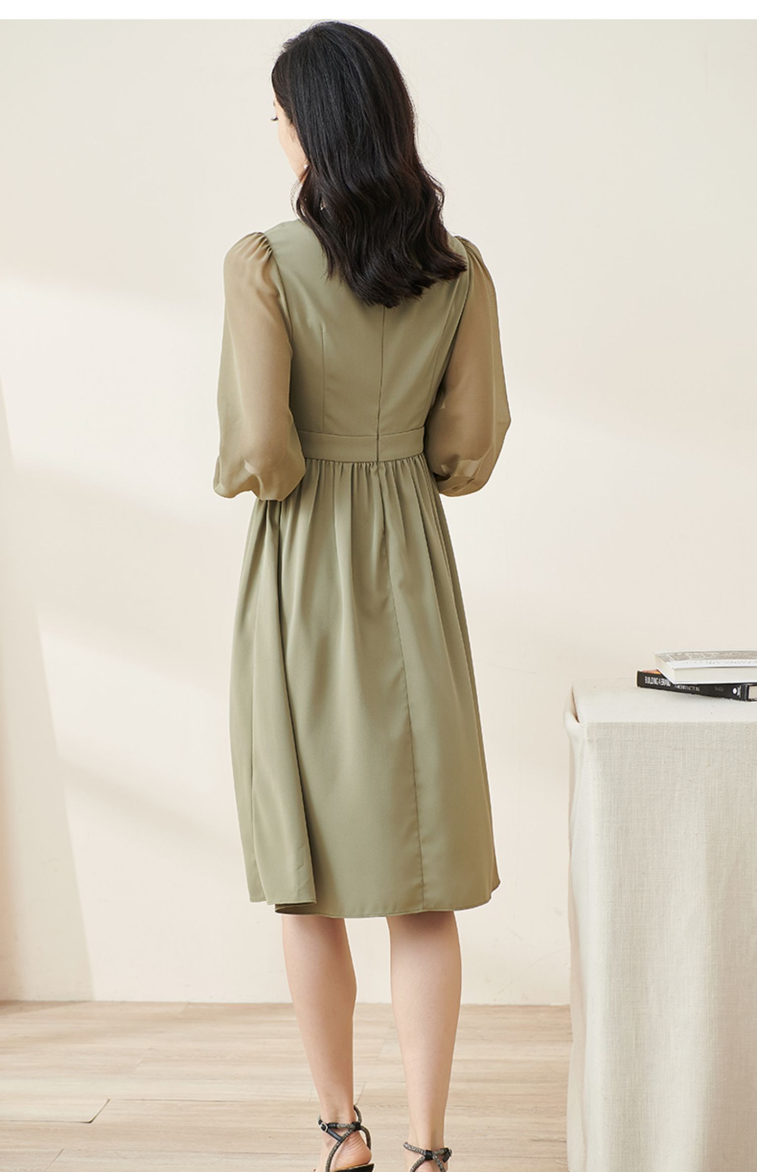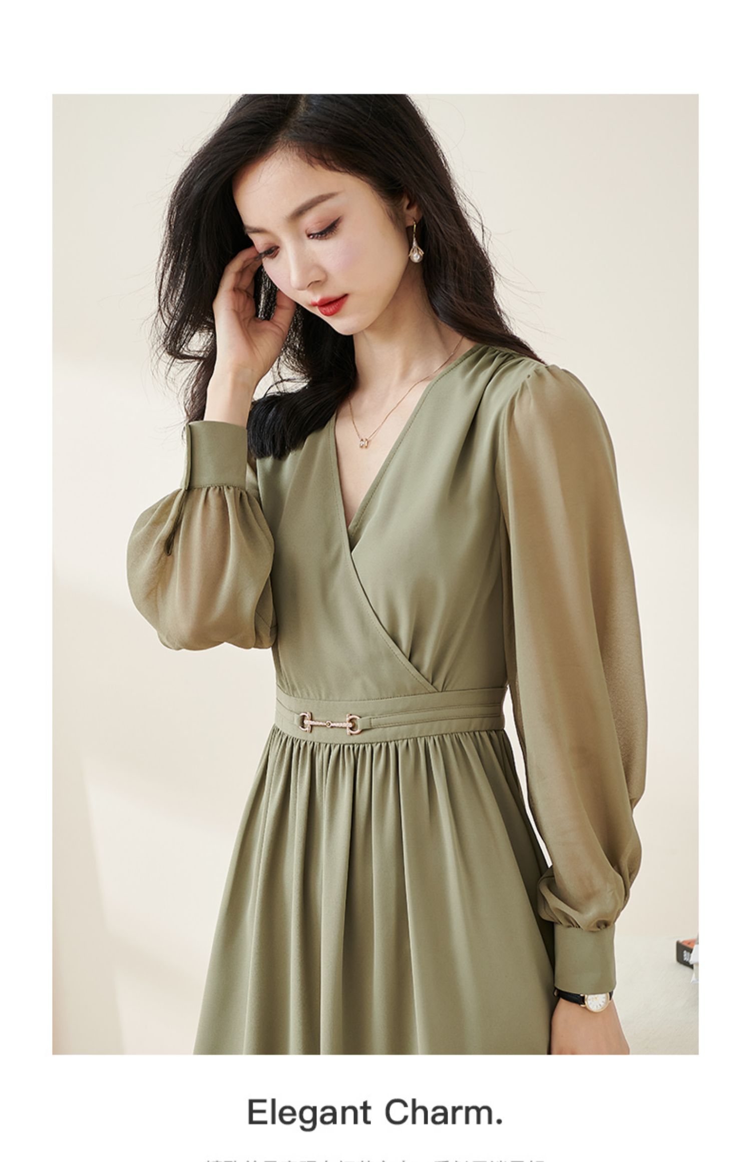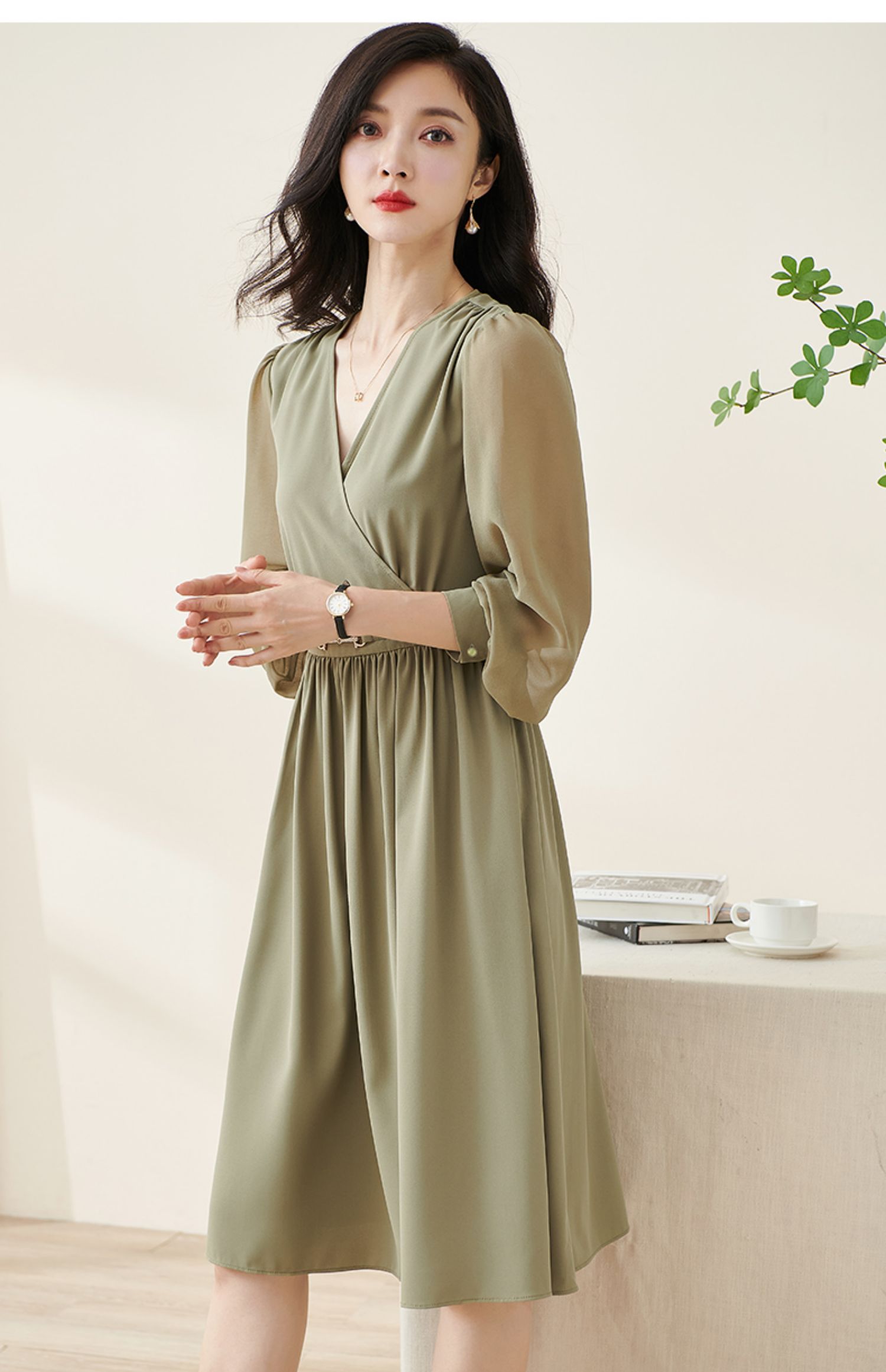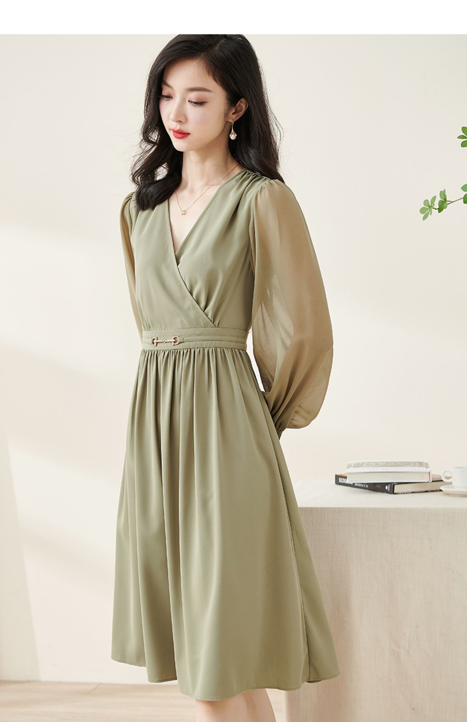 剩S/M/L/XL 米思阳2026春季新款气质淑女交叠V领连衣裙薄款长袖大摆裙子2114