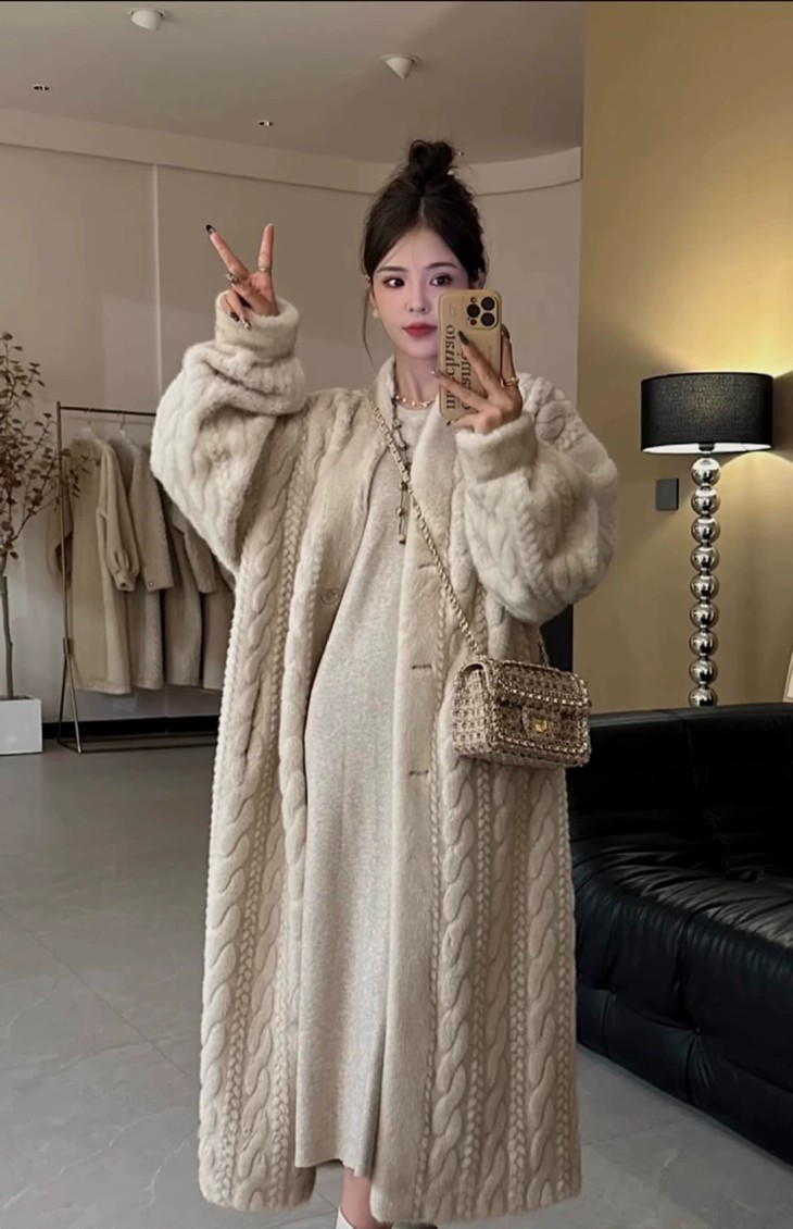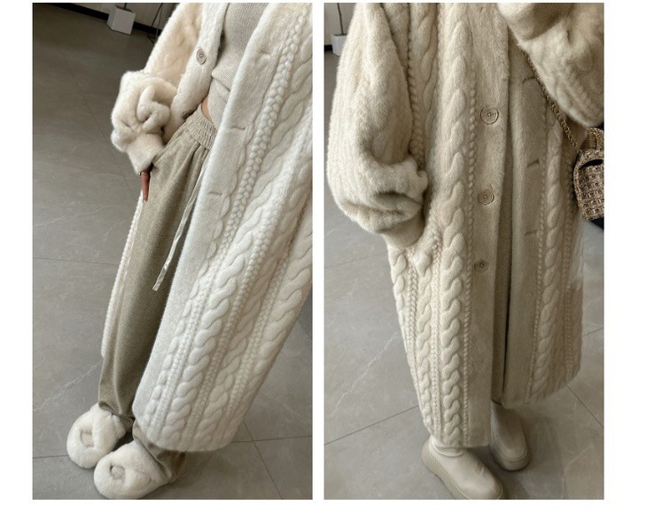 冬季加厚长款仿水貂毛绒麻花貂开衫皮毛一体环保皮草外套毛毛大衣女