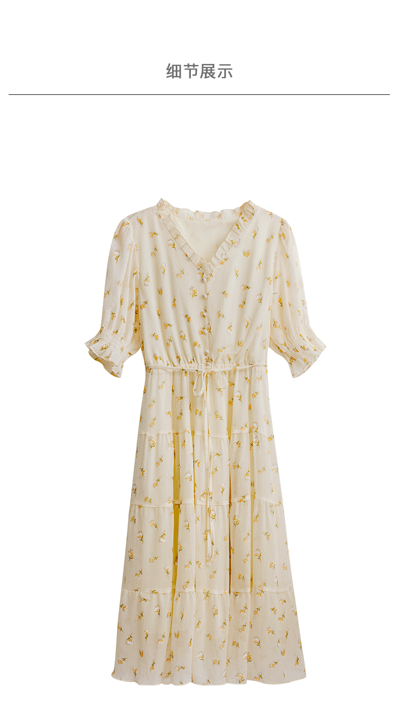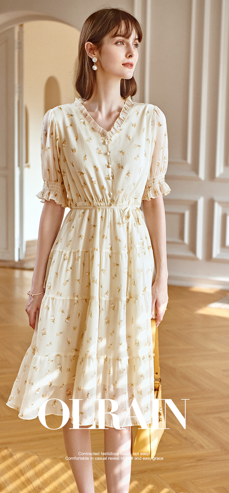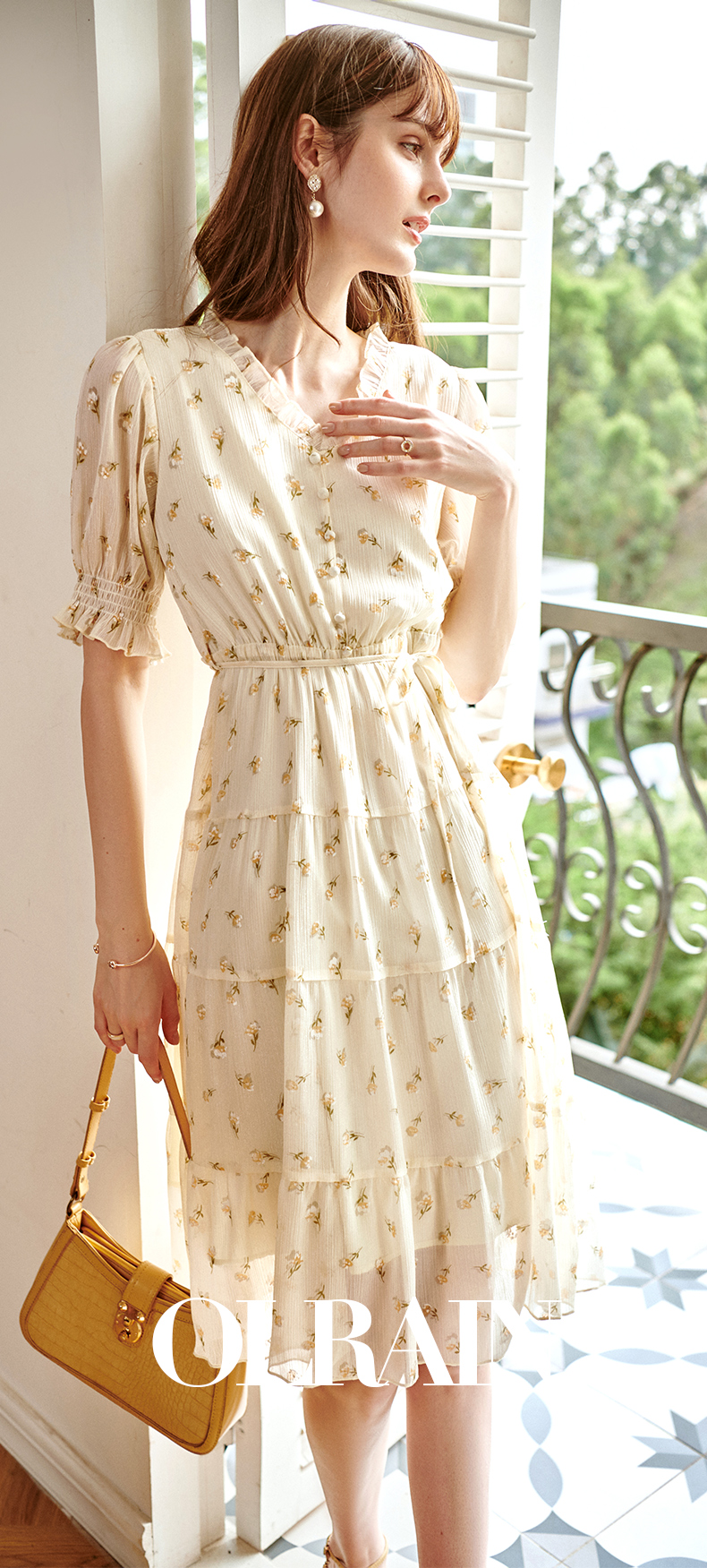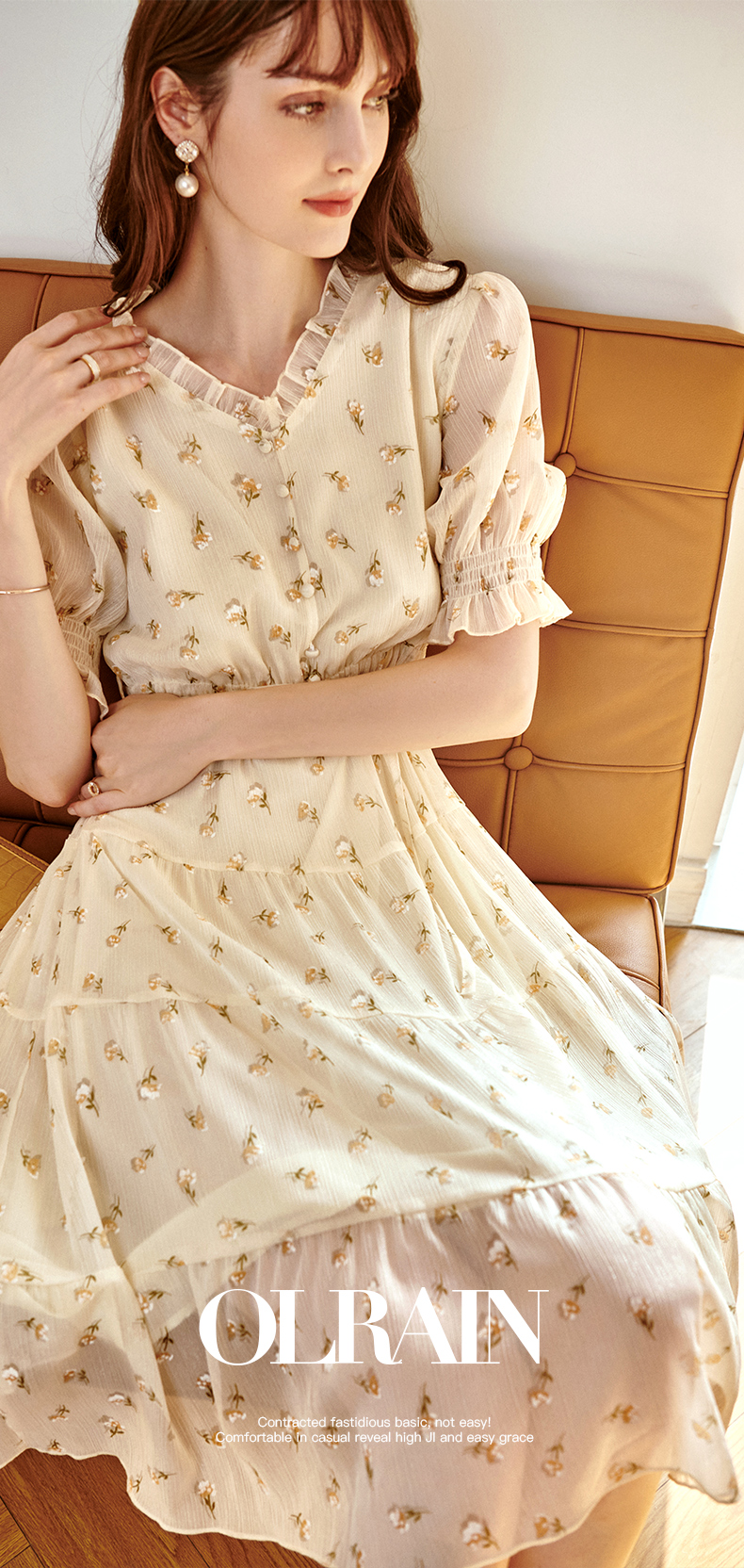 欧芮儿V领碎花连衣裙2021新款夏收腰显瘦气质花边设计感杏色裙子