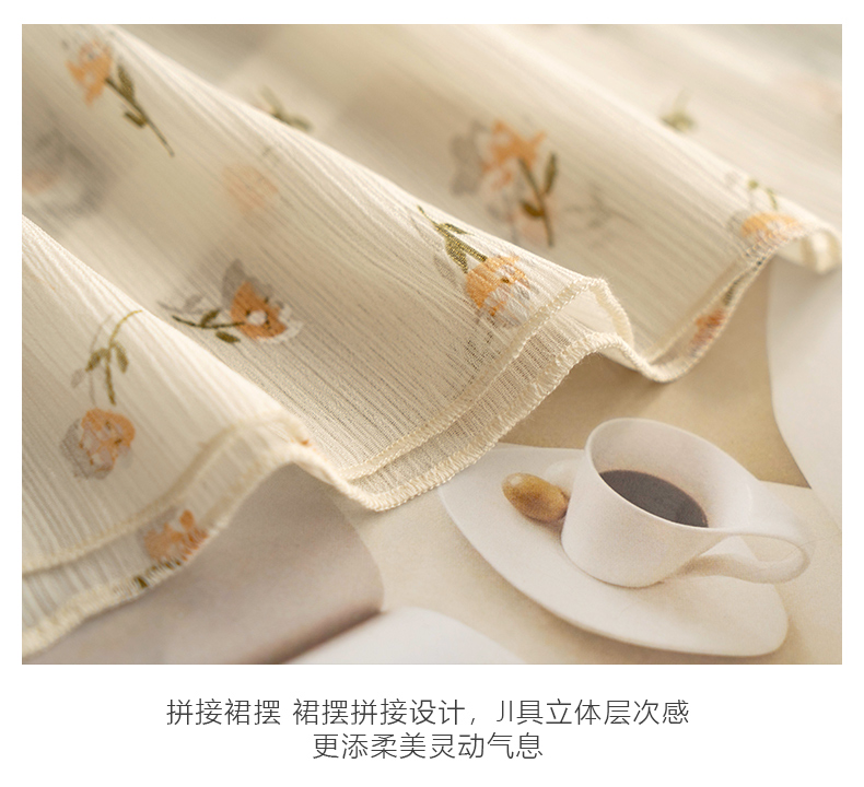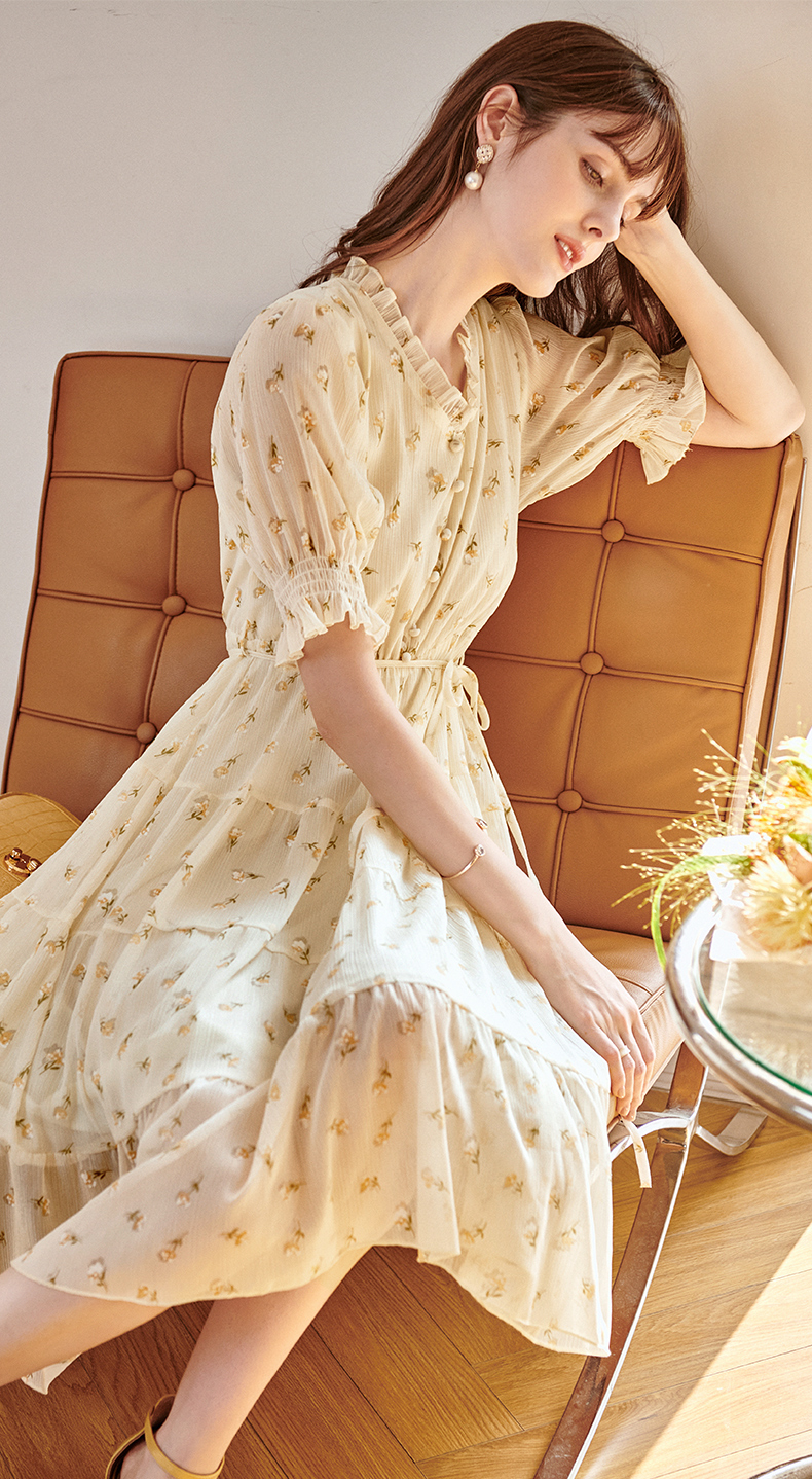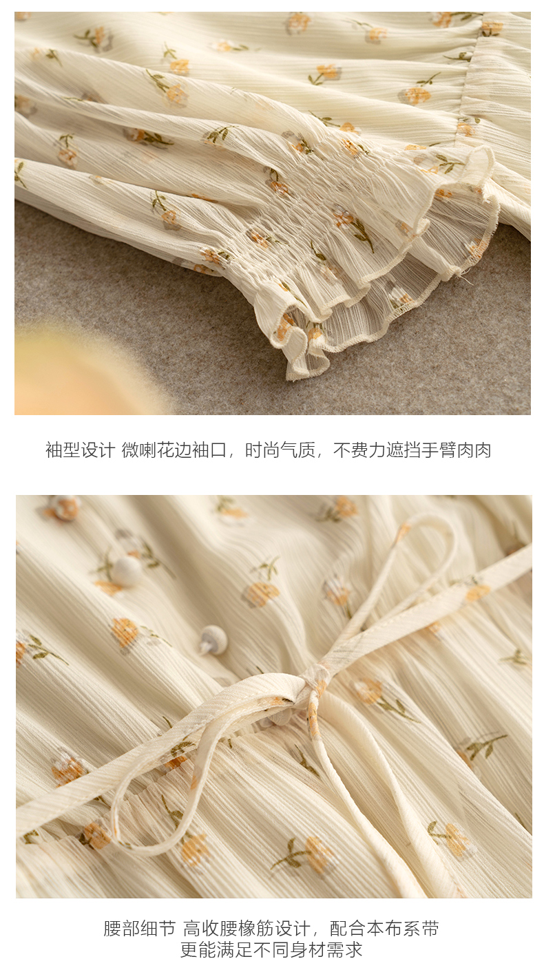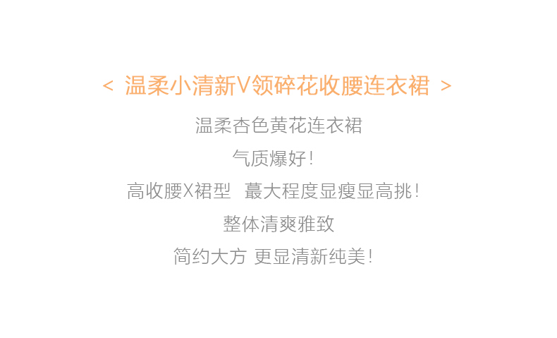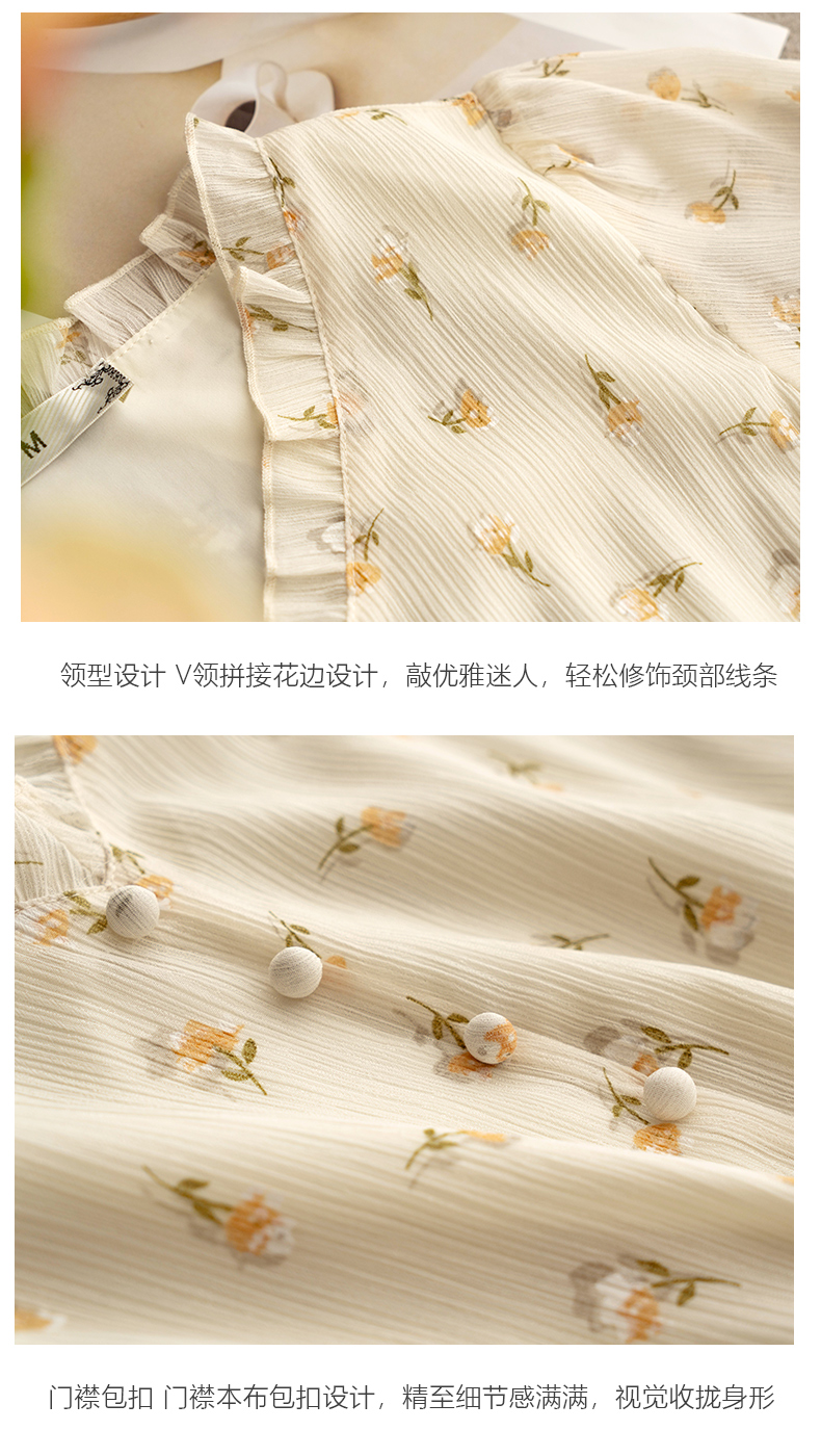 欧芮儿V领碎花连衣裙2021新款夏收腰显瘦气质花边设计感杏色裙子