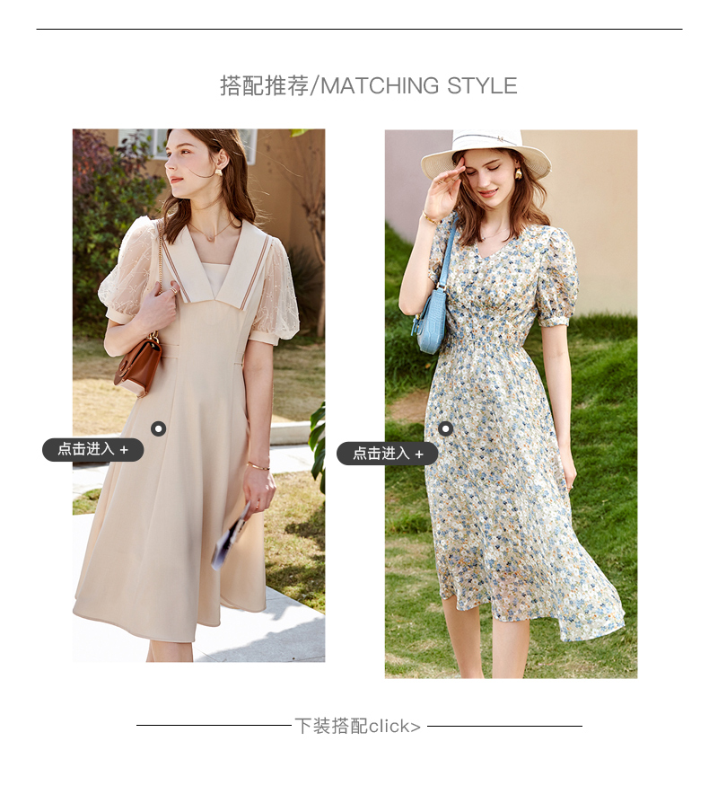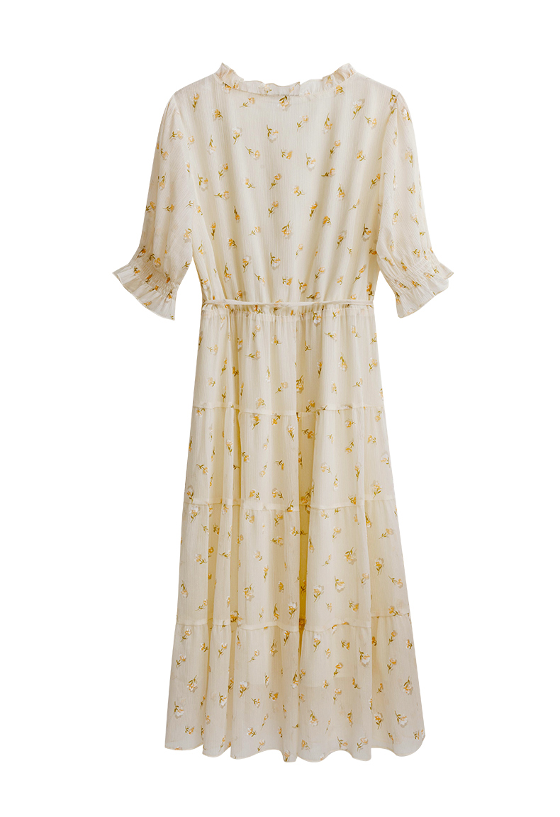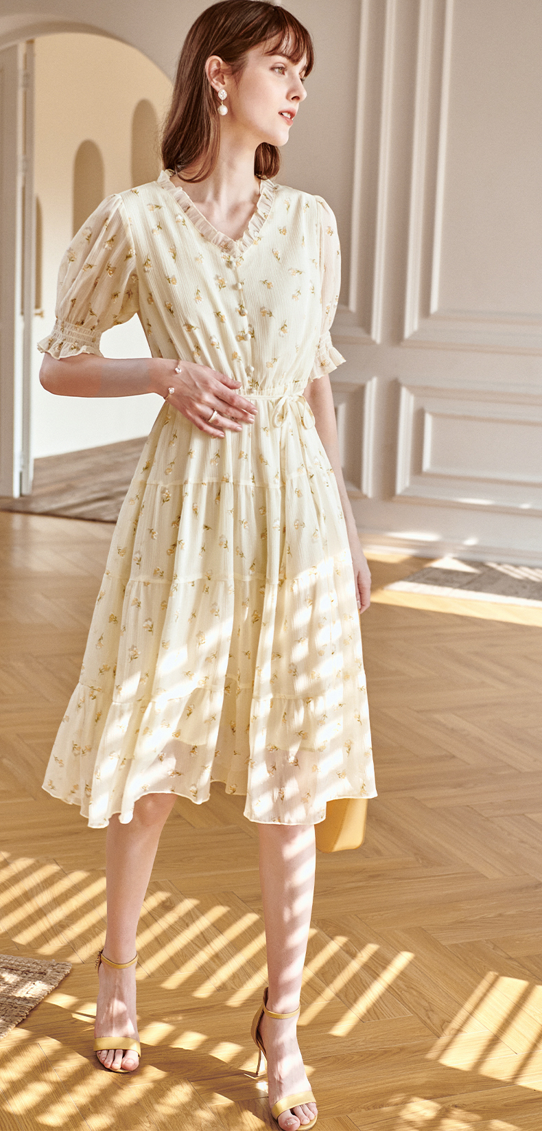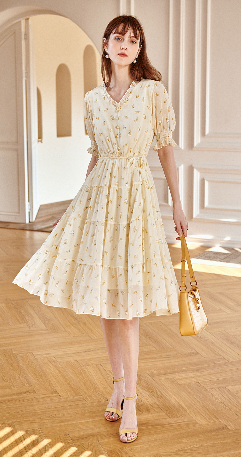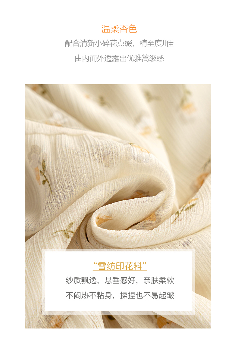 欧芮儿V领碎花连衣裙2021新款夏收腰显瘦气质花边设计感杏色裙子