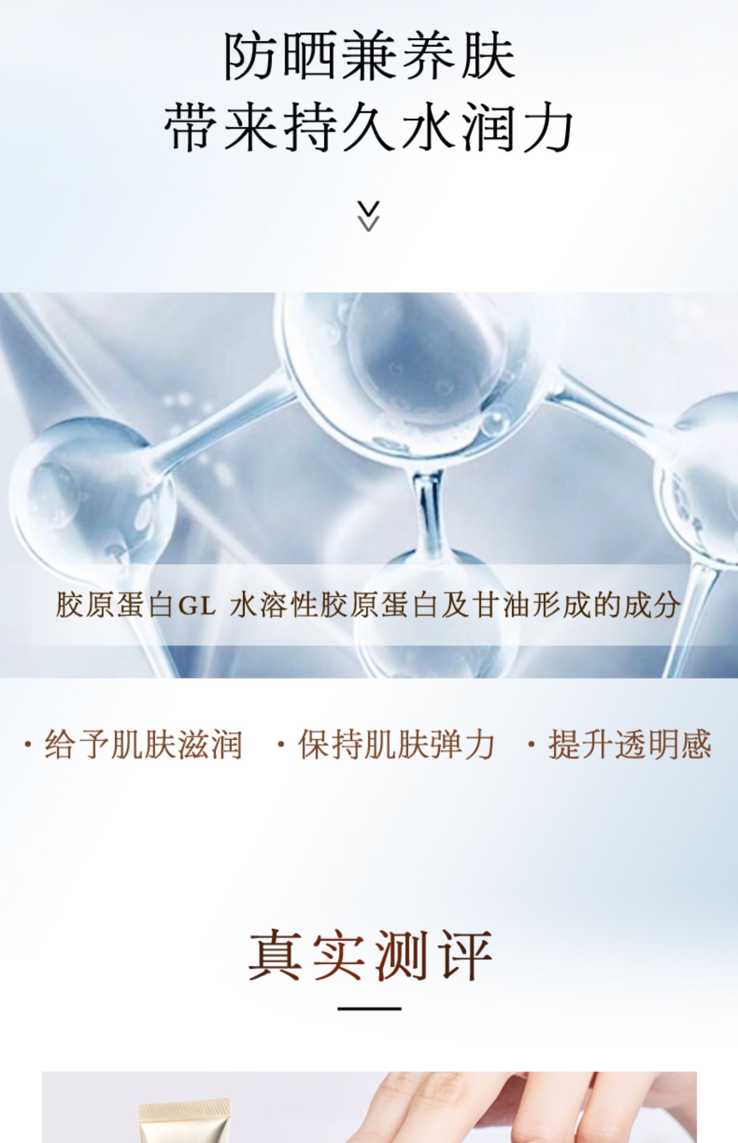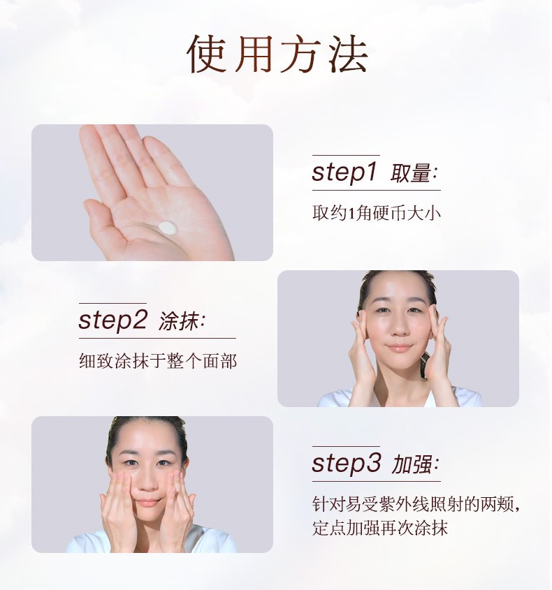 3、功效:懒人必备!擦防晒的一款乳液、隔离、防晒三合一产品!给皮肤减轻负担,超轻薄!化妆水后直接擦它一步搞定!! 不闷痘,不搓泥,不泛白,不油腻!中干皮、混油皮通吃!