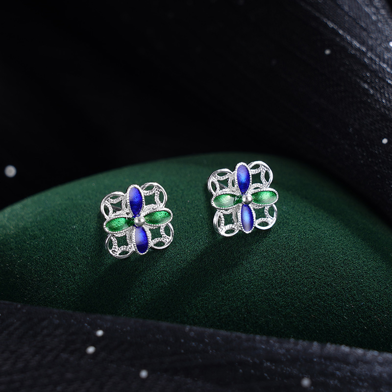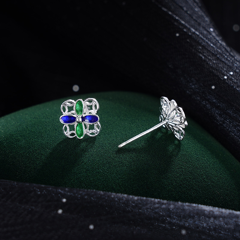 【寓意】:经典的四方耳钉,精致小巧,采用镂空纹理编织设计,蓝绿色珐琅渲染,清新自然,质感满满。