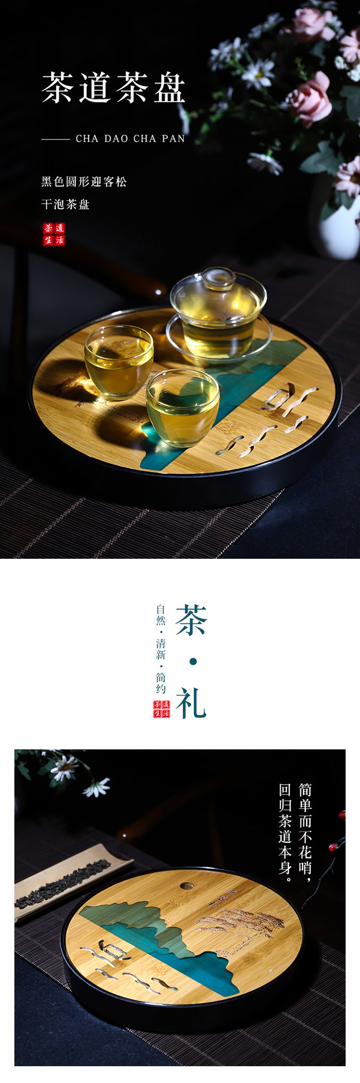 黑色圆形迎客松茶盘