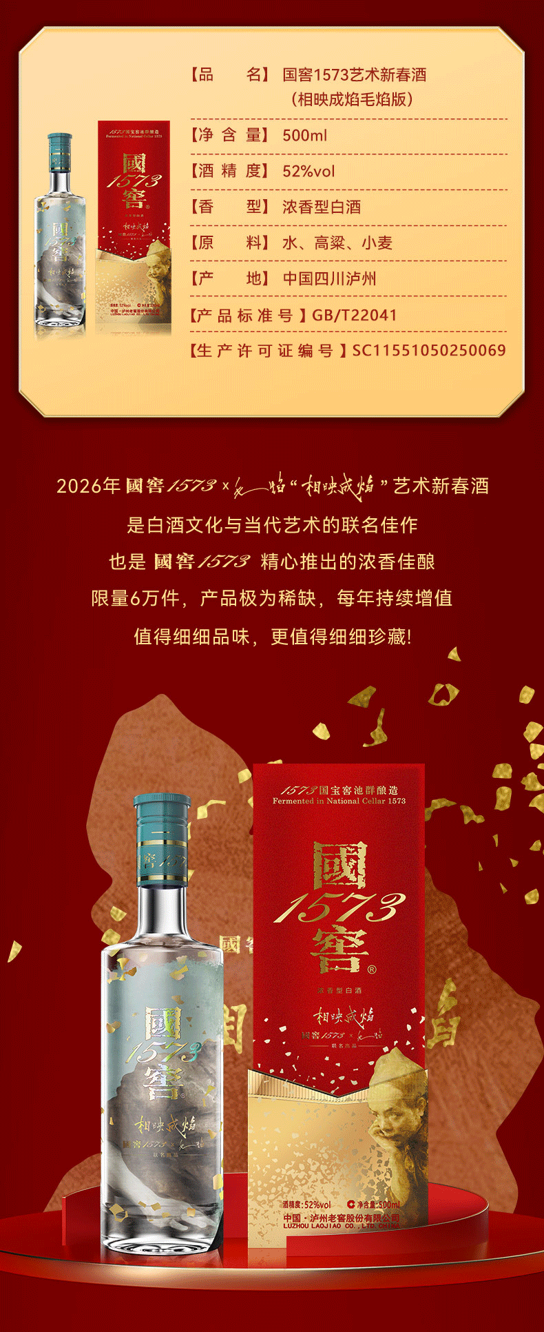 【新品上新】52度国窖1573艺术新春酒(相映成焰毛焰版)500ml 泸州老窖官方旗舰店