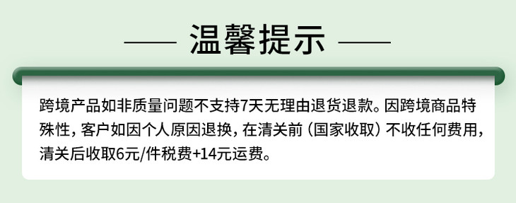 【售后政策】跨境产品非质量问题不支持7天无理由退换货,因跨境商品特殊性,客人如因个人原因退换,在清关前(国家收取)不收任何费用,清关后收取税费6元/瓶+14元运费/订单