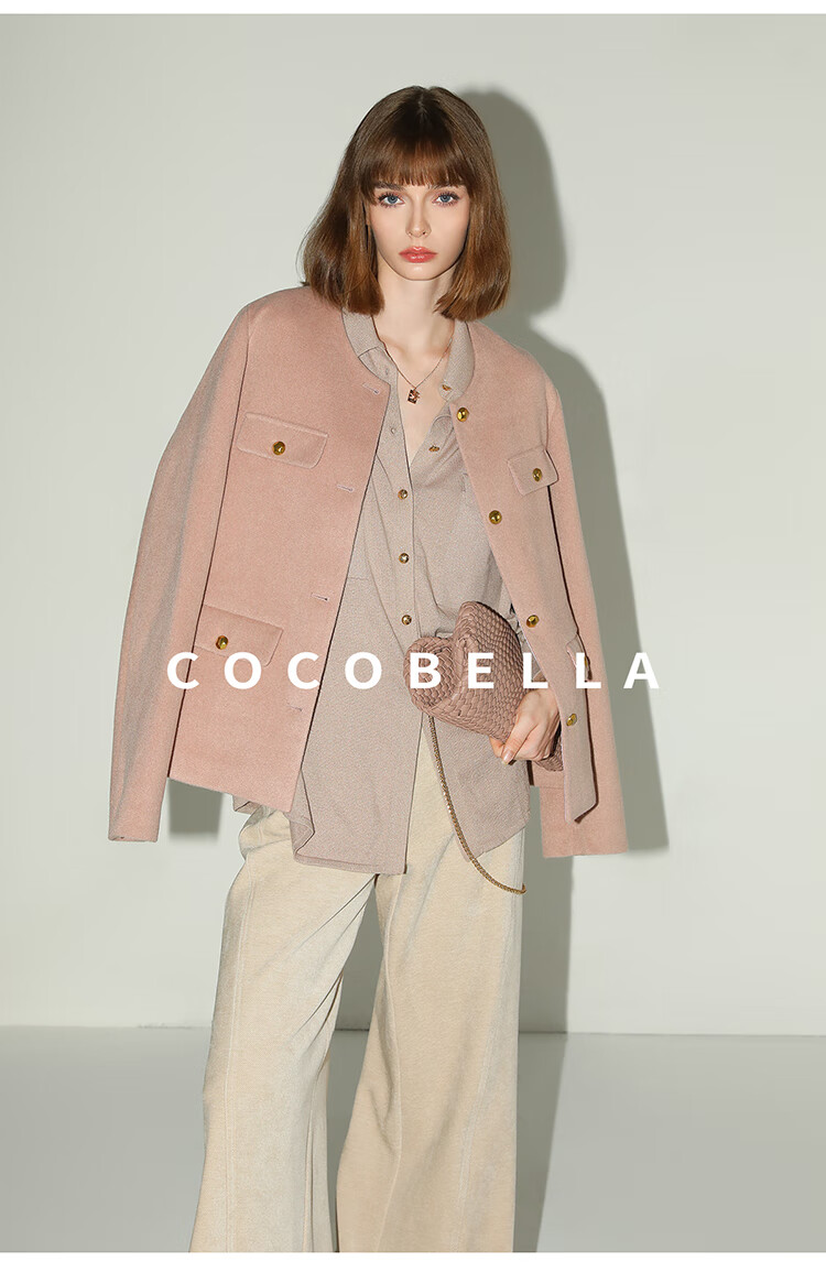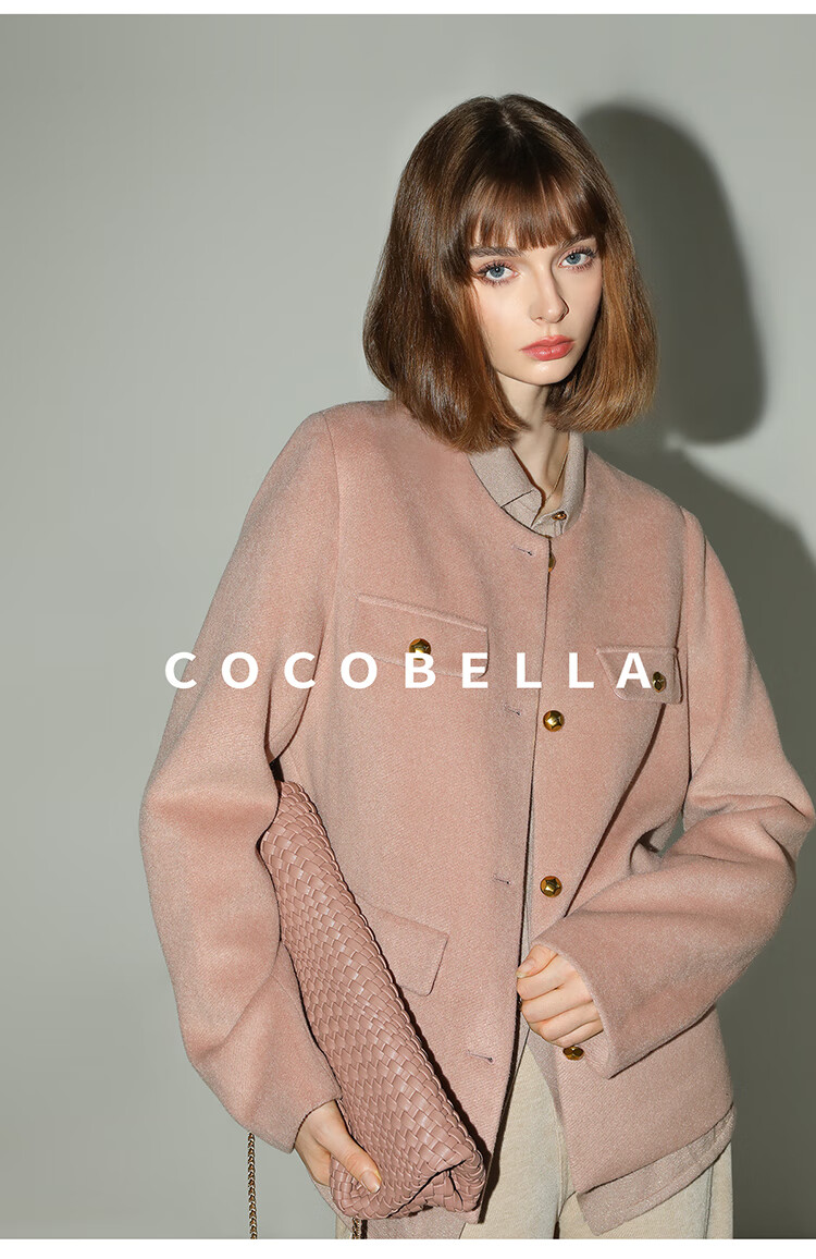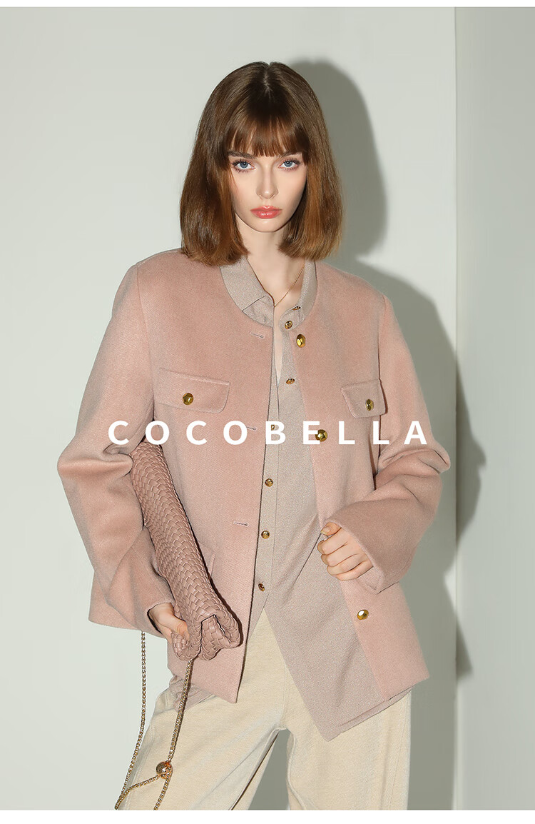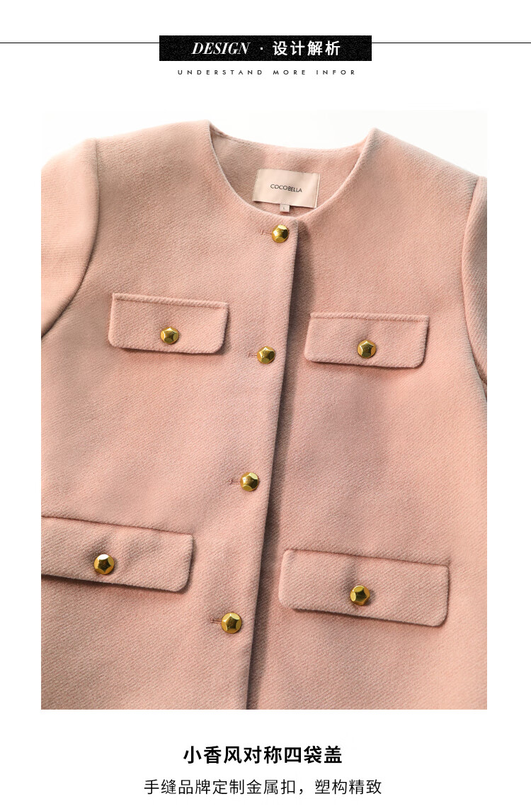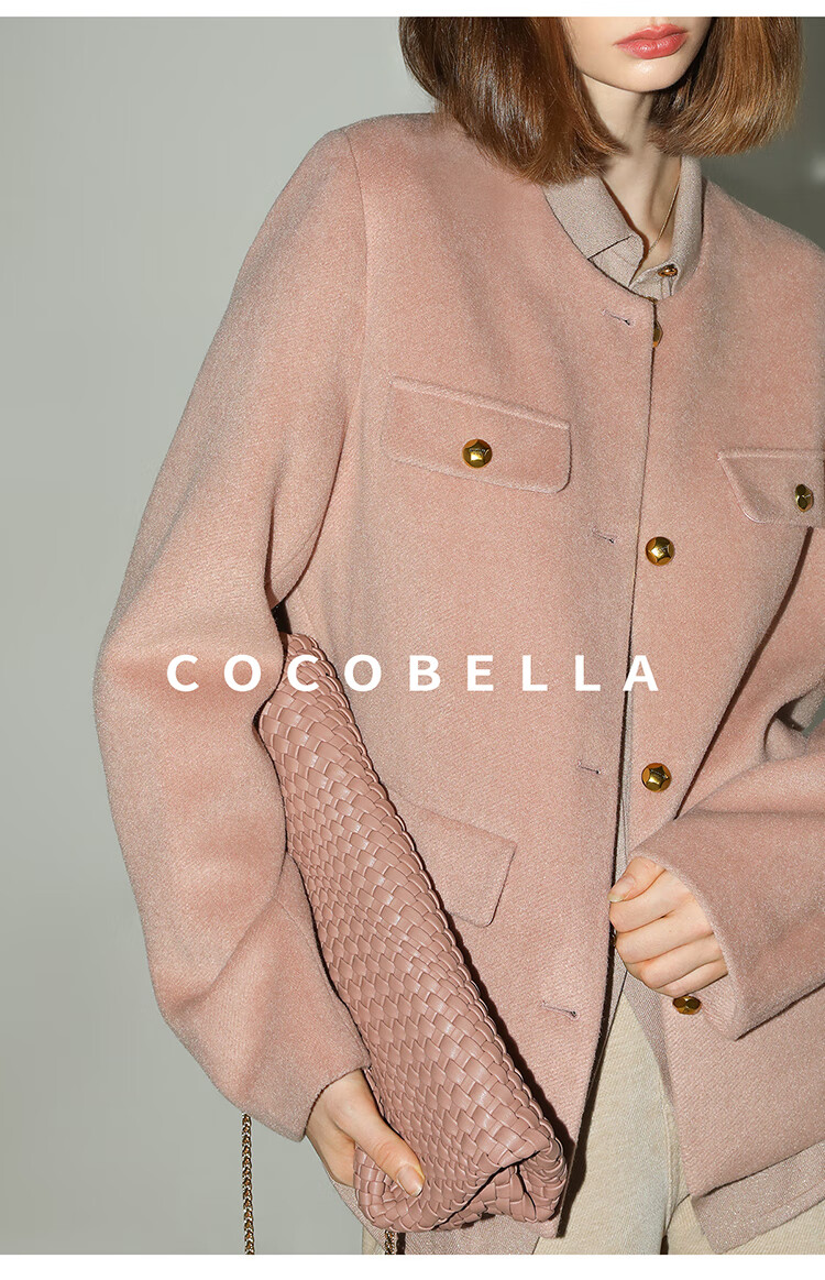 COCOBELLA气质粉小香风短外套质感金属扣箱型毛呢大衣WL7066