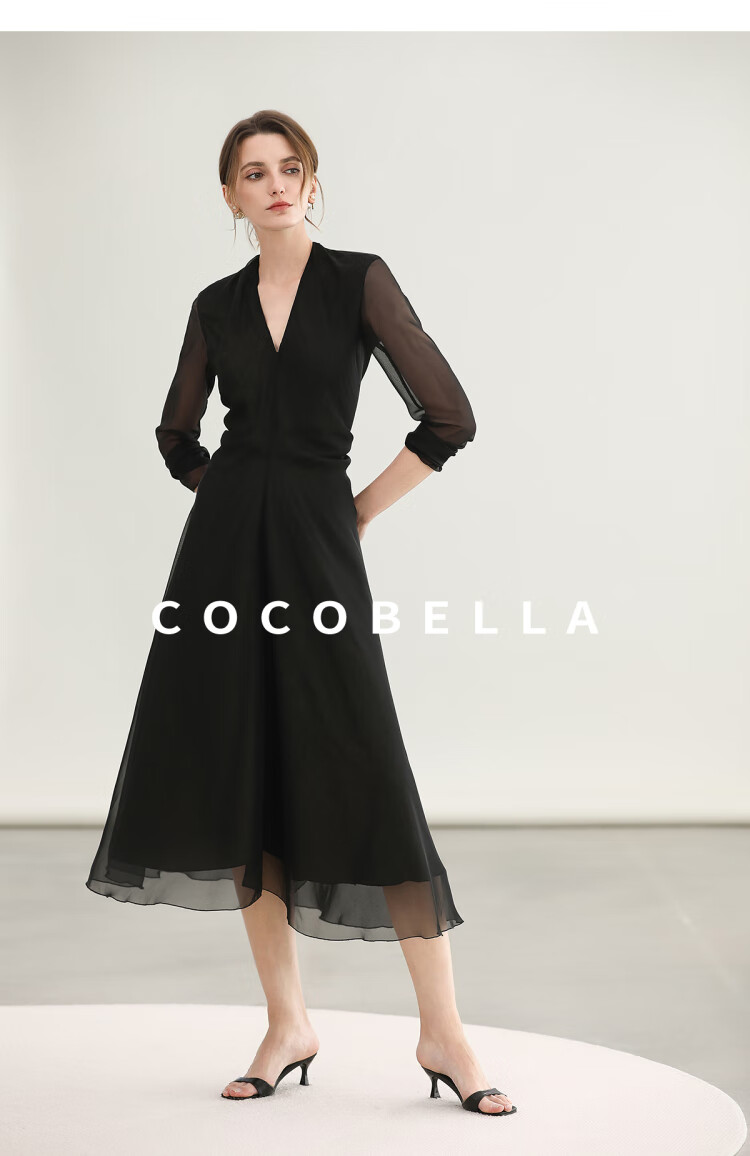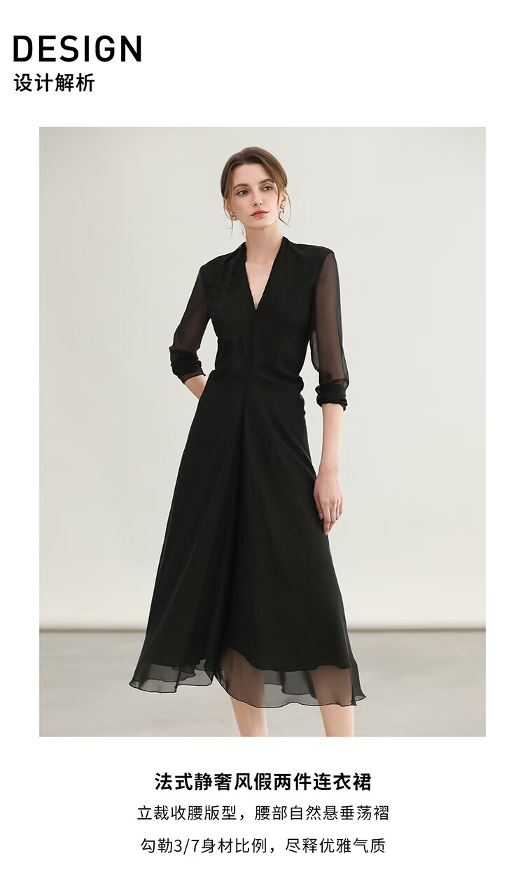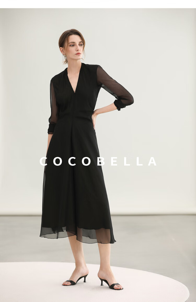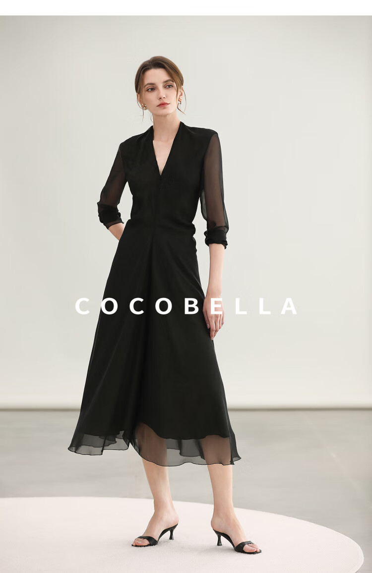 COCOBELLA赫本风假两件双层黑金连衣裙女内搭V领衬衫裙FR7085