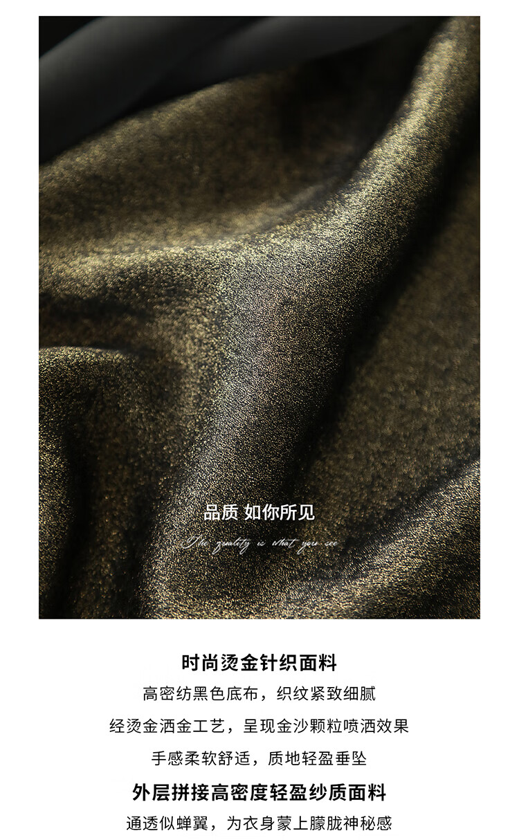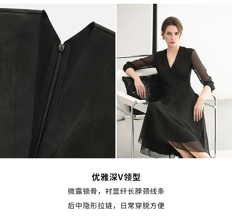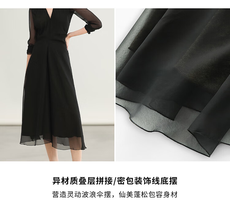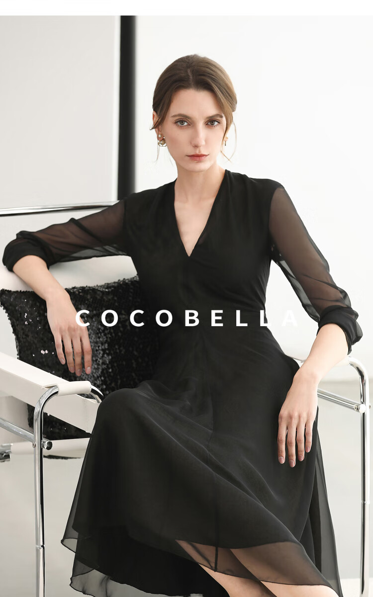 COCOBELLA赫本风假两件双层黑金连衣裙女内搭V领衬衫裙FR7085