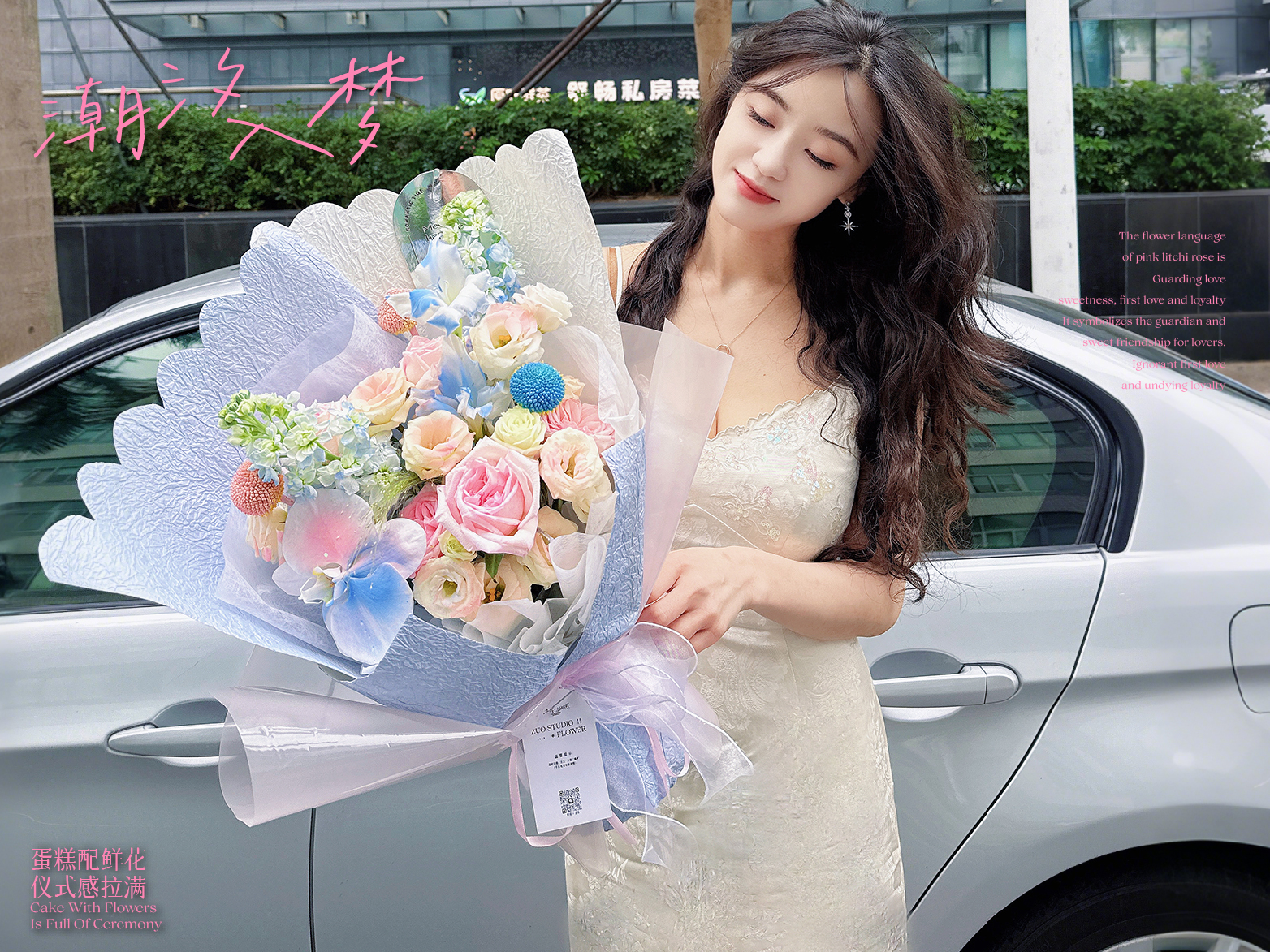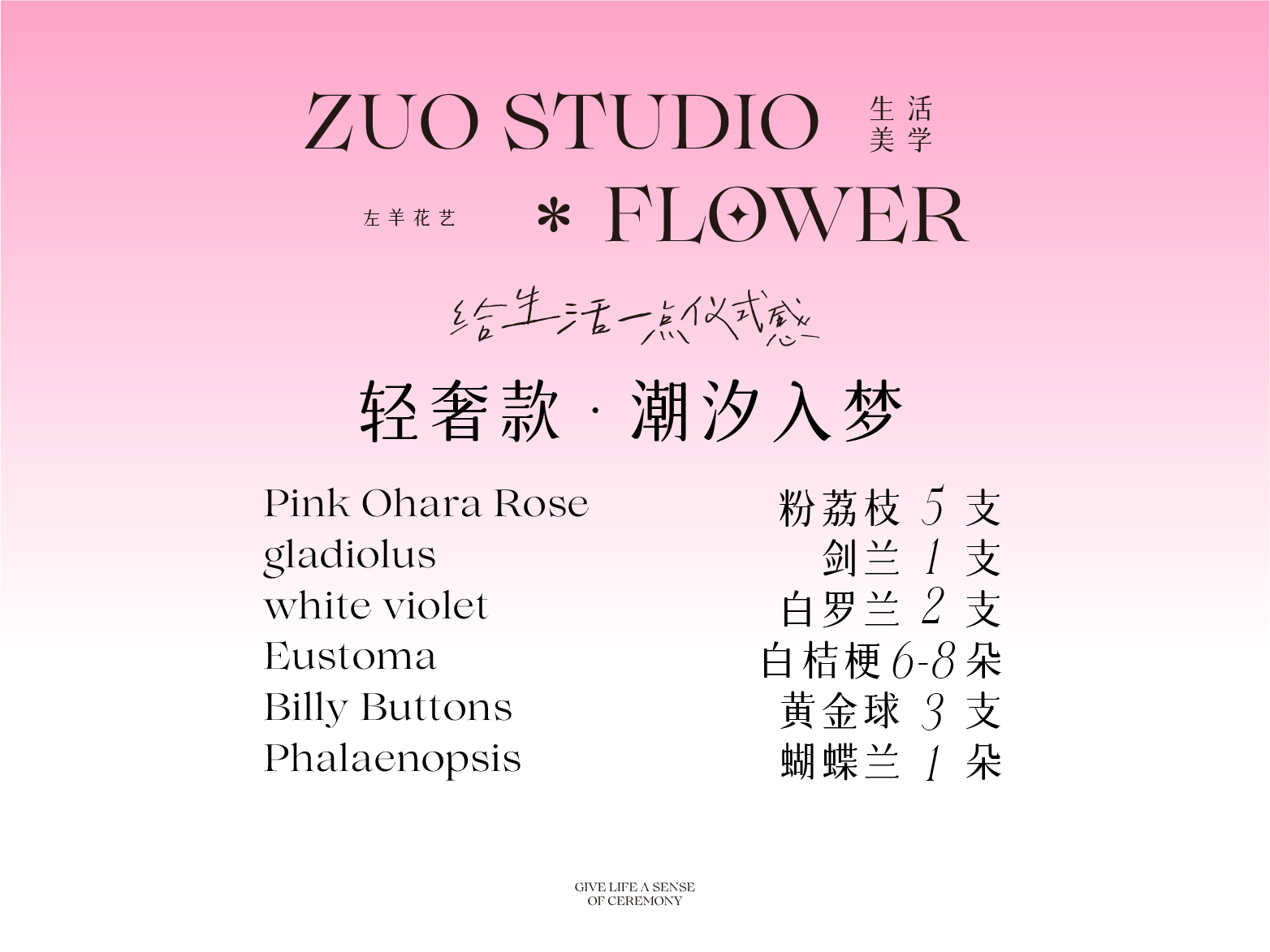 轻奢款鲜花【潮汐入梦】粉荔枝5支/剑兰1支/白罗兰2支/白桔梗6-8朵/黄金球3支/蝴蝶兰1朵/氛围感鲜花/仪式感鲜花