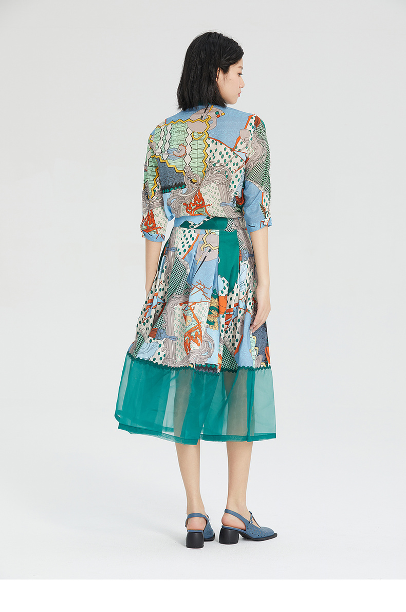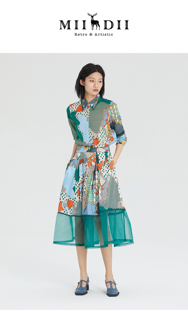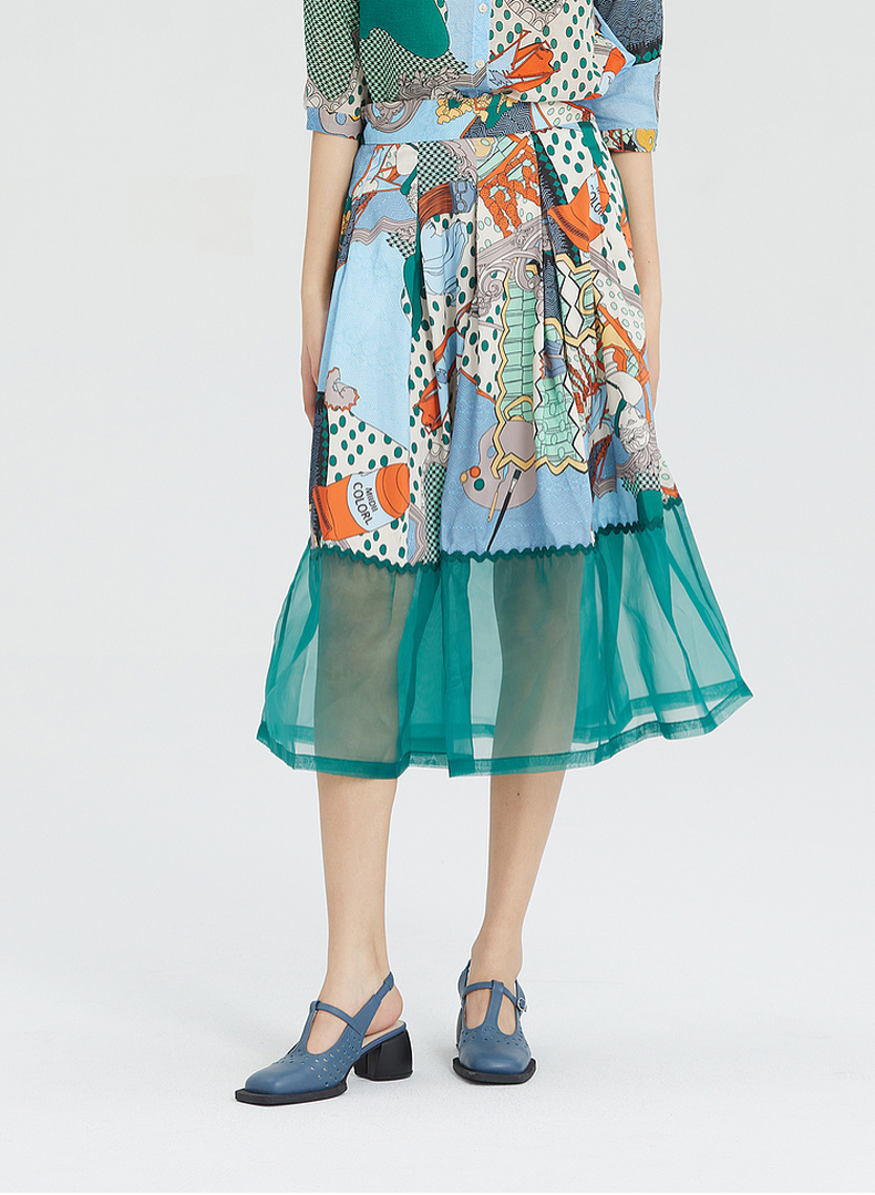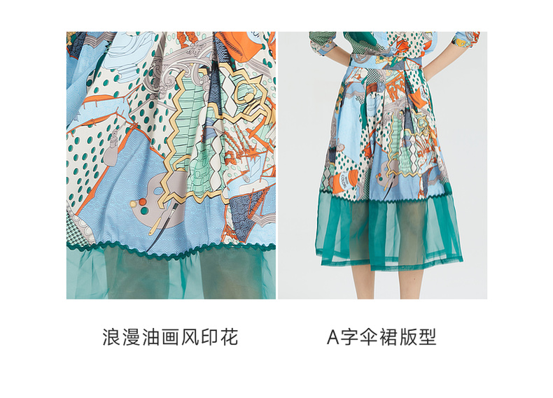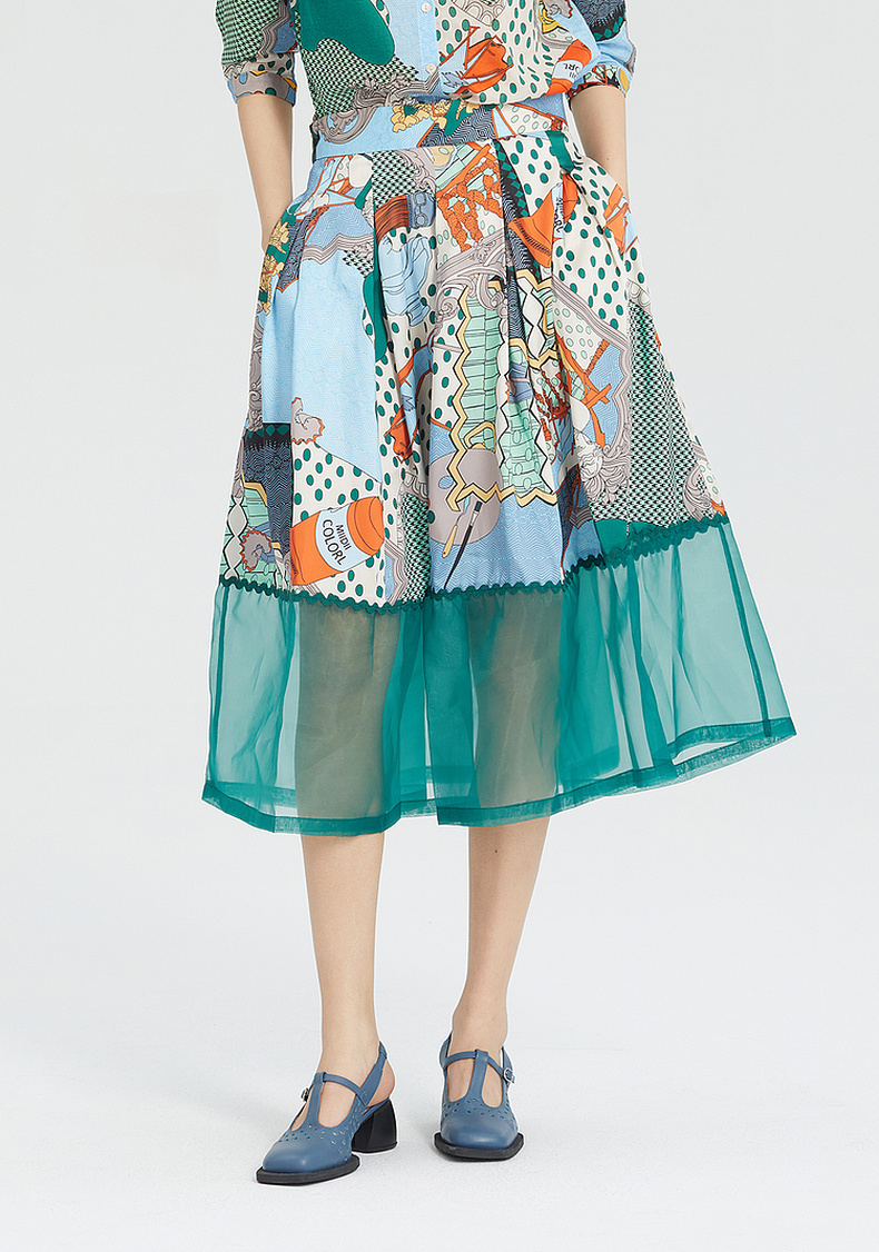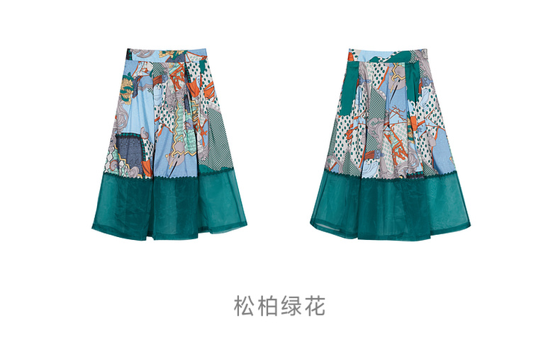 谜底花色半身裙2023夏季复古优雅拼接欧根纱中长百褶裙235MB6017