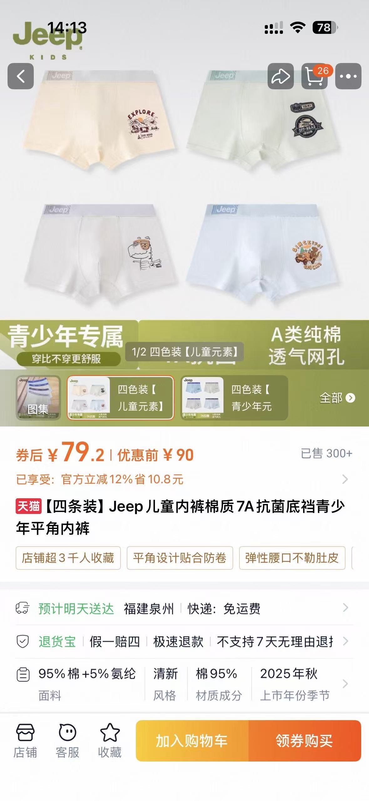 💰49元包邮,【发4条 】正品JEEP儿童及青少年男士内裤