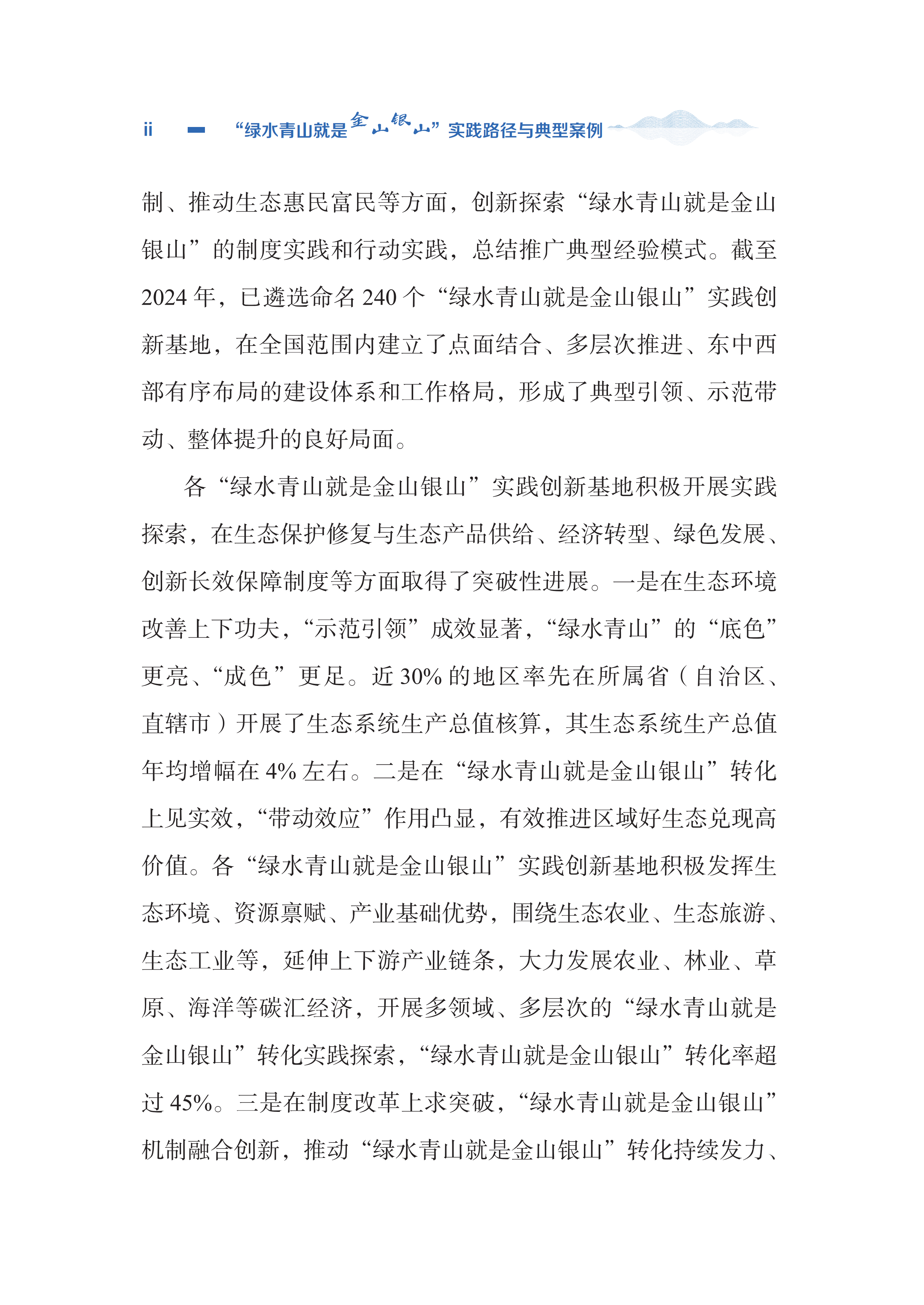 本书系统梳理“护绿换金”“聚绿成金”“借绿生金”3 种“绿水青山就是金山银山“转化路径,以及“生态补偿”“生态农业”“生态工业”“生态旅游”“‘生态 +’复合产业”“生态市场”“生态金融”7 种转化模式。书中精选多个来自全国不同区域、兼具代表性与创新性的典型案例,深入剖析各地依托资源禀赋,在生态保护修复、产业绿色转型、生态产品价值实现等方面的成功经验,生动诠释了“绿水青山就是金山银山”理念的真理力量与实践伟力。