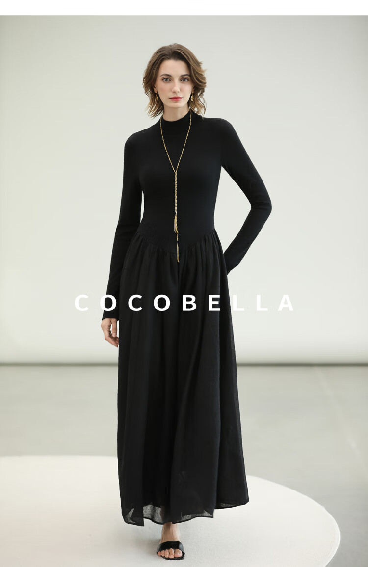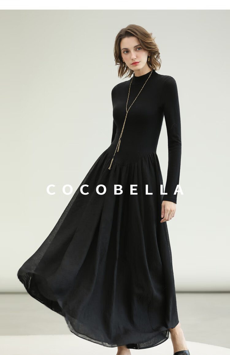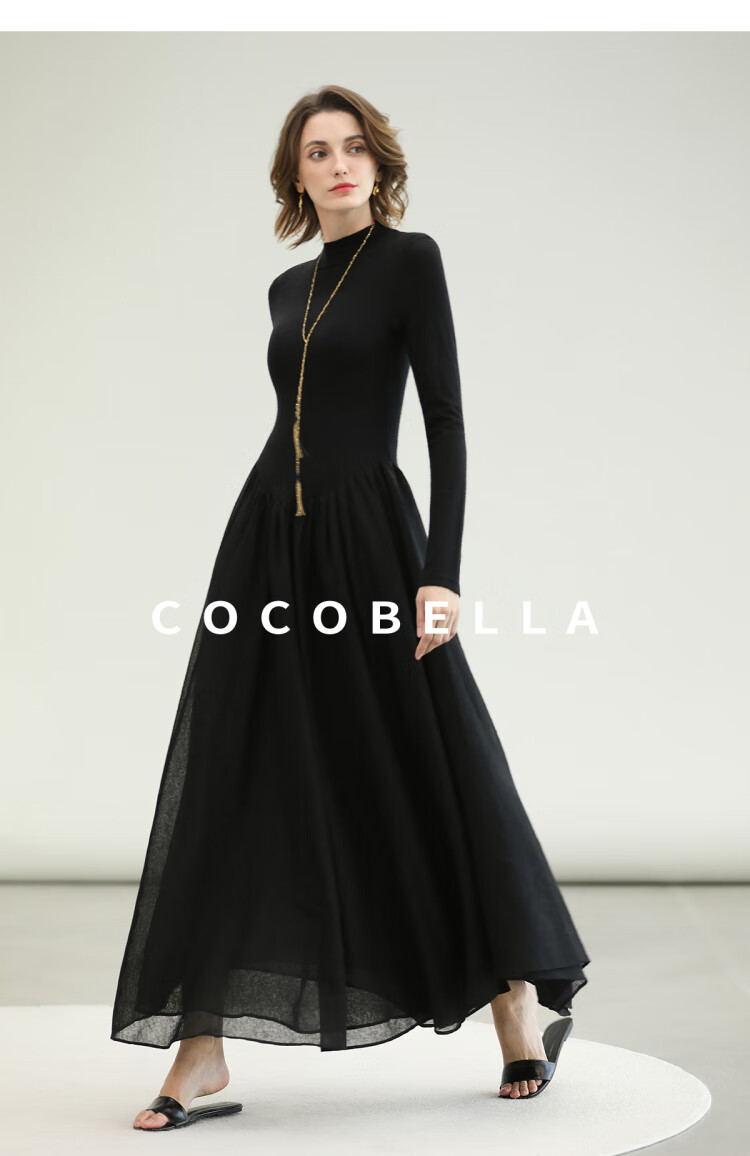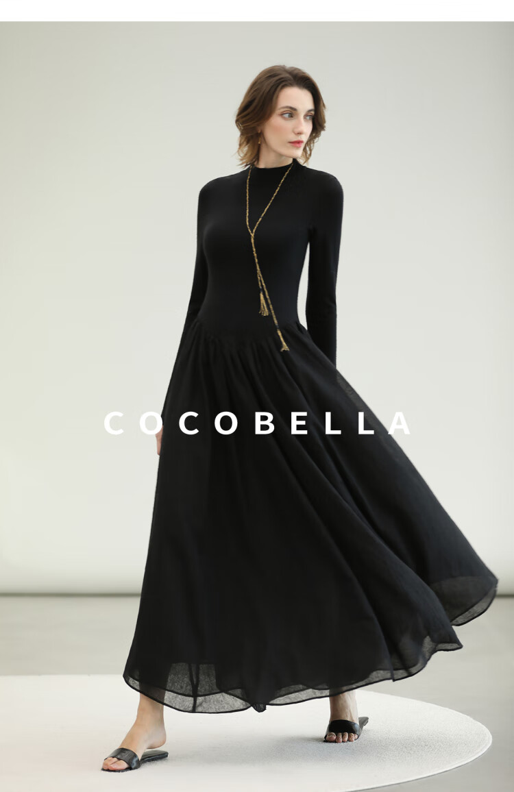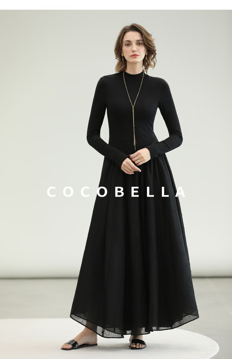【限时特惠】COCOBELLA赫本风礼服半高领连衣裙小黑裙褶皱肌理大摆长裙FR0008