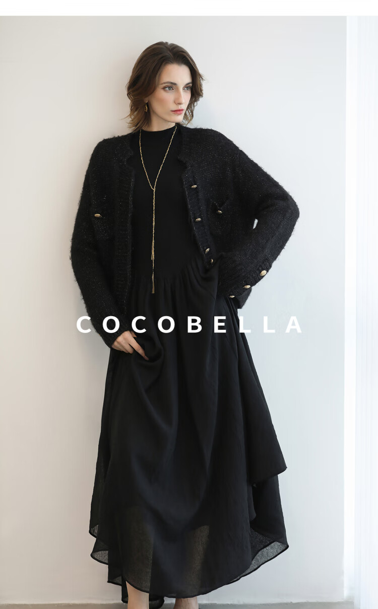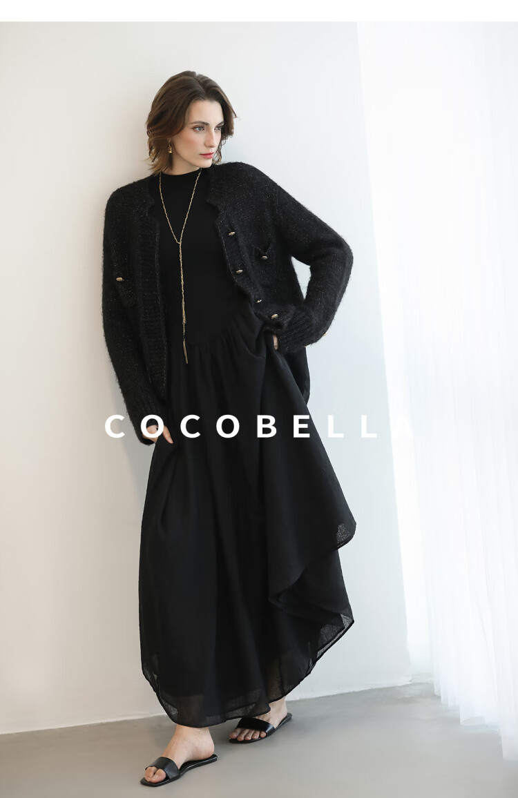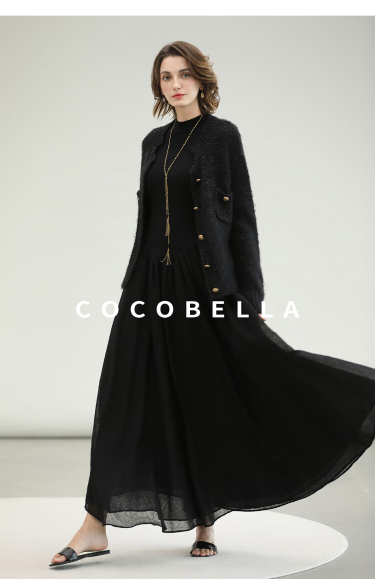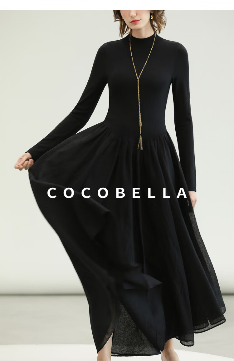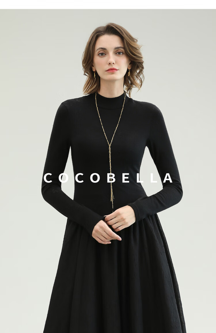 【限时特惠】COCOBELLA赫本风礼服半高领连衣裙小黑裙褶皱肌理大摆长裙FR0008