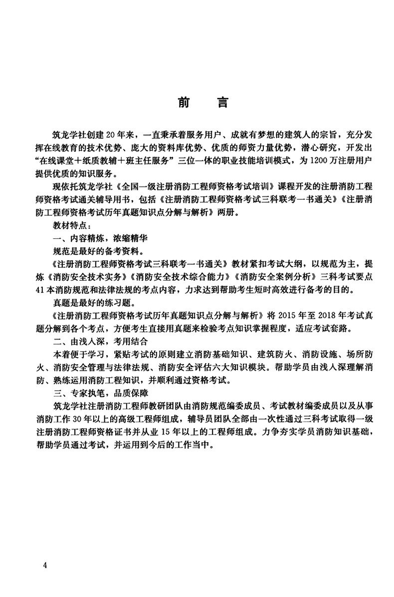 筑龙学社注册消防工程师教研团队倾力打造,《消防安全技术实务》《消防安全技术综合能力》《消防安全案例分析》三门考试+三册考试教材+41本消防规范和法律法规=一本书通关。 全书共分六个模块,包括:消防基础知识;建筑防火;消防设施;其他建筑、场所的防火;法律法规与消防安全管理;消防安全评估。此外,本教材另有配套出版的习题册《注册消防工程师资格考试历年真题知识点分解与解析》,帮助考生短时高效进行备考,顺利通过考试。