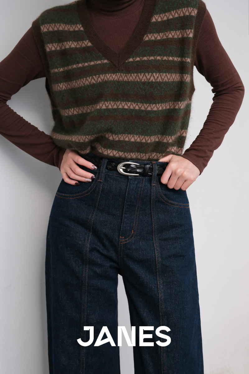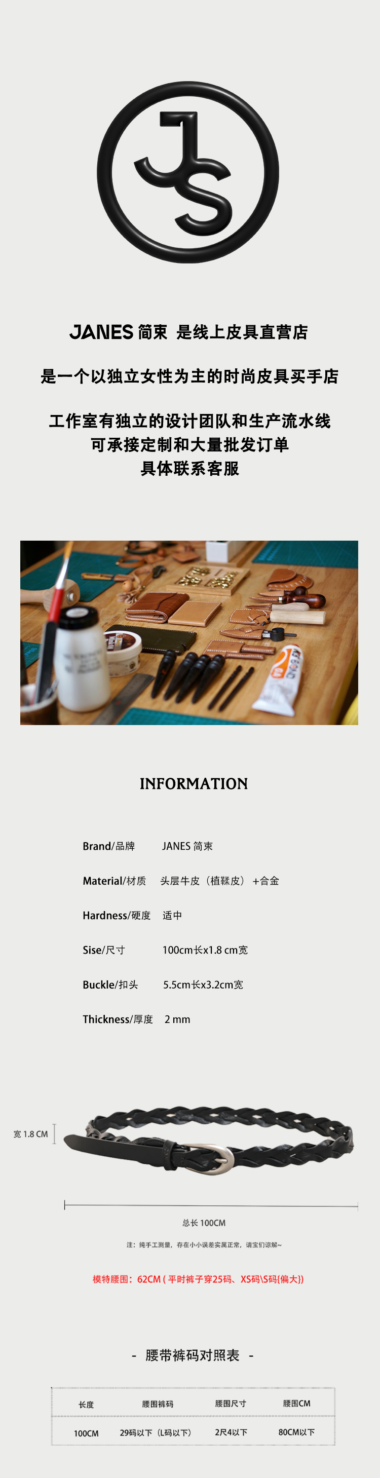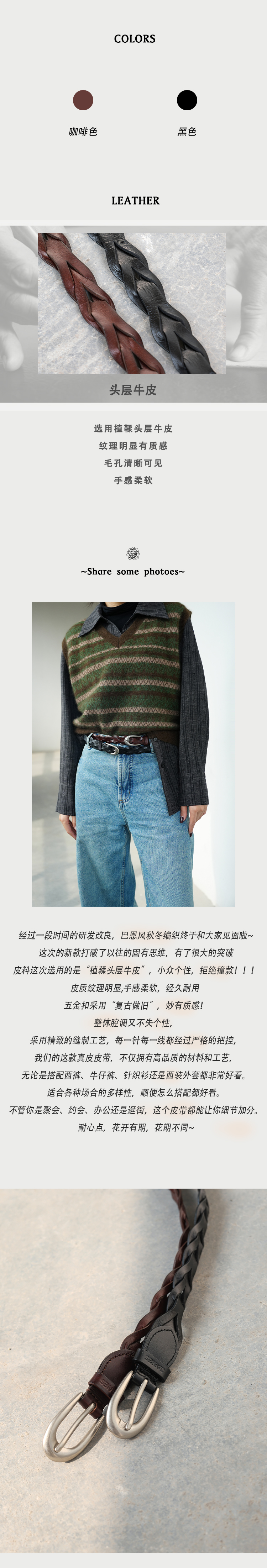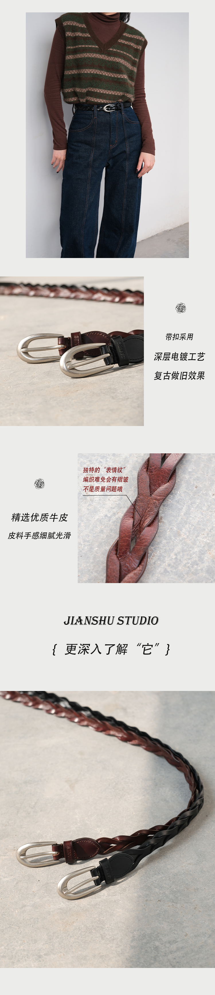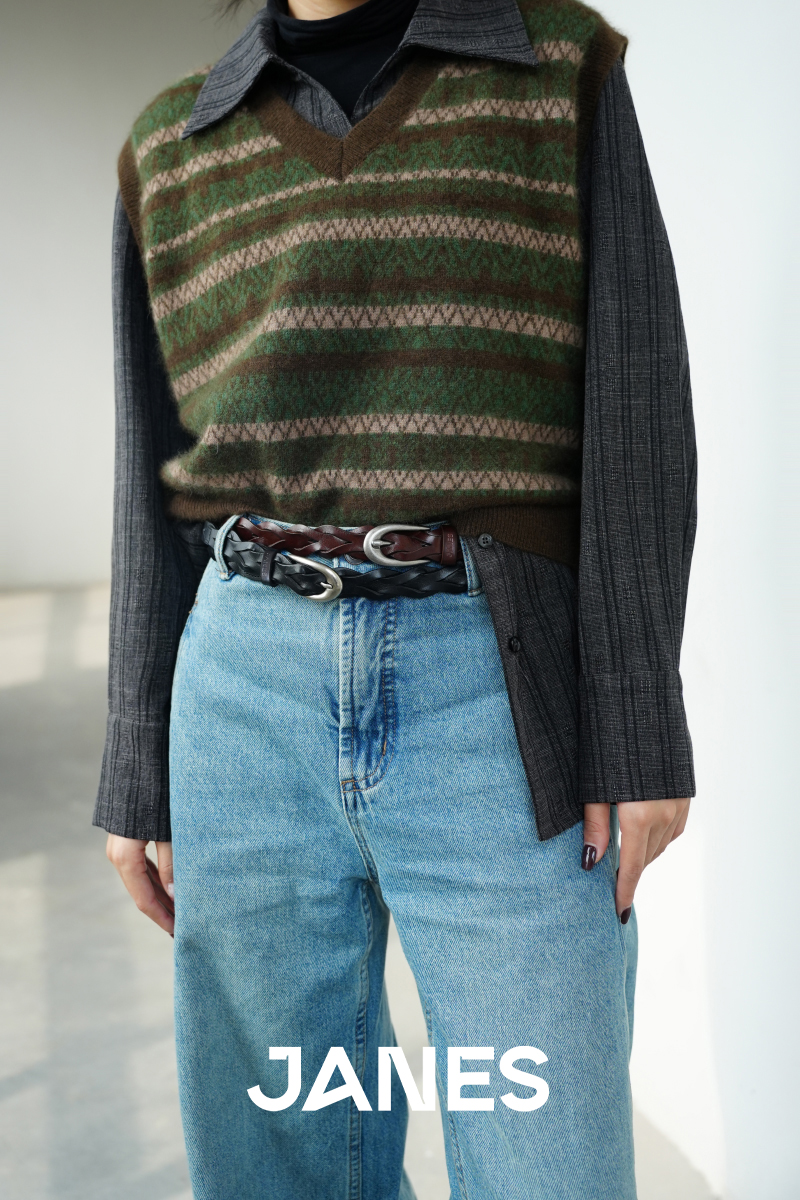 JANES·简束[巴恩风]复古编织腰带头层牛皮简约款小众植鞣皮女士皮带