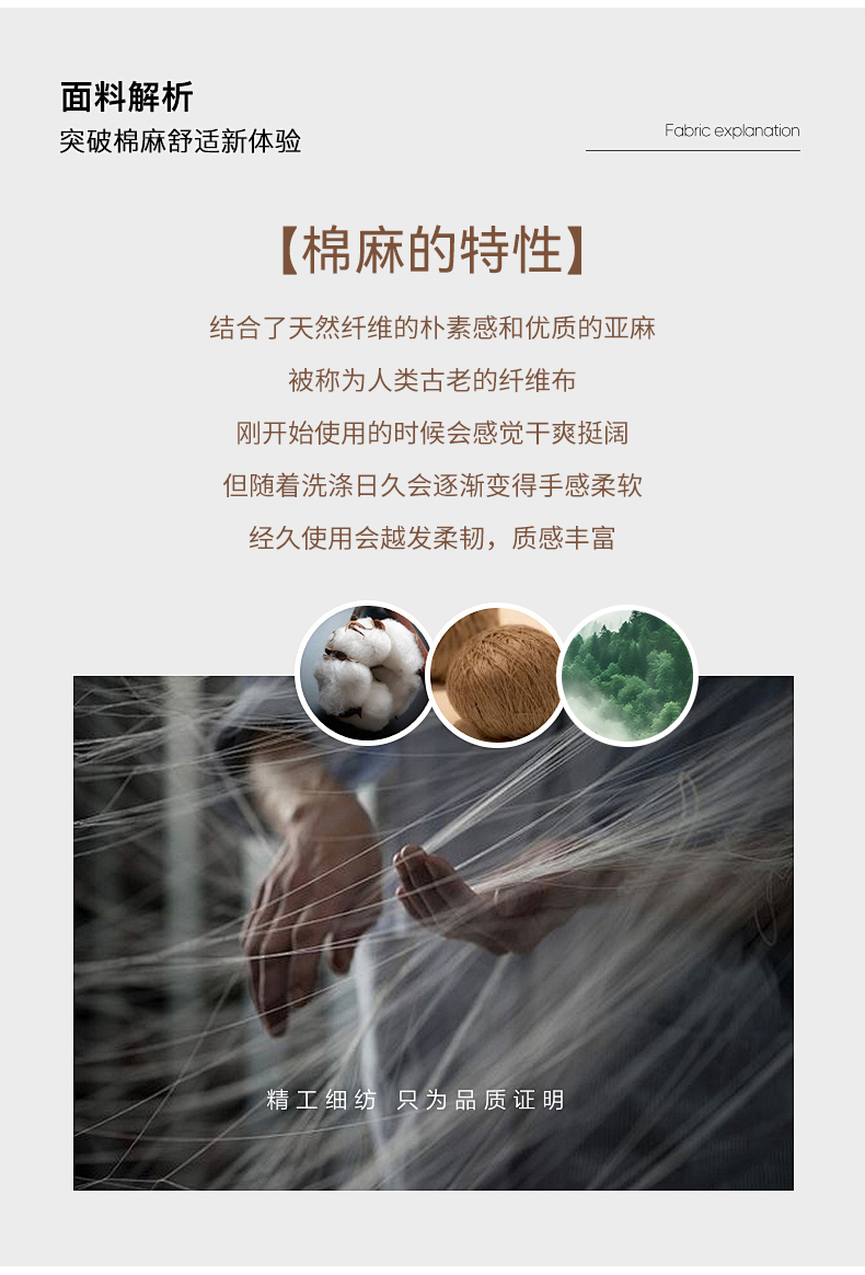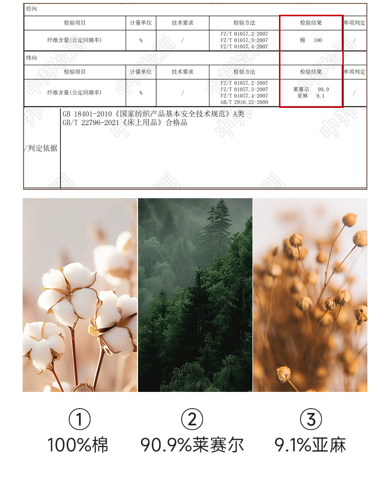 面料:径向 100%棉;纬向90.9莱赛尔%+9.1%亚麻