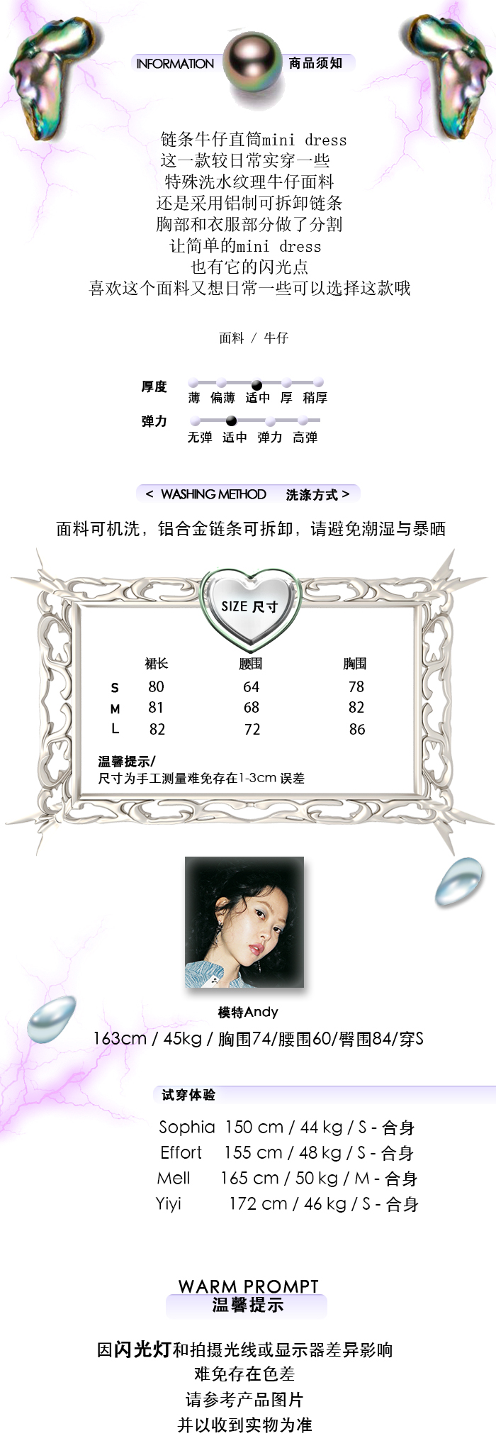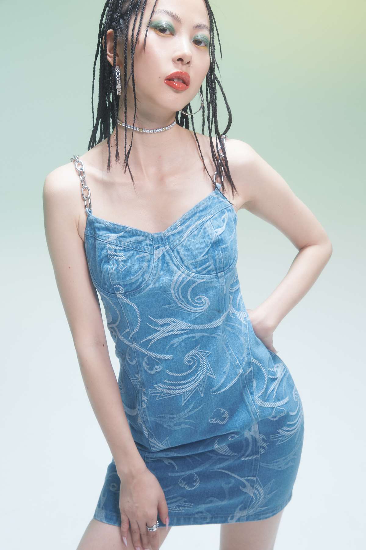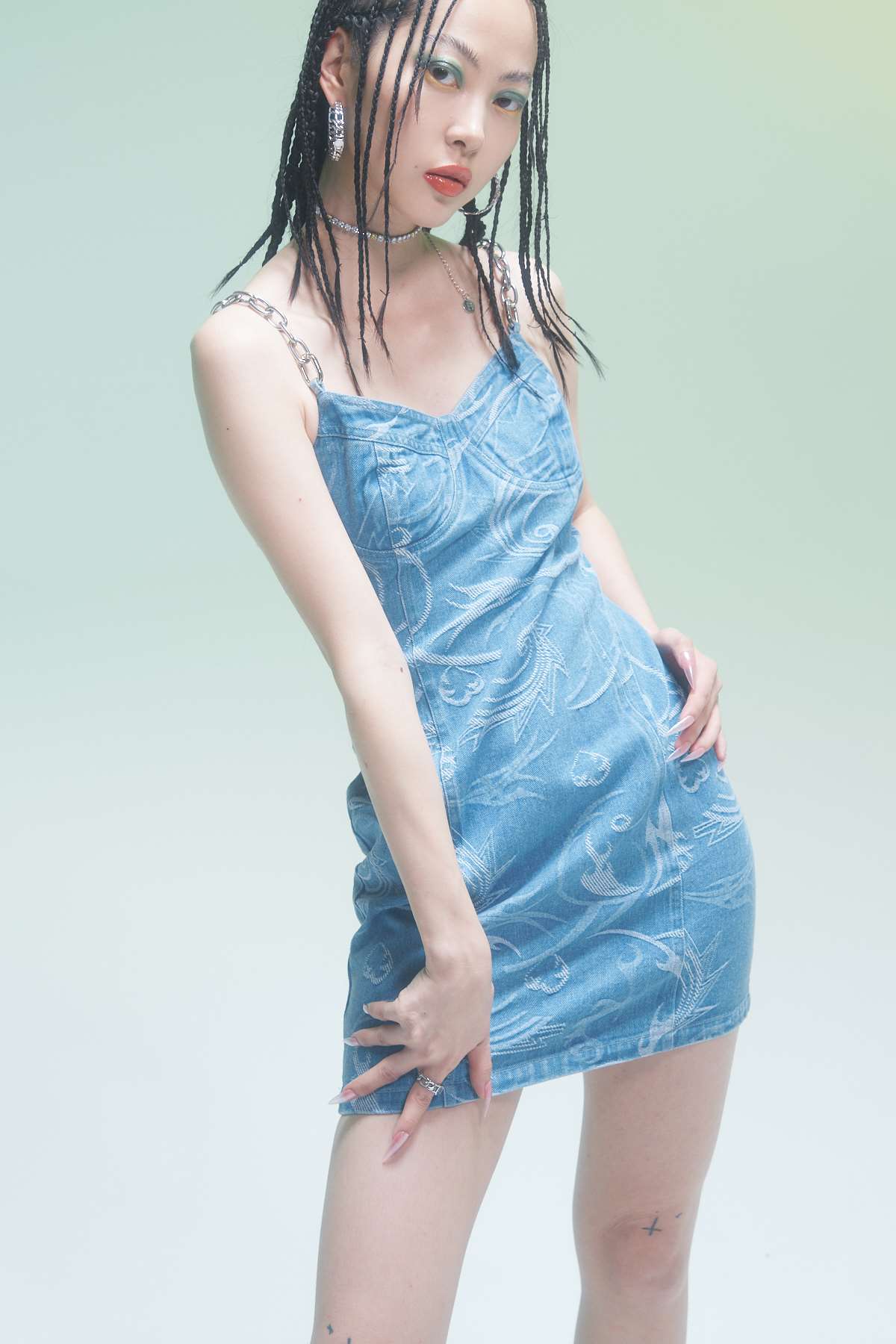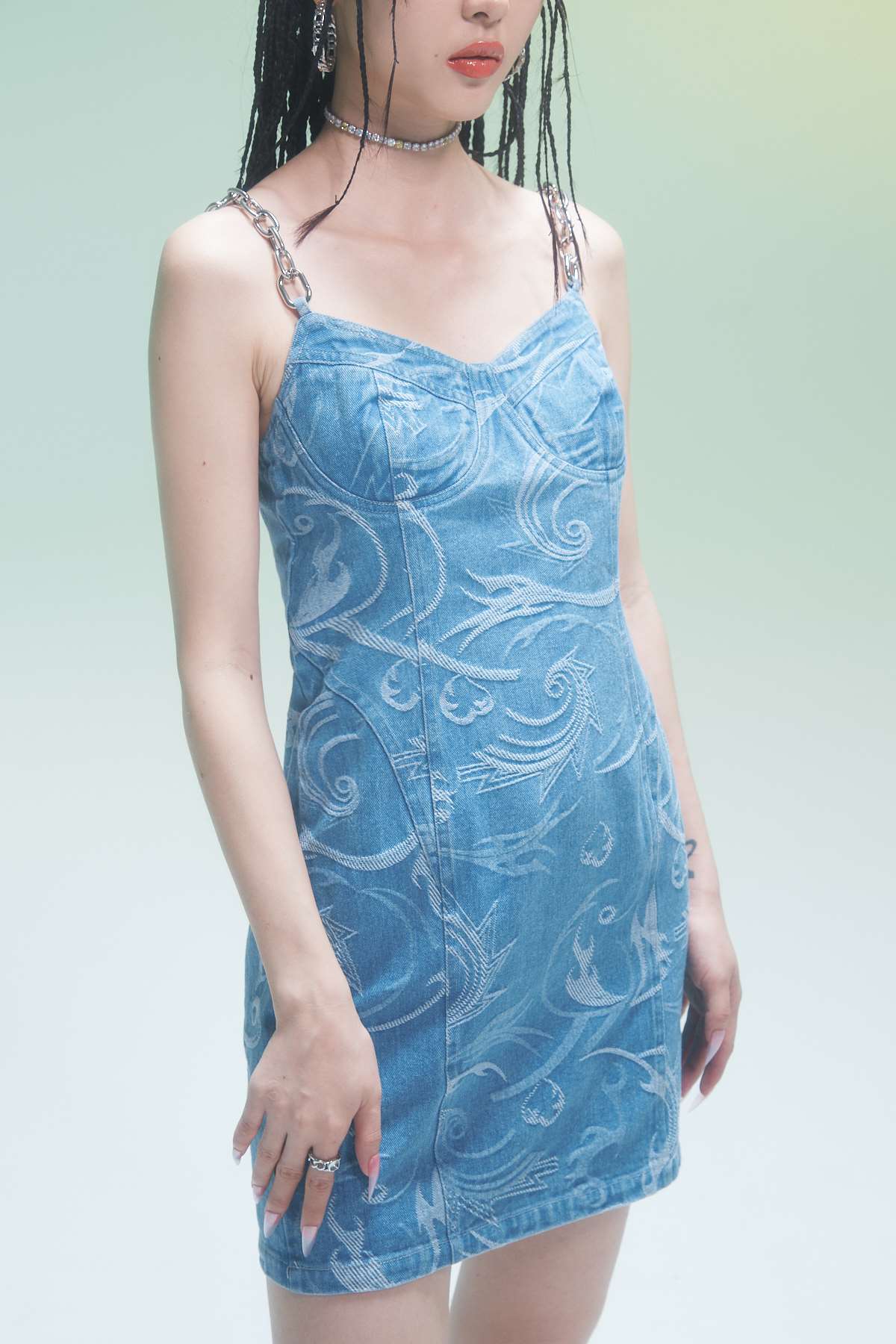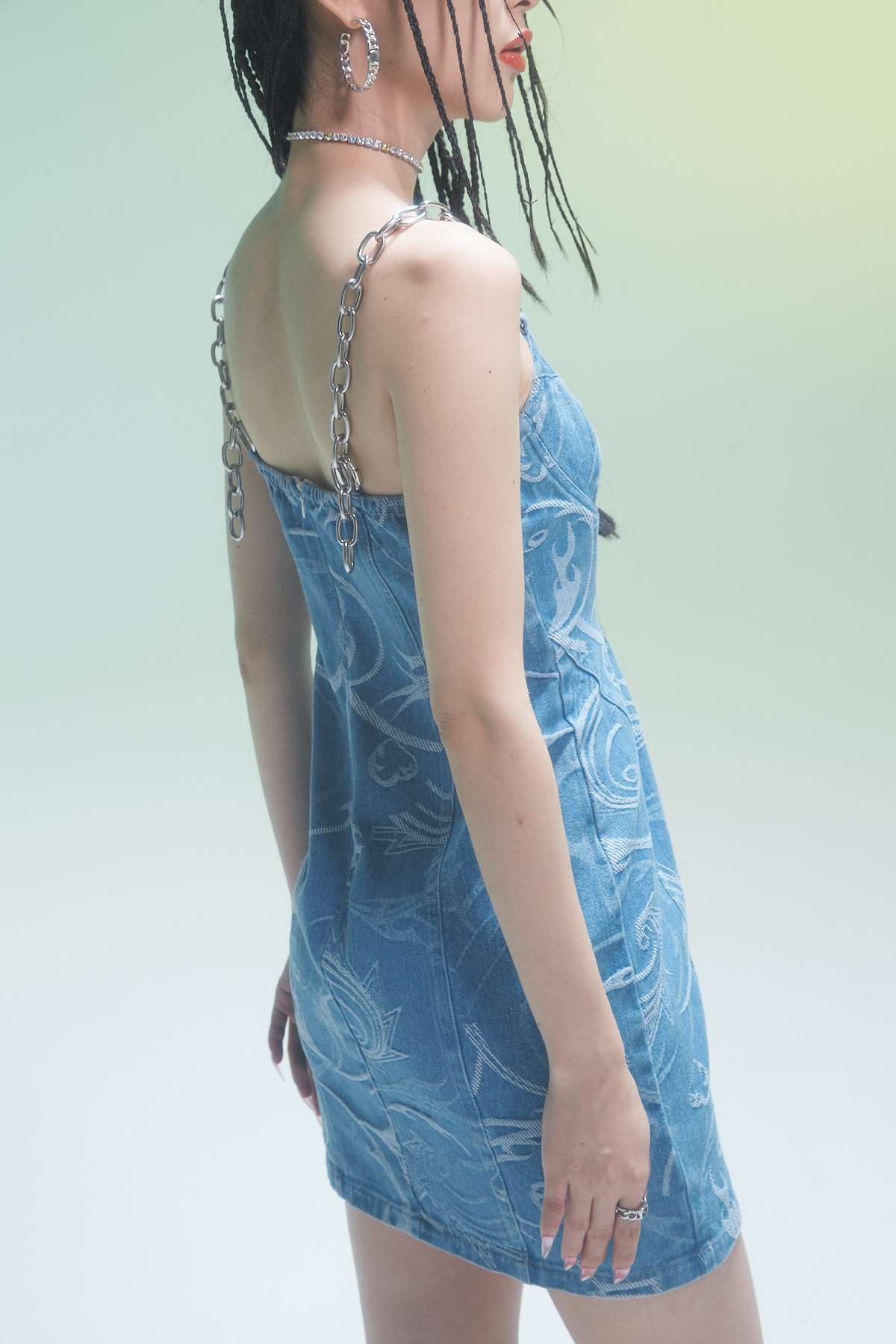 EhK 新色 设计感高腰蓝色提花 牛仔链条吊带夏季新款连衣裙女
