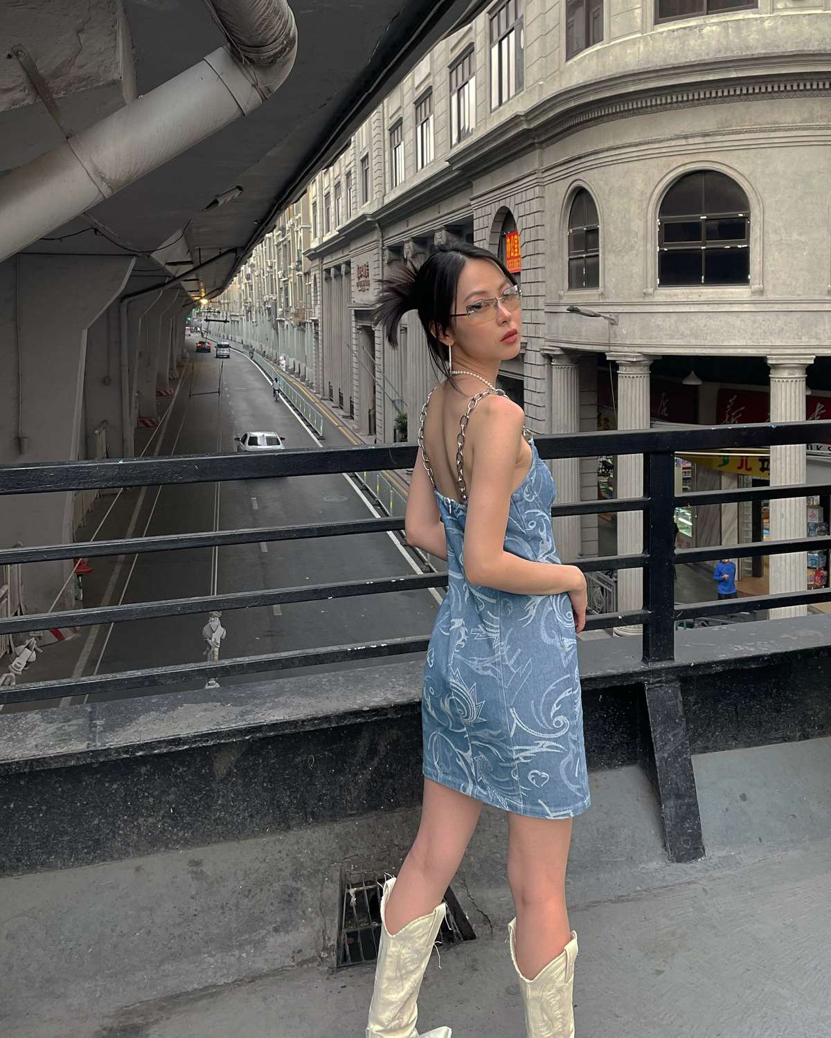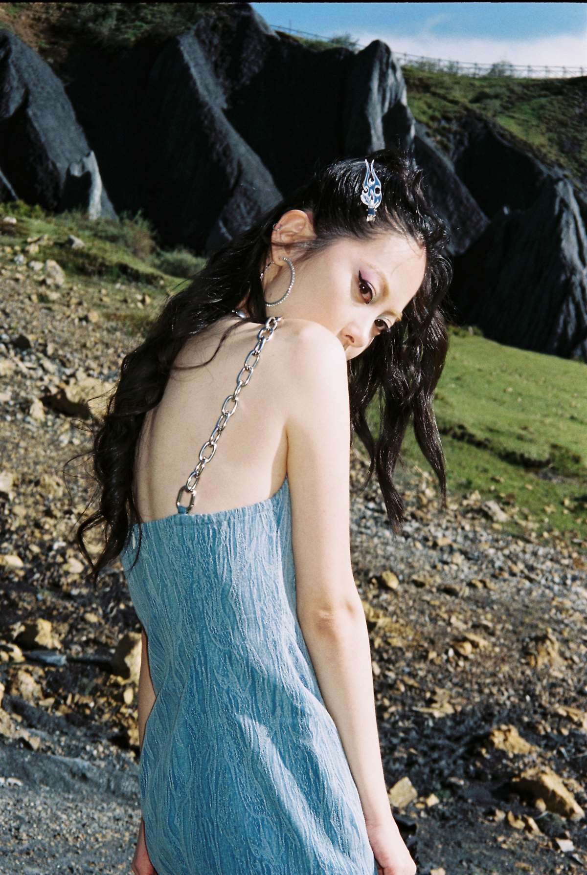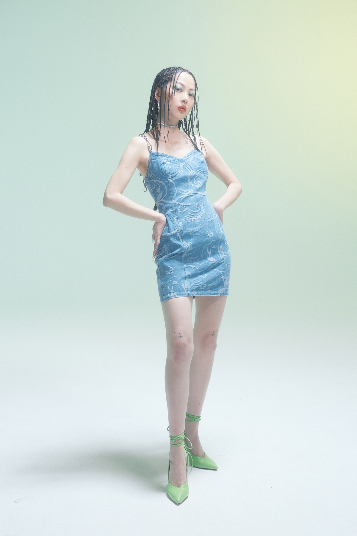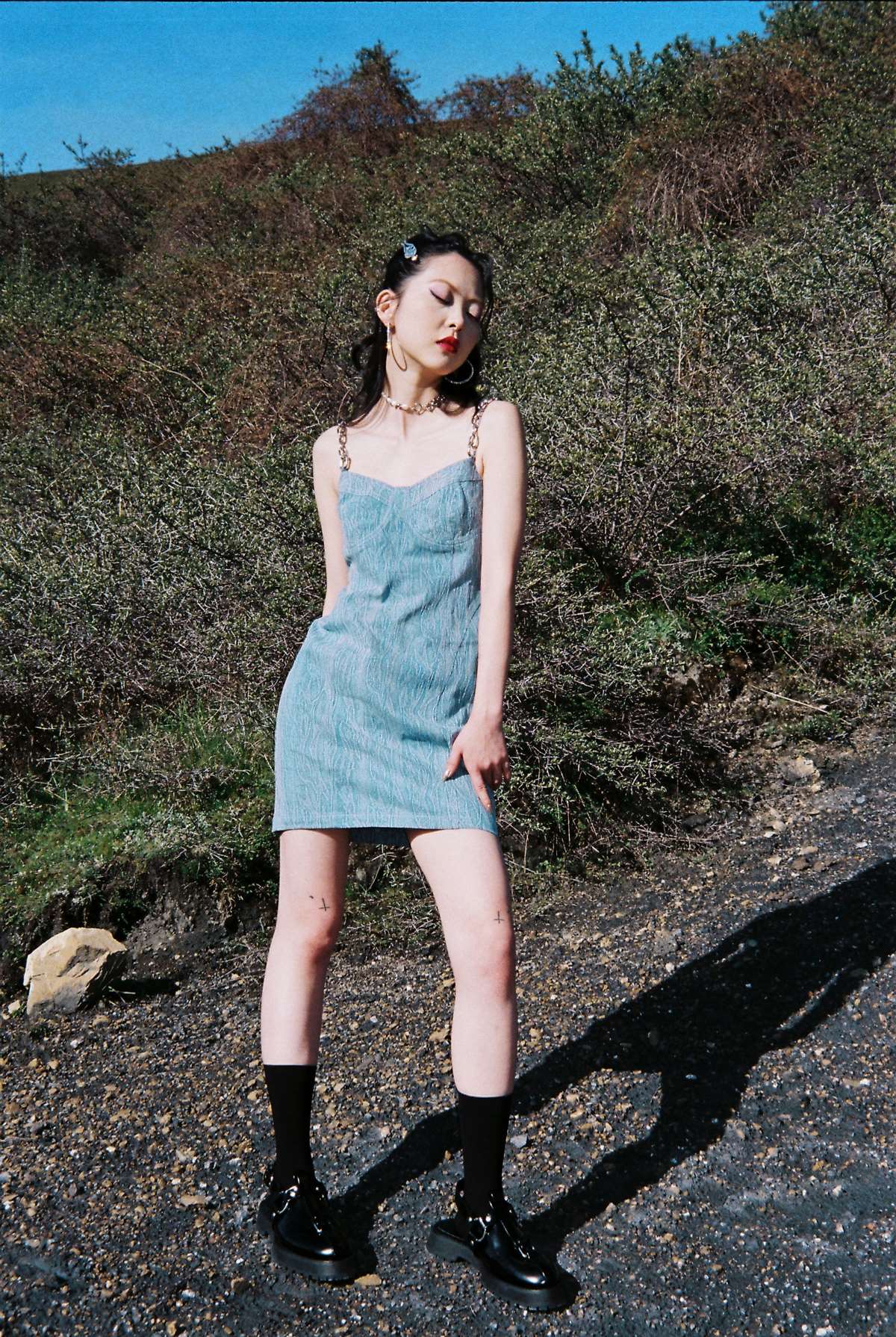 EhK 新色 设计感高腰蓝色提花 牛仔链条吊带夏季新款连衣裙女