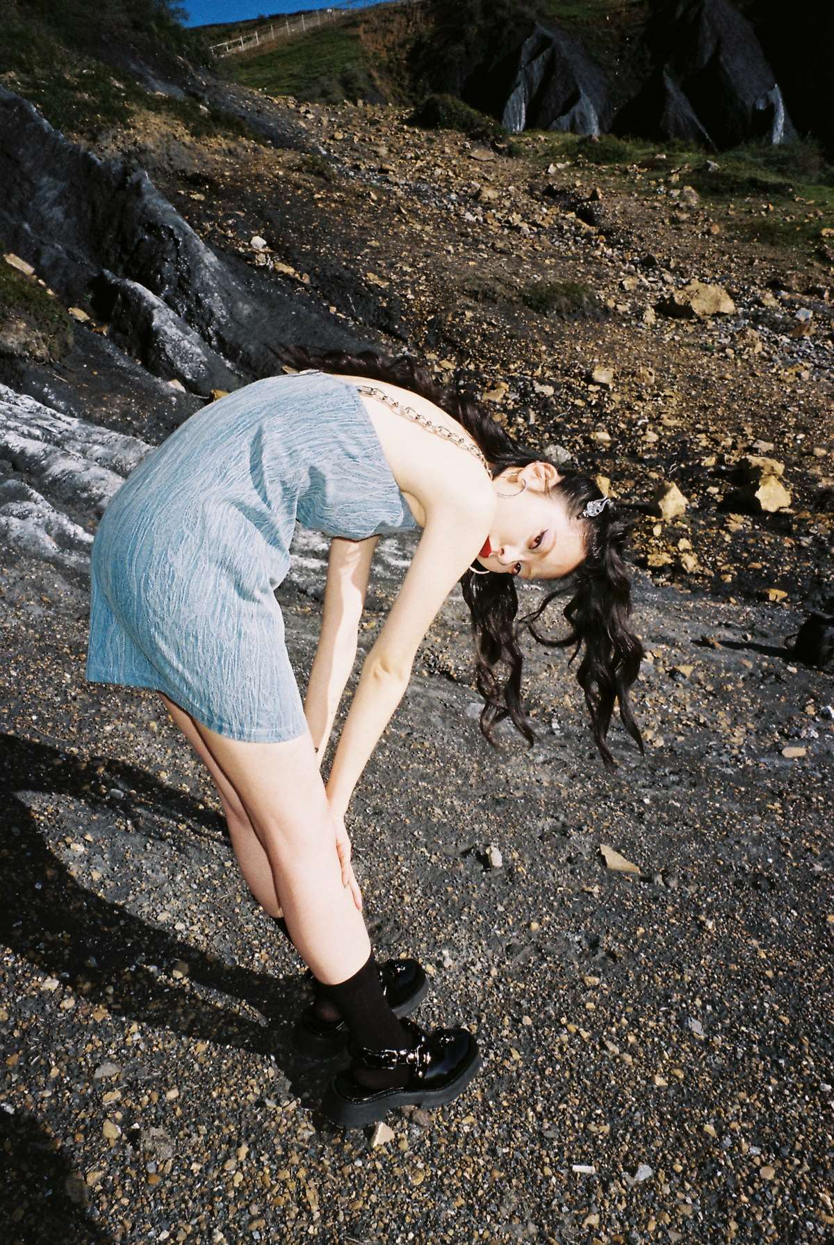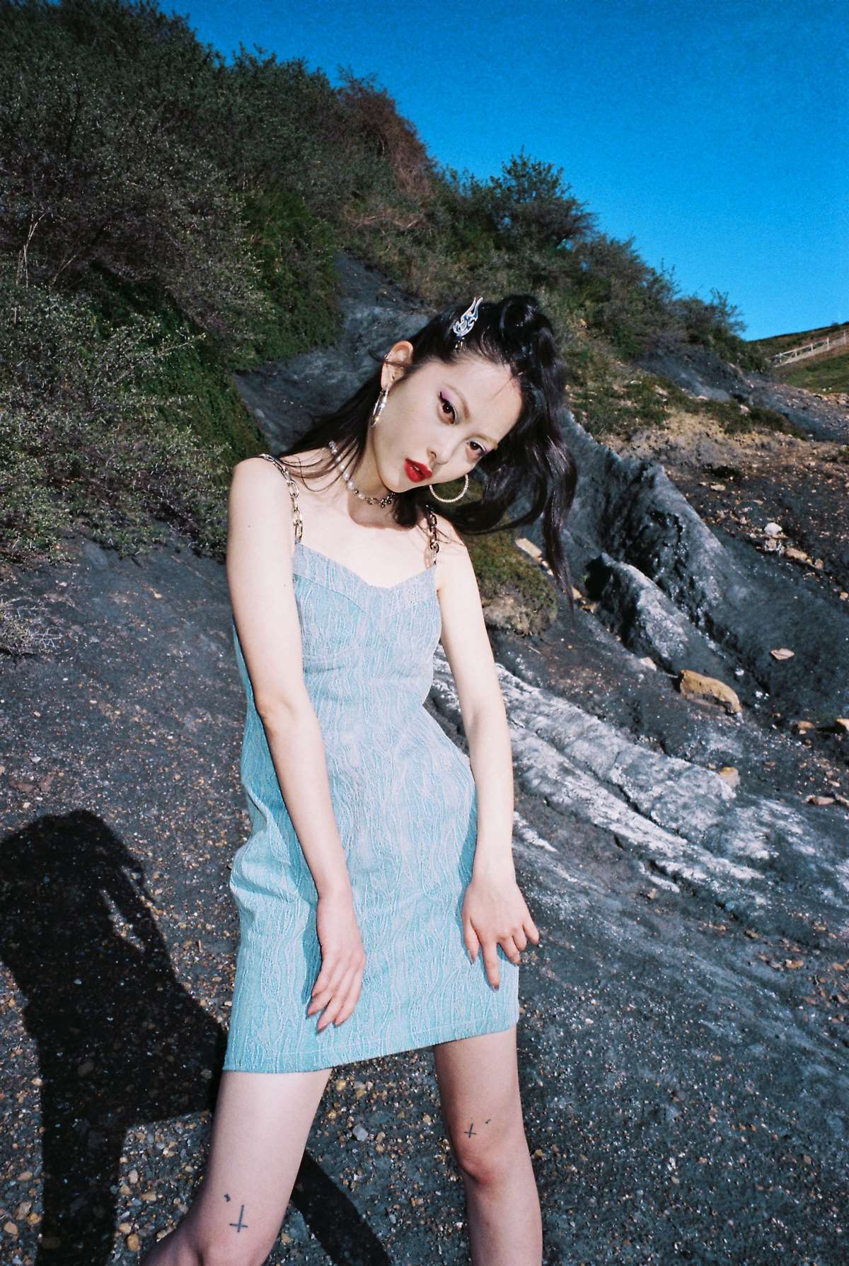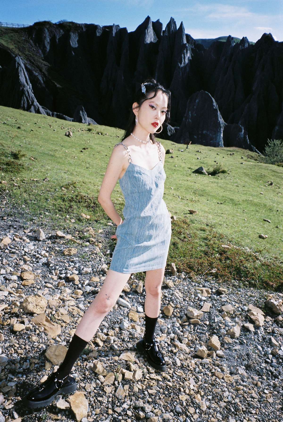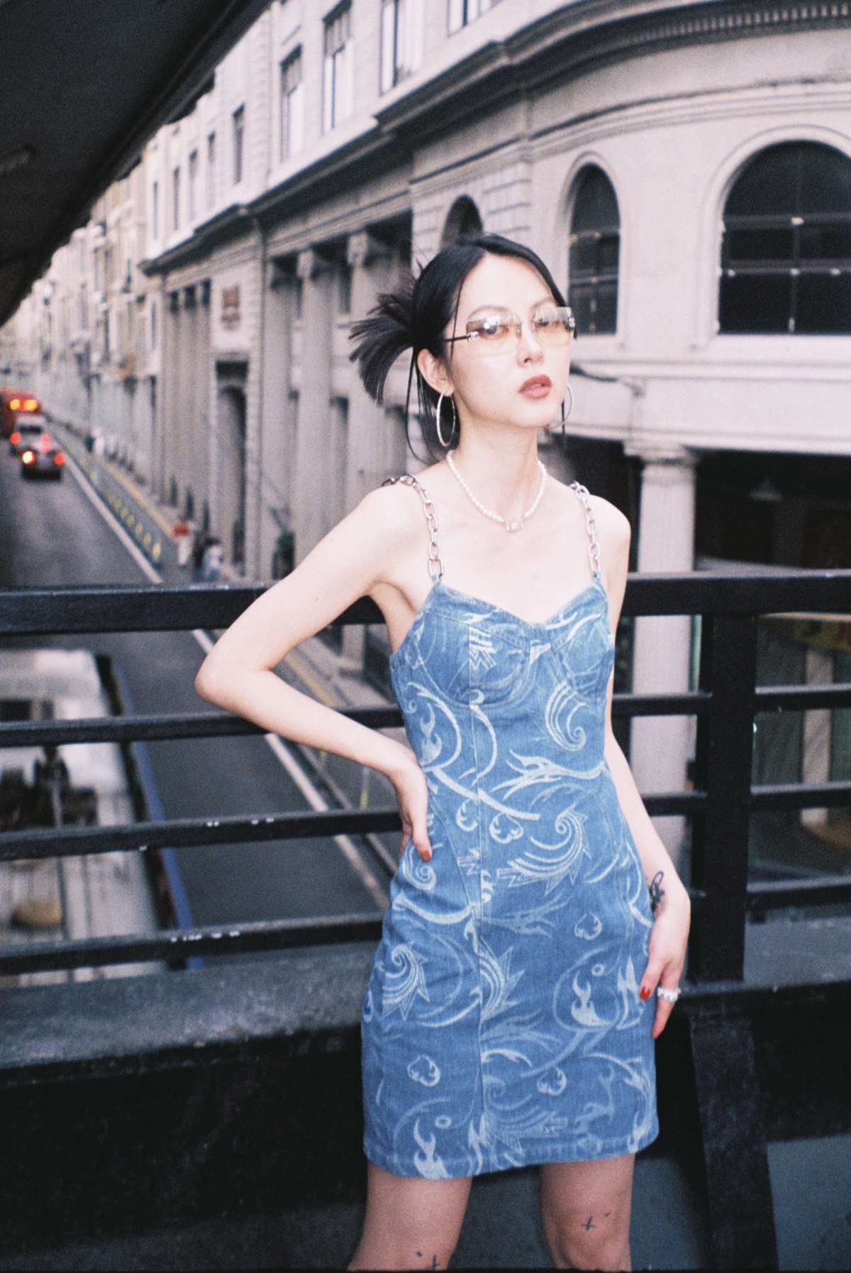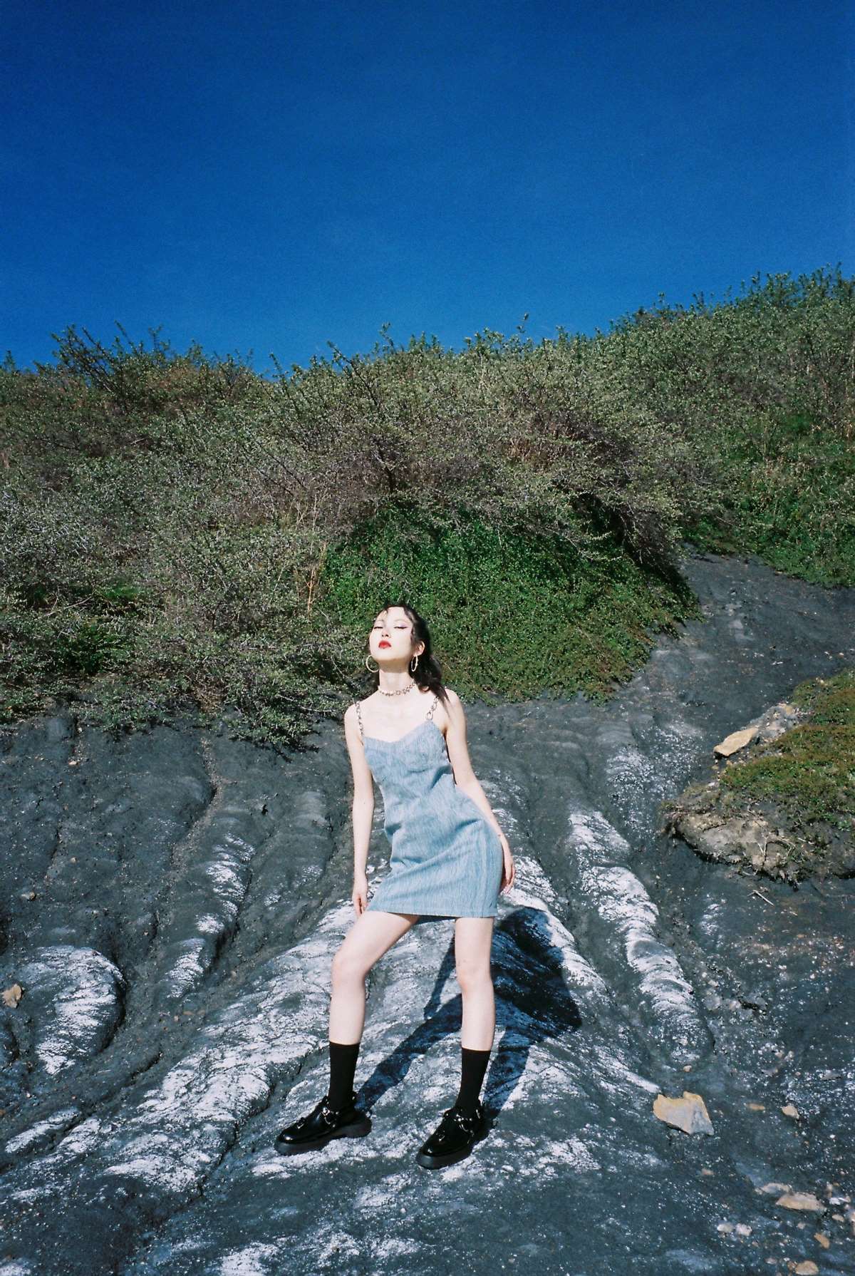 EhK 新色 设计感高腰蓝色提花 牛仔链条吊带夏季新款连衣裙女