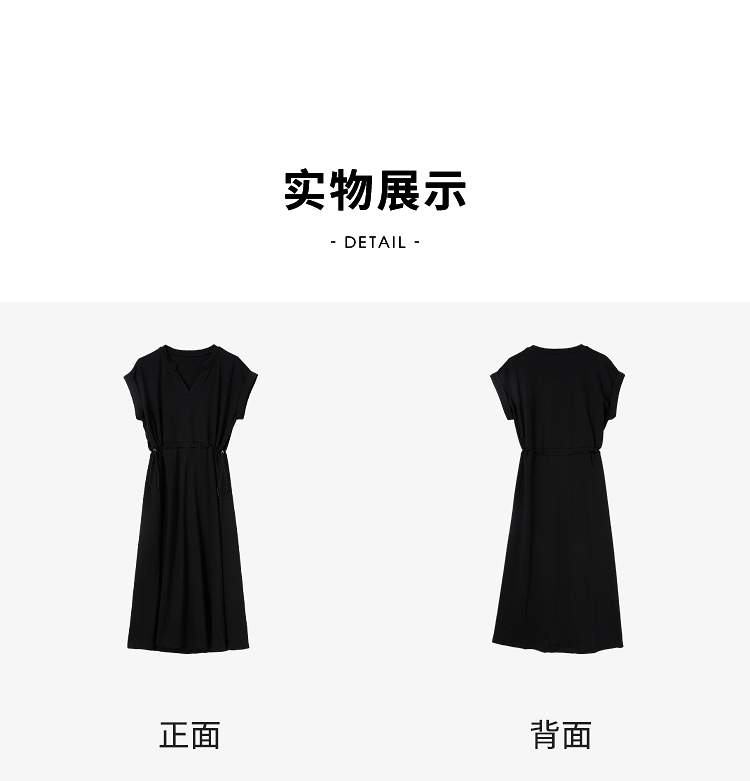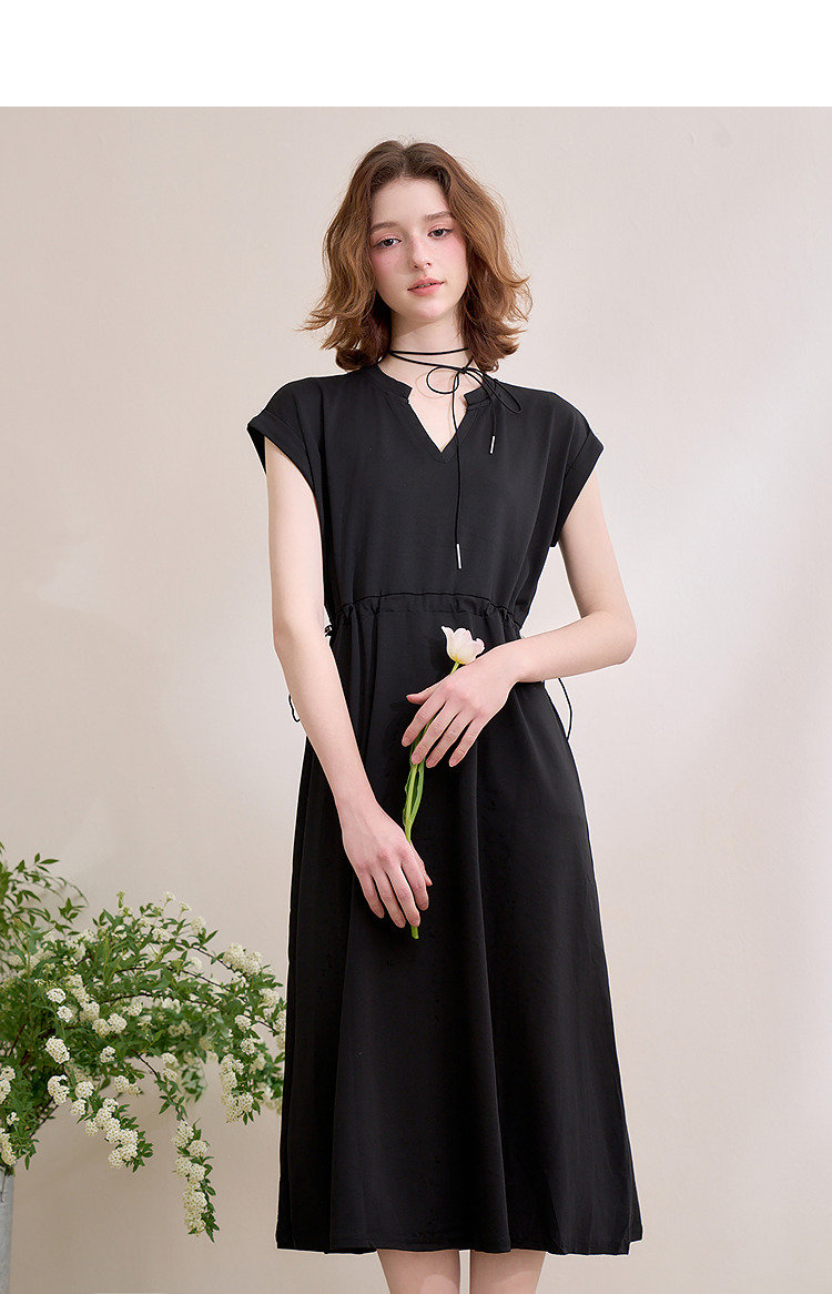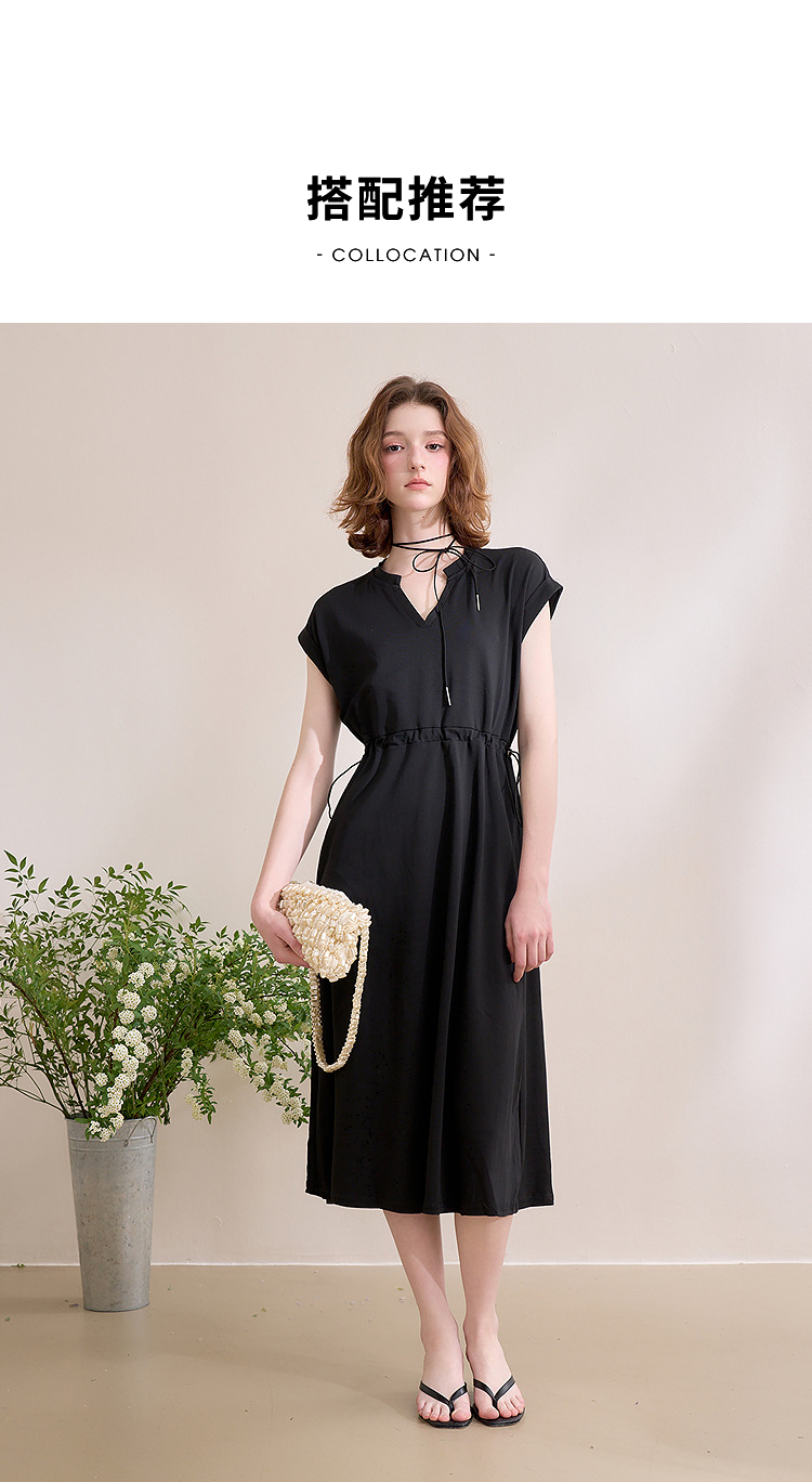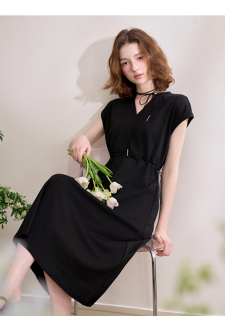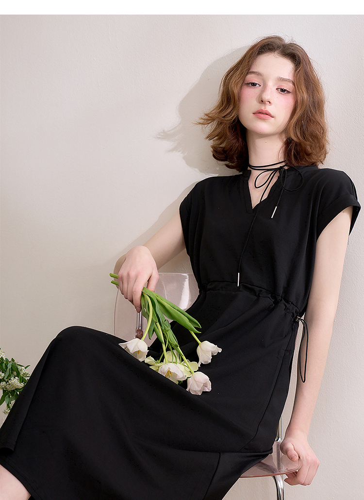 【限时秒杀】西遇黑色v领连衣裙女新款通勤a字短袖法式收腰长裙D0050475