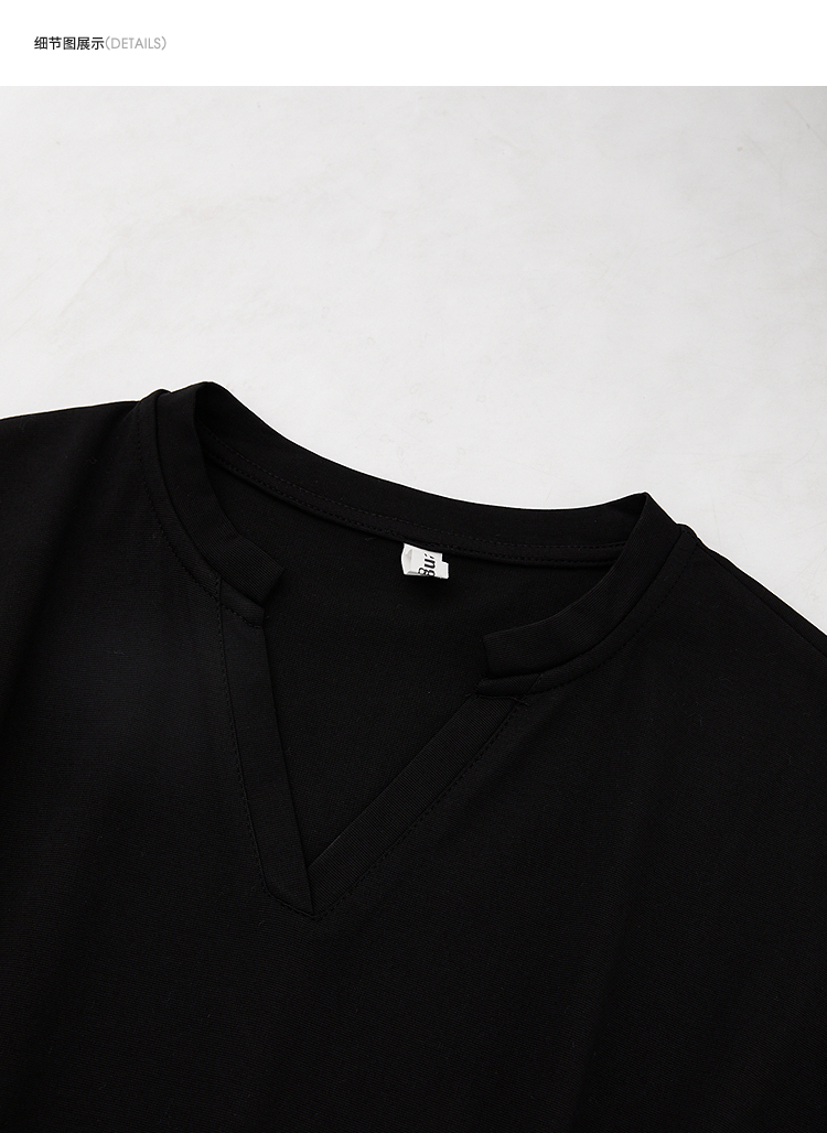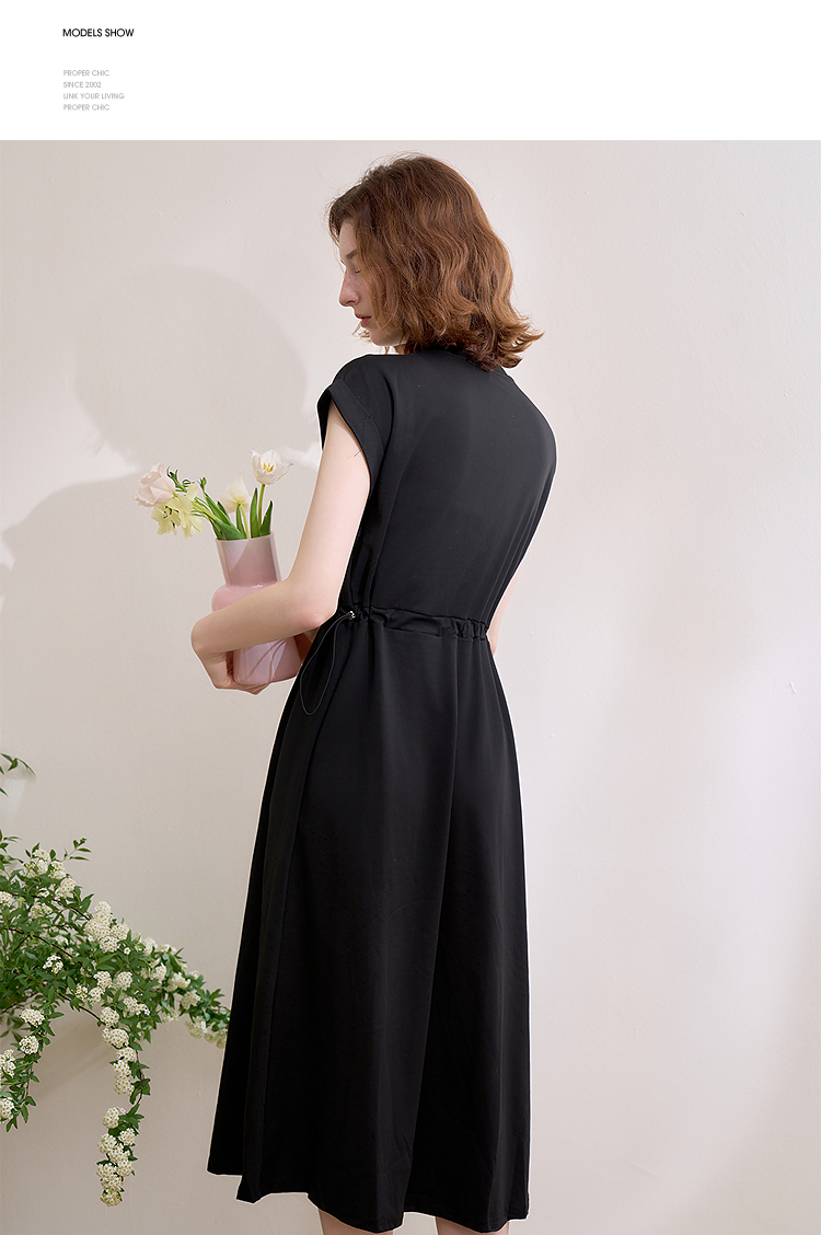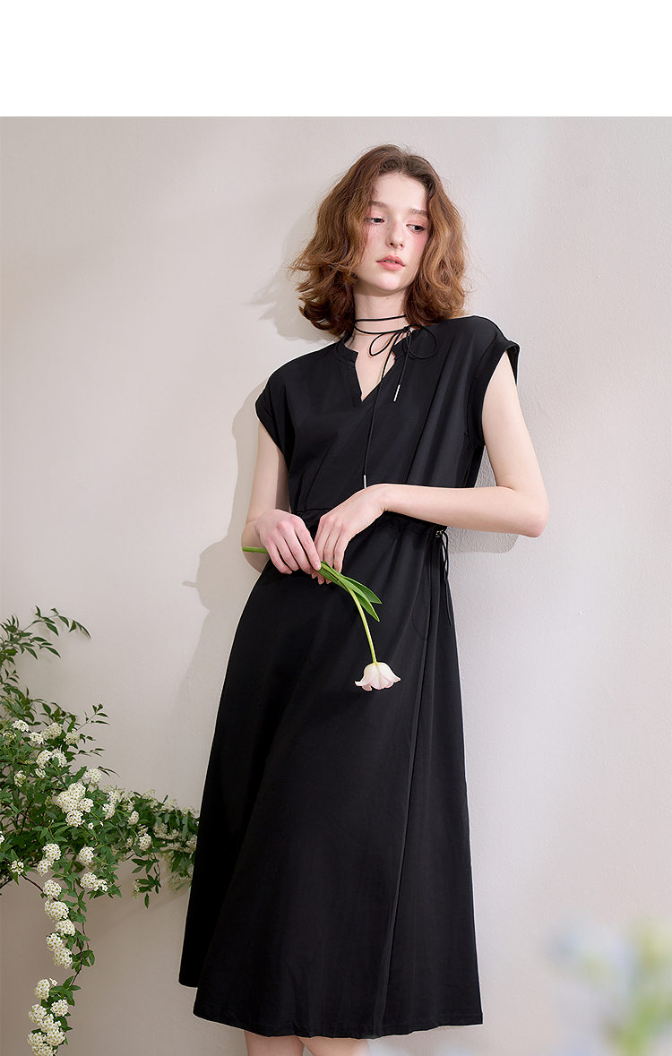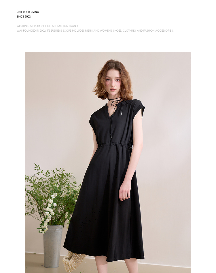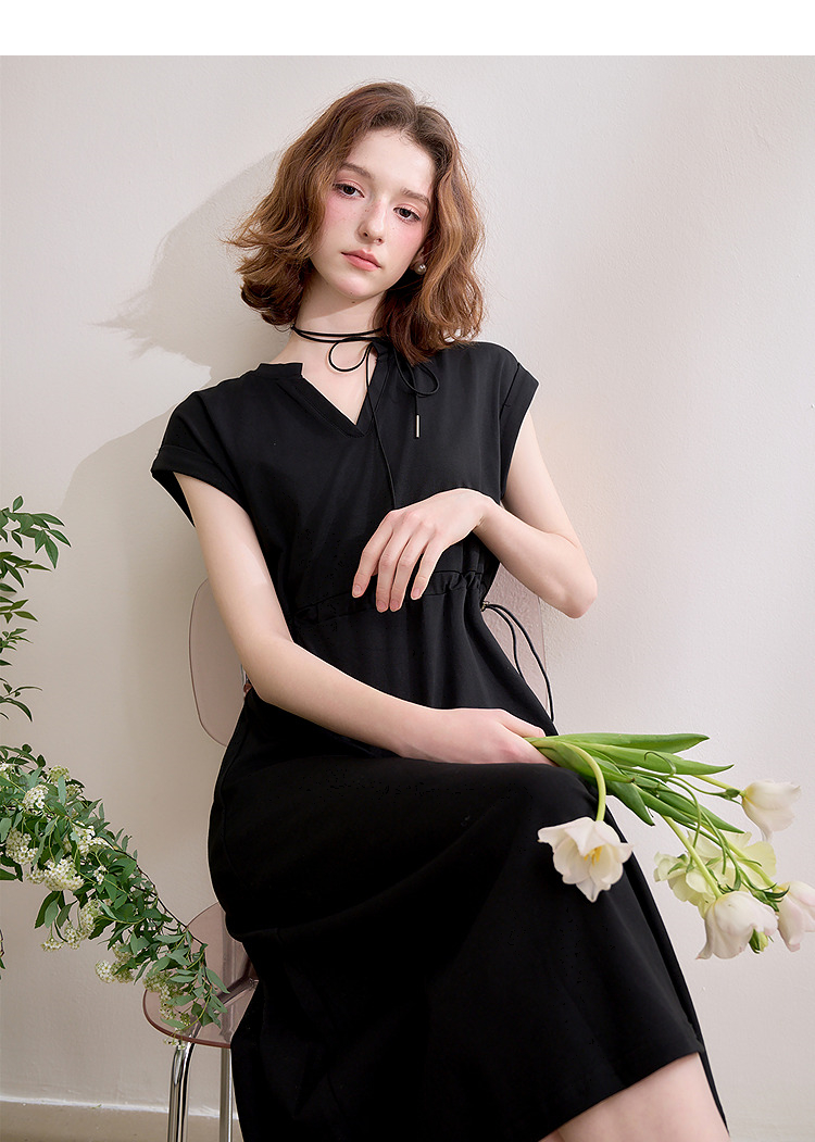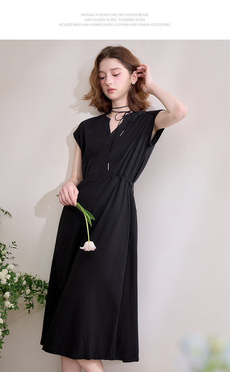 【限时秒杀】西遇黑色v领连衣裙女新款通勤a字短袖法式收腰长裙D0050475