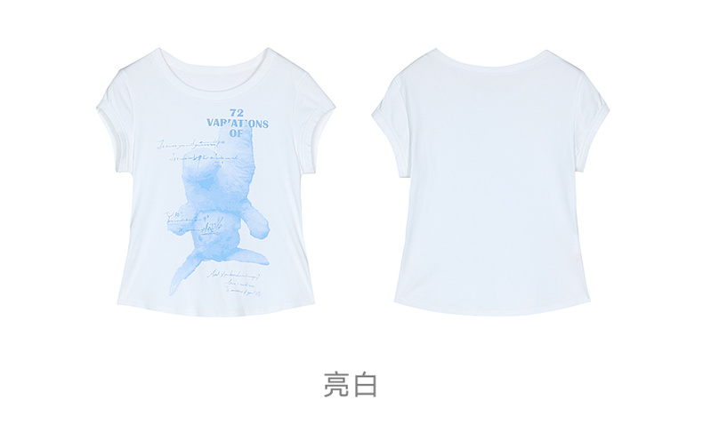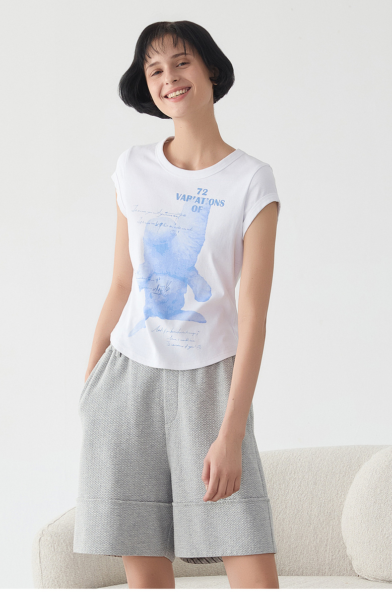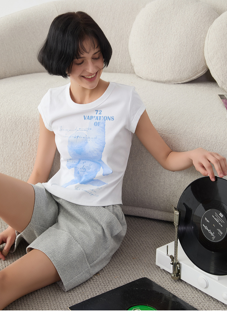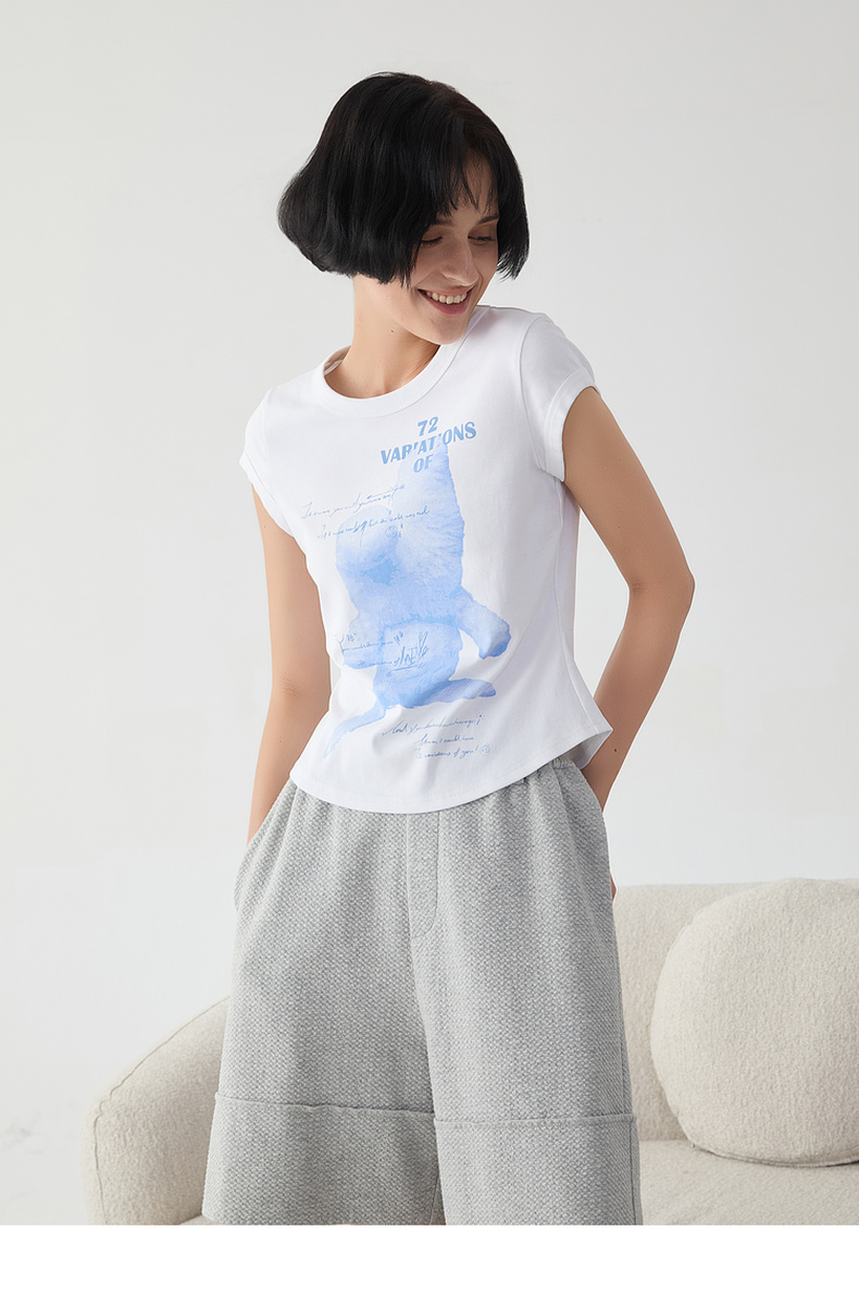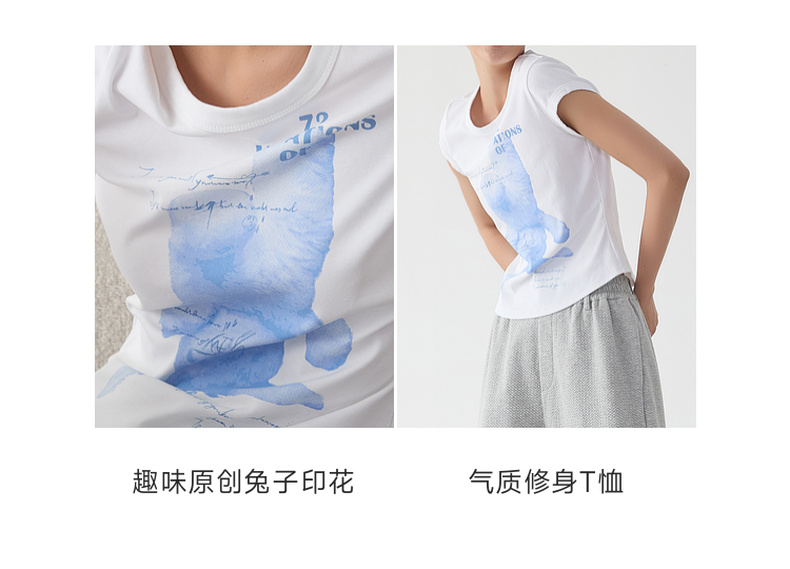 谜底印花T恤短袖女2025春季新品百搭休闲修身棉弹上衣251MT0144