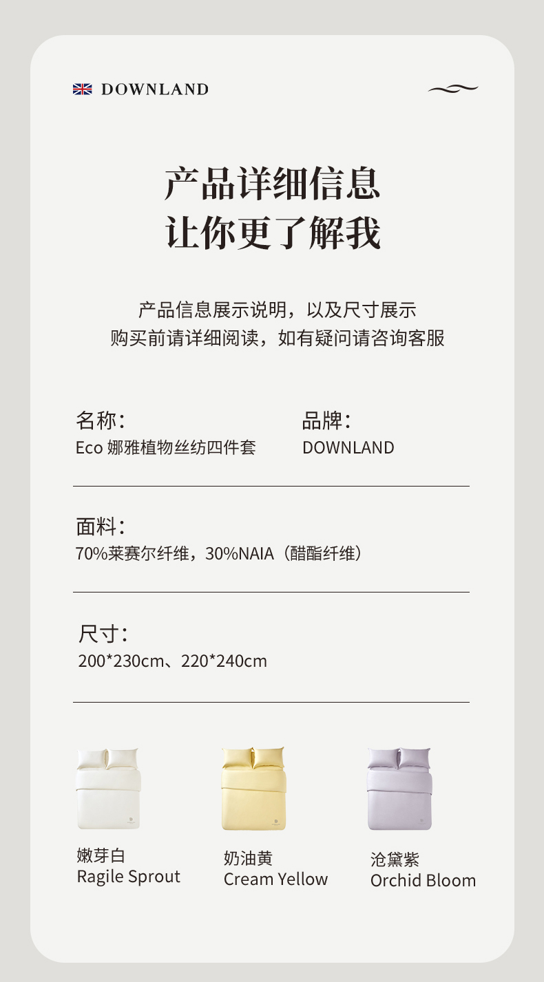预售|新款Downland Eco 娜雅植物丝纺四件套 200*230cm [福利品]