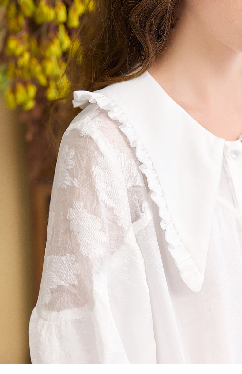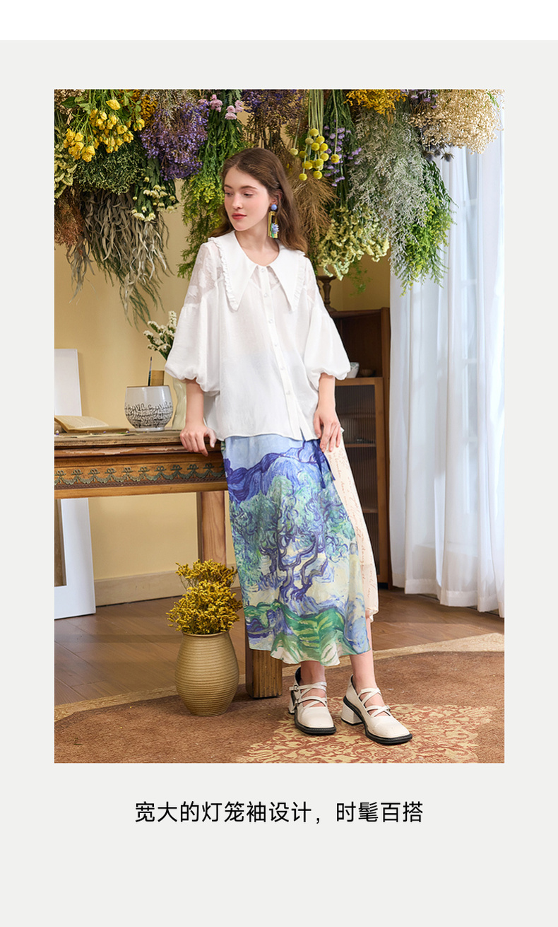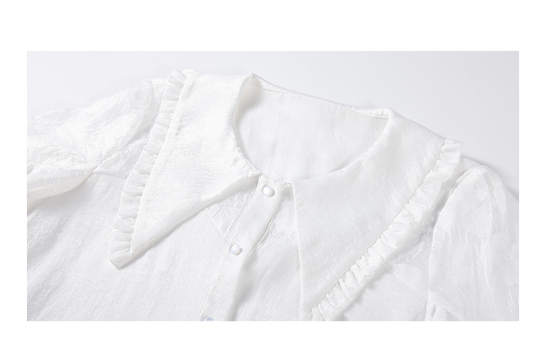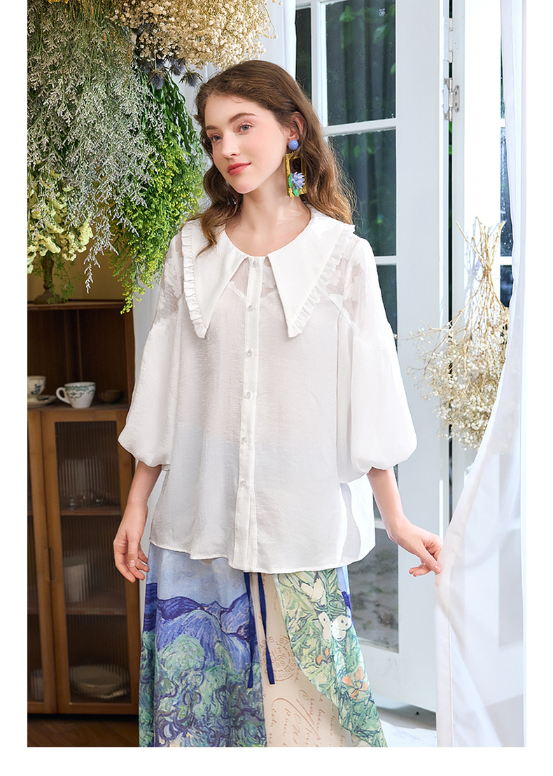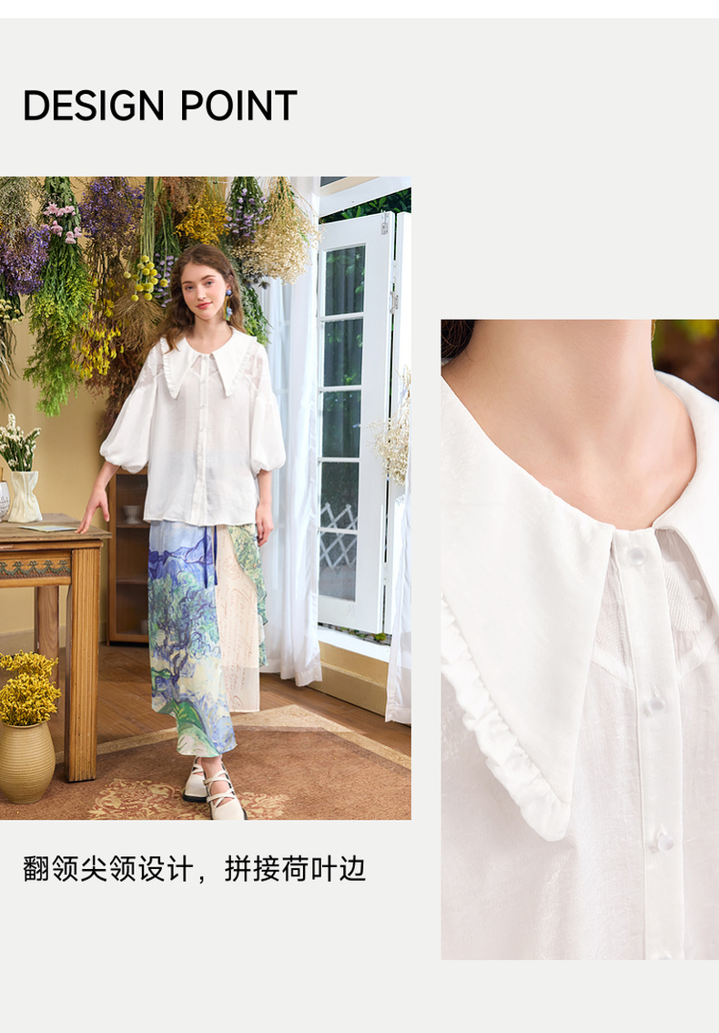 两三事 烟云轻抚 2024夏季新款甜美荷叶边大翻领灯笼袖衬衫女宽松