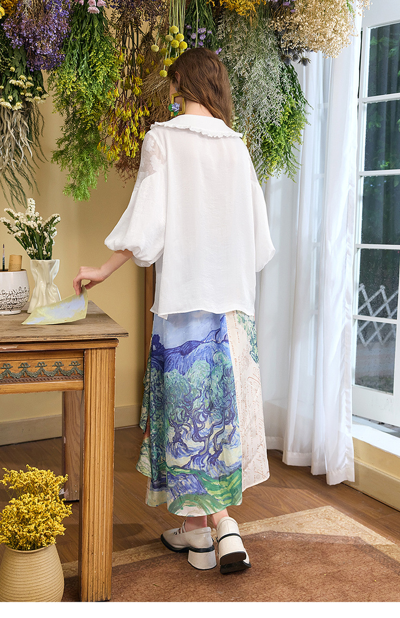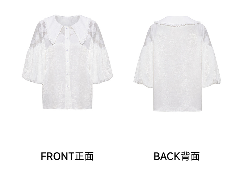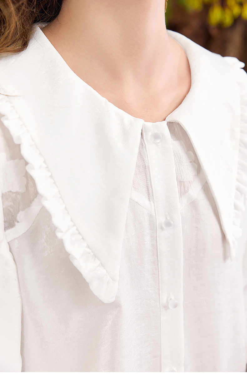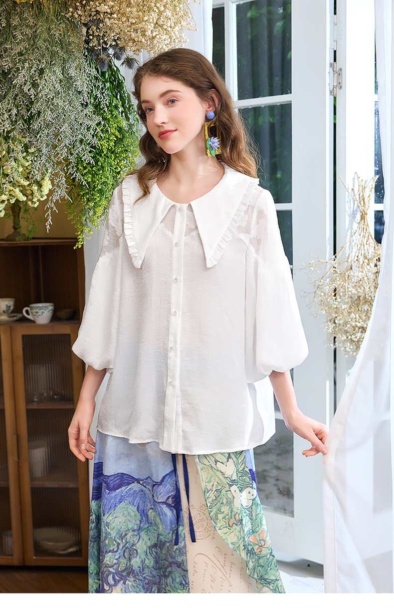 两三事 烟云轻抚 2024夏季新款甜美荷叶边大翻领灯笼袖衬衫女宽松