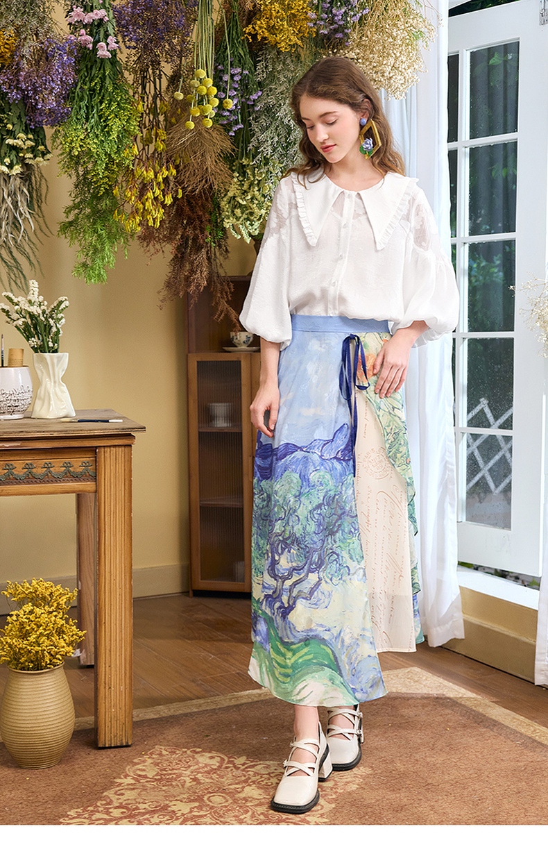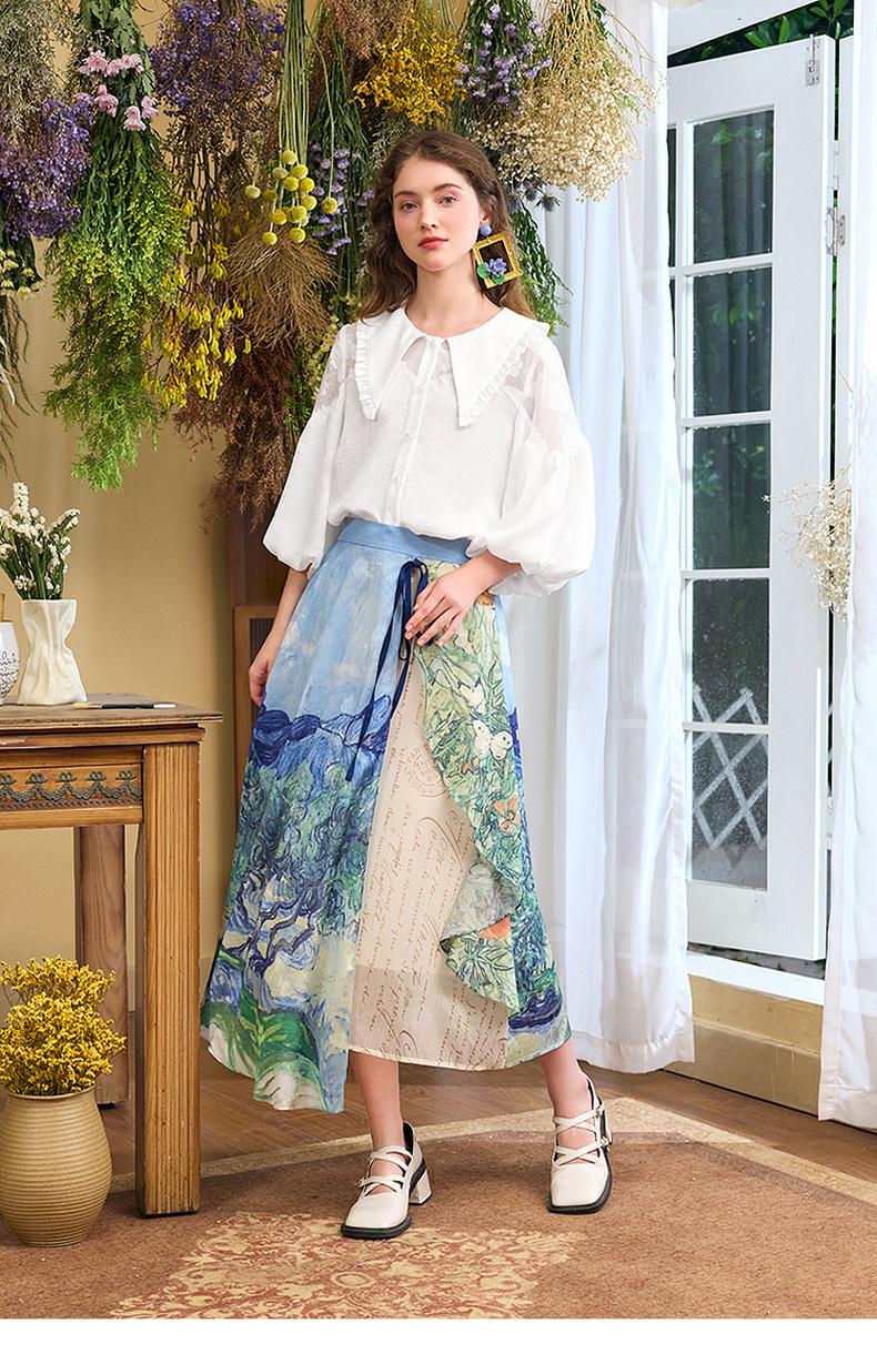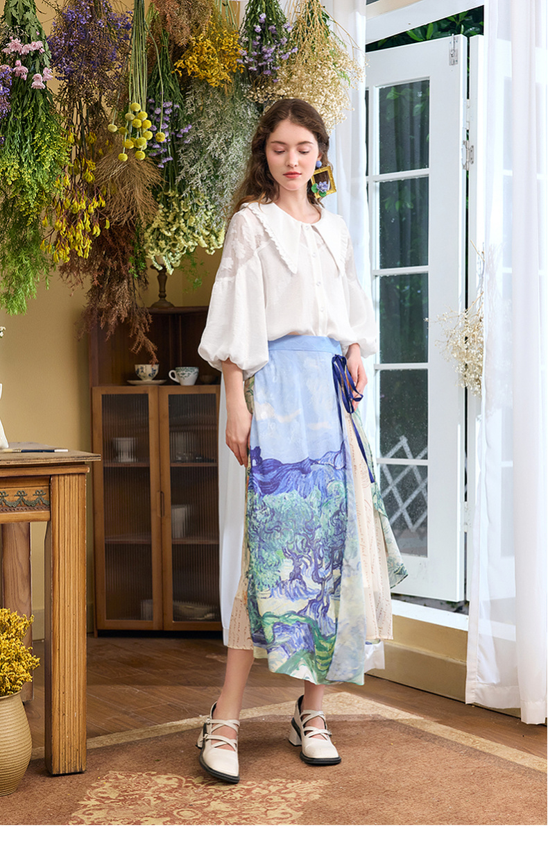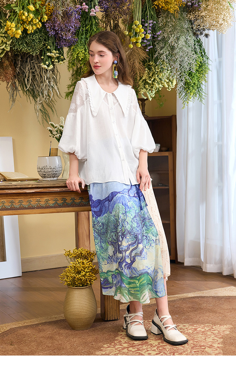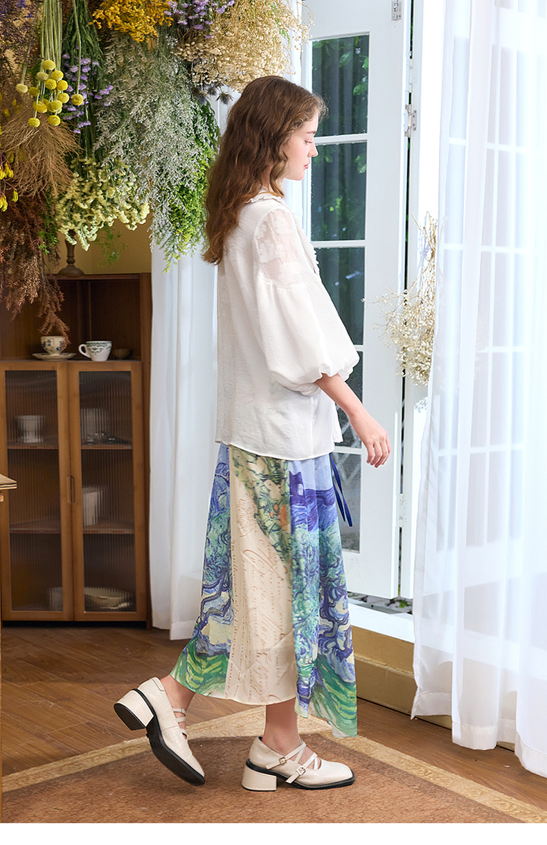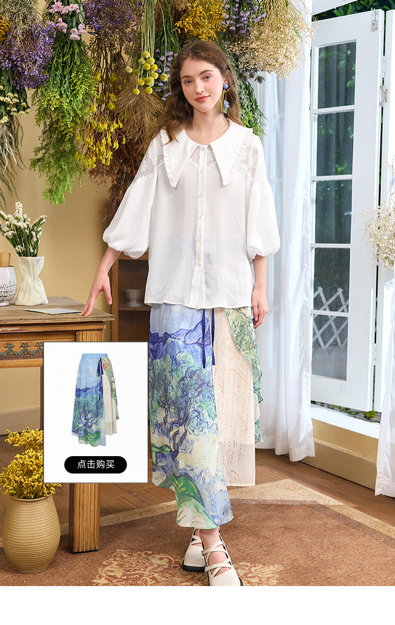 两三事 蜜夏神谕 2025春季新款文艺风蝴蝶结大翻领印花衬衫女宽松