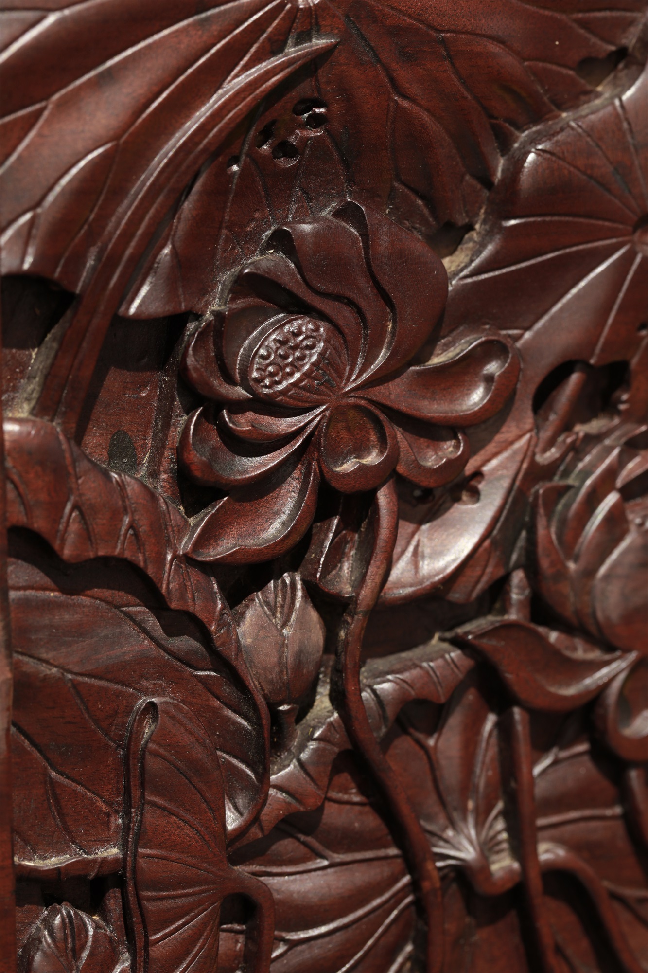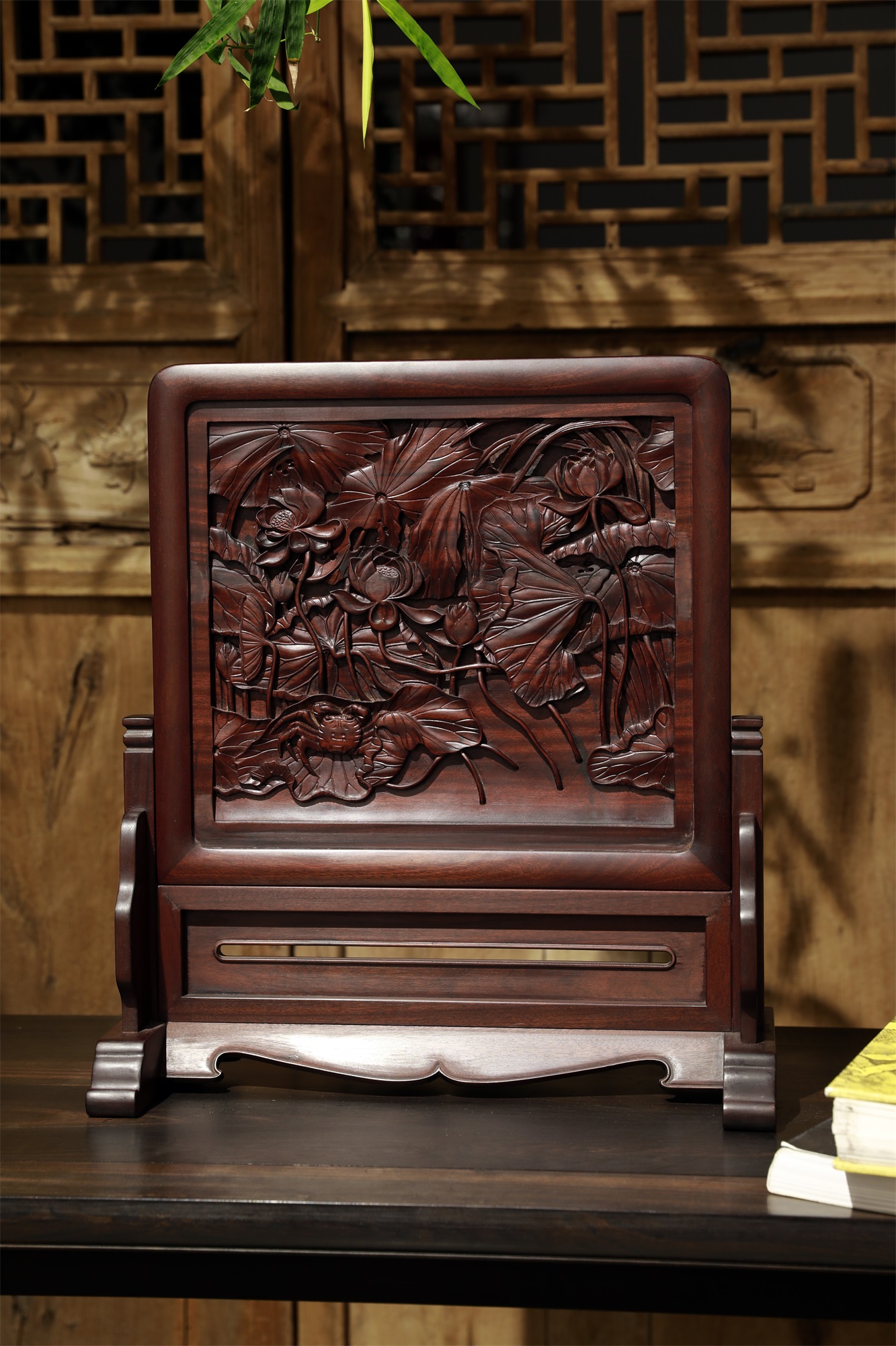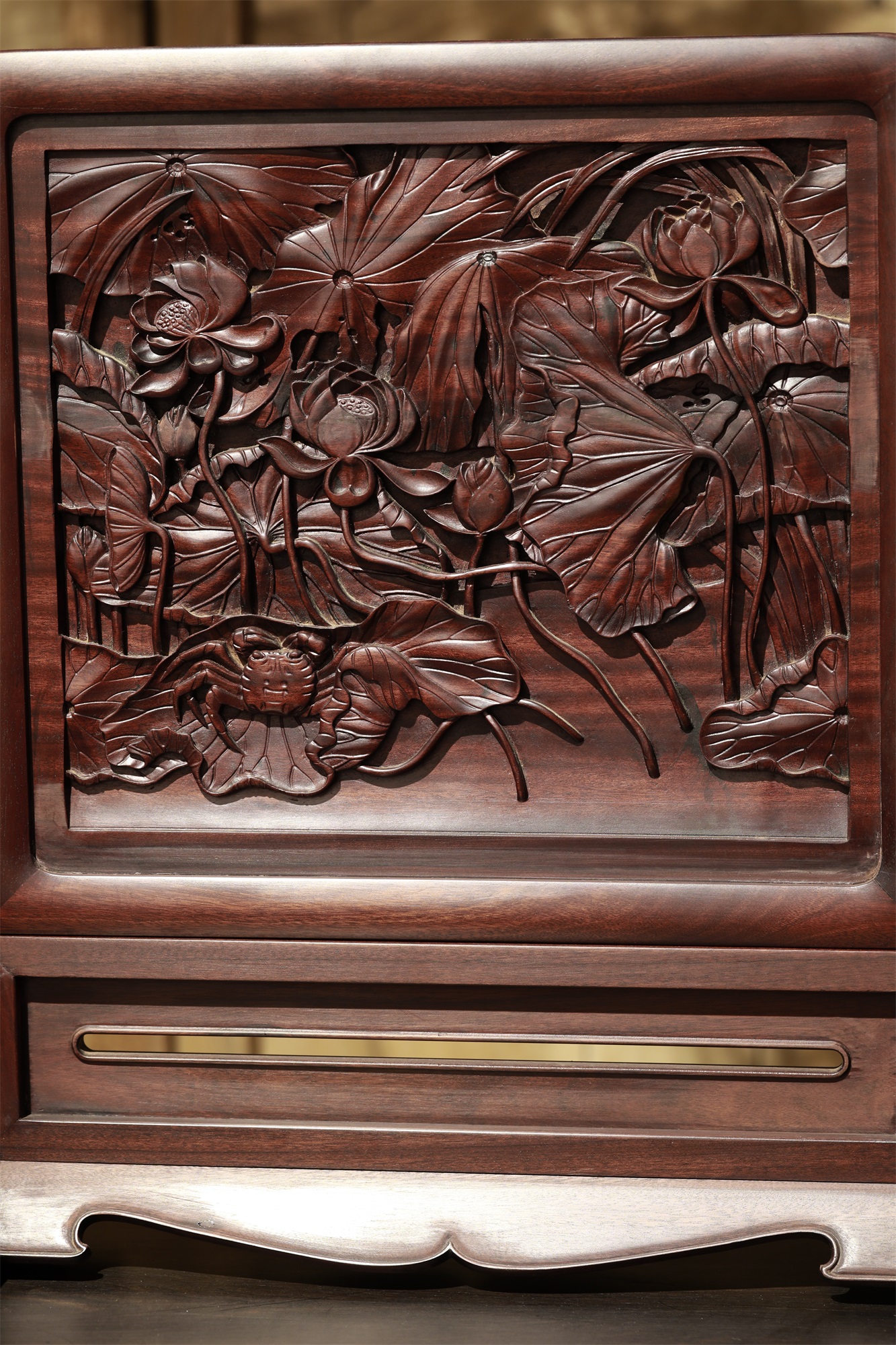 作品采用徽州传统手工艺雕刻而成。方寸间荷花枝干灵动,穿插有致,花与叶的层次、位置、穿插、向背,繁而不乱,显示出高妙的匠意。踞于荷叶上的小螃蟹成为构图的点睛之笔,刻划自然生动细腻,增添了画面的趣味。荷花、螃蟹均为中国传统的吉祥图案。“荷”“和”谐音,赋予荷和气、和平、祥和、和合、和好的美好寓意。也承载了文人墨客的生活情趣和人文情怀。