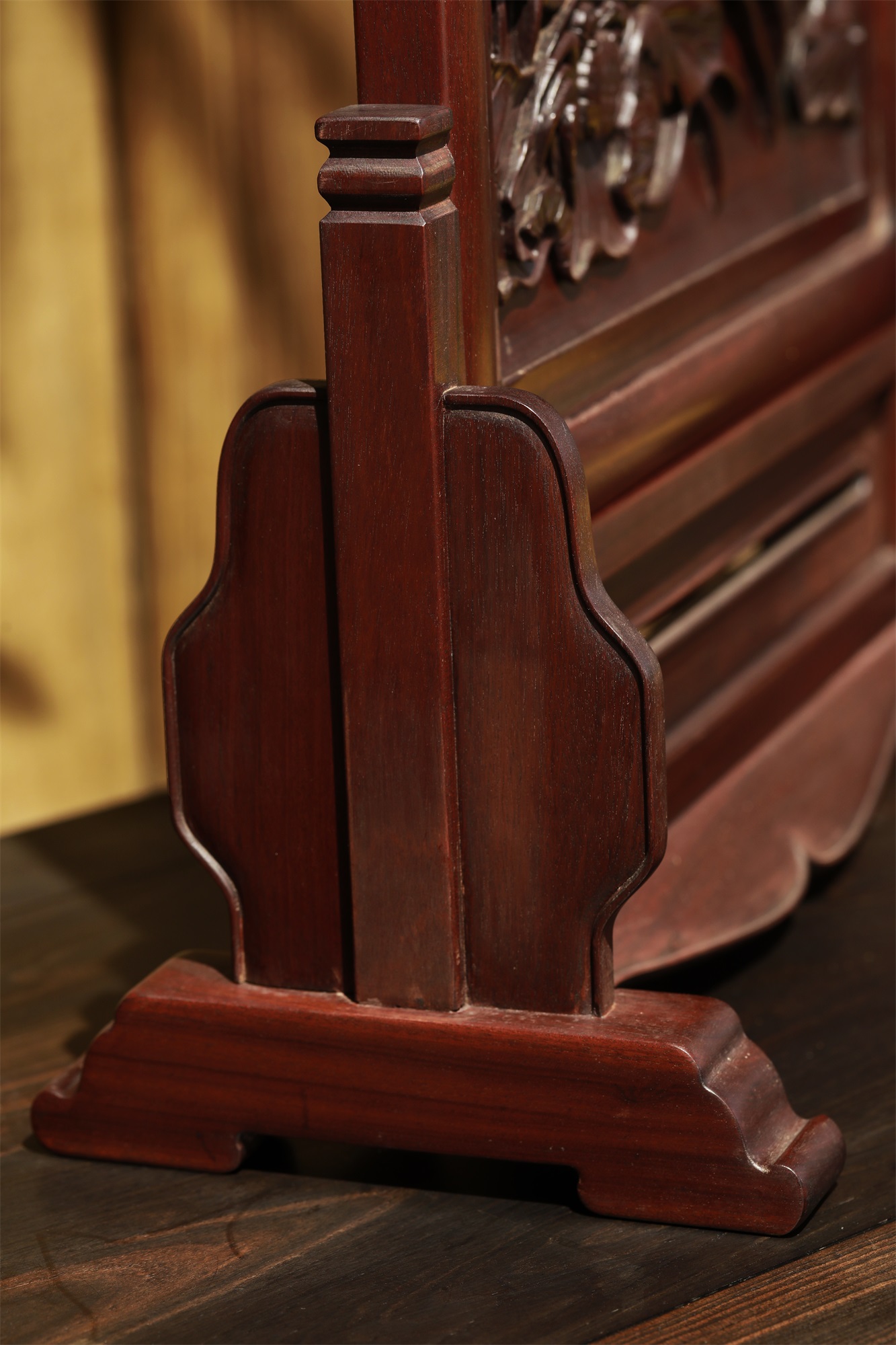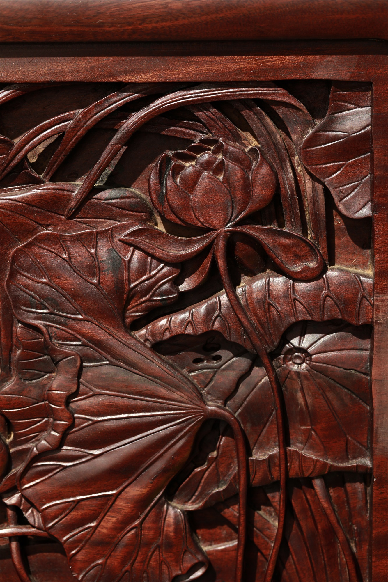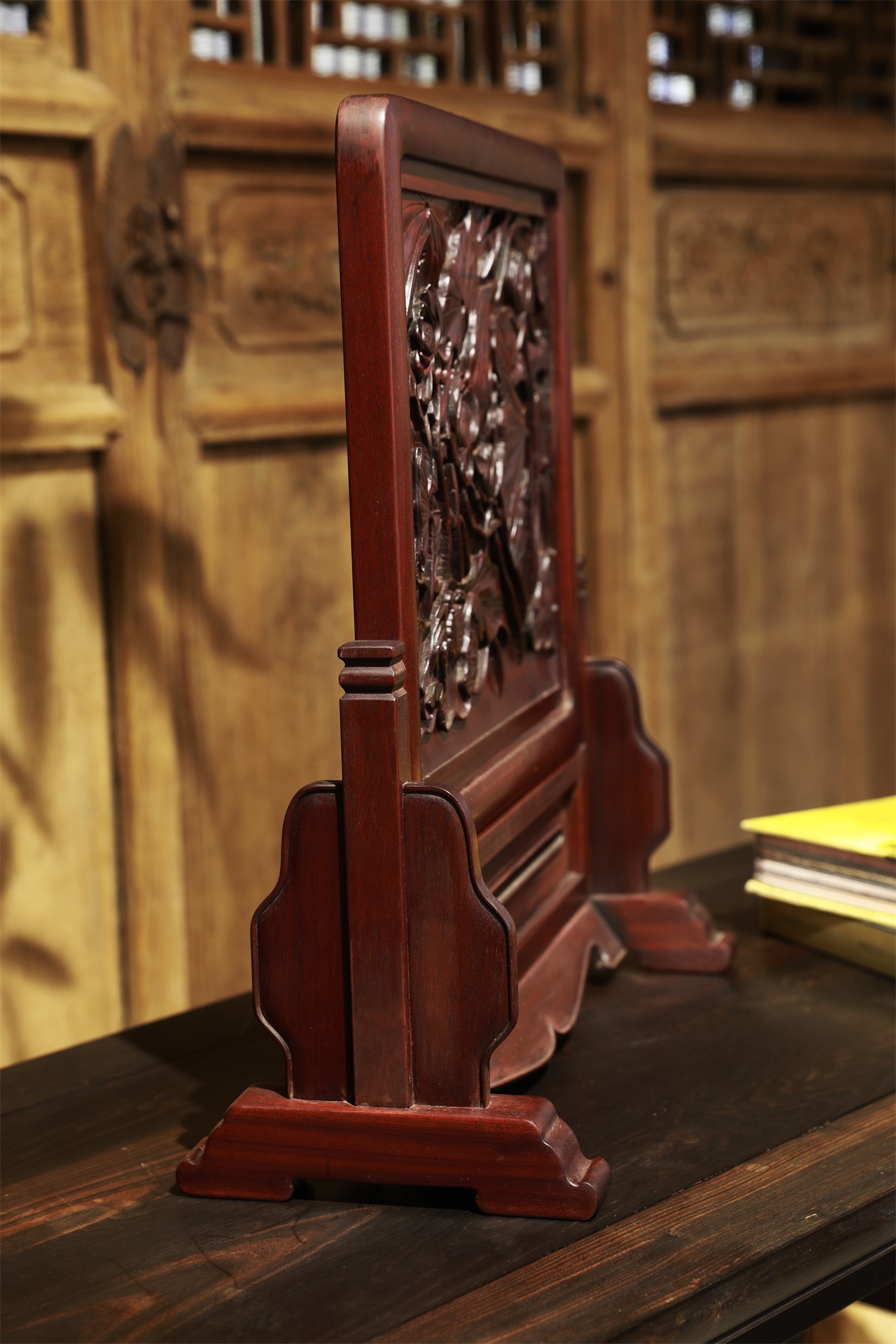 作品采用徽州传统手工艺雕刻而成。方寸间荷花枝干灵动,穿插有致,花与叶的层次、位置、穿插、向背,繁而不乱,显示出高妙的匠意。踞于荷叶上的小螃蟹成为构图的点睛之笔,刻划自然生动细腻,增添了画面的趣味。荷花、螃蟹均为中国传统的吉祥图案。“荷”“和”谐音,赋予荷和气、和平、祥和、和合、和好的美好寓意。也承载了文人墨客的生活情趣和人文情怀。